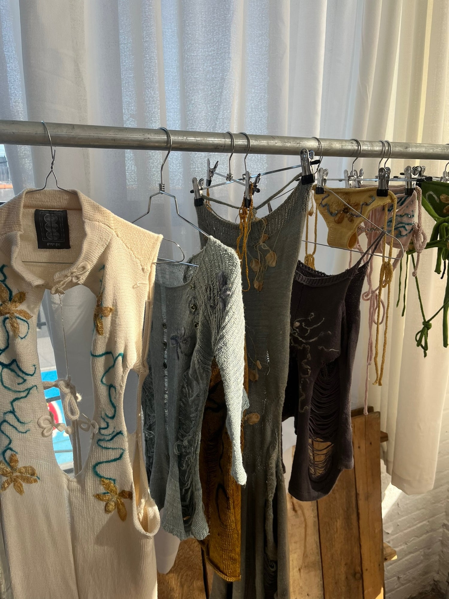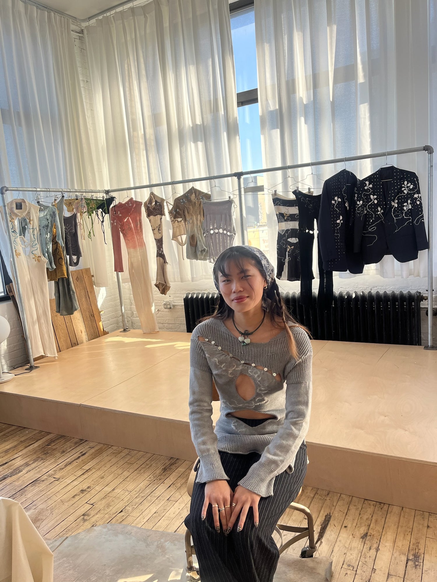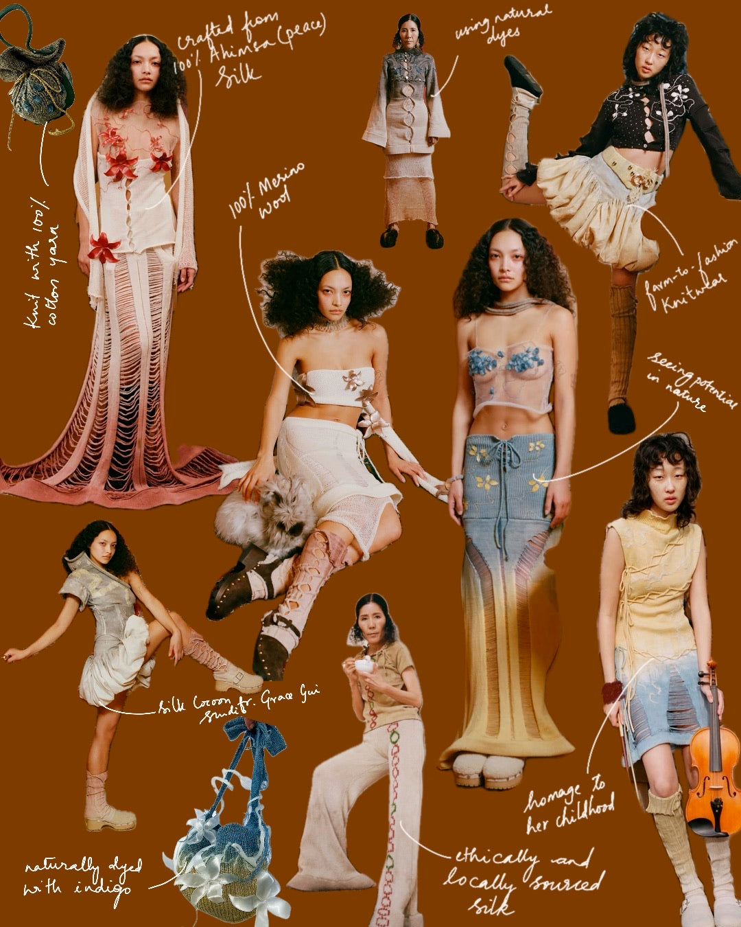 We had the chance to visit Grace in her Bushwick studio in 2023, just ahead of her NYFW debut. She walked us through her new collection and her process with a quiet confidence, explaining that her aim was never to follow the expectations of others, but to create pieces that felt deeply authentic to her. Each garment was naturally dyed, layered with memory. Grace shared an anecdote from her childhood in New Jersey—how her grandmother once raised silk cocoons, taking her to Costco and then gathering mulberry leaves from nearby trees to feed the silkworms until they spun themselves into tiny cocoons. Her grandmother even used them in beauty rituals, pressing silk threads to her face. This memory became a touchstone in Grace’s practice, inspiring her to raise silkworms herself and weave them into her work. The collection drew heavily on her upbringing around farmland in New Jersey, blending those roots with her cultural identity while challenging the narrow ways the internet often perceives Chinese Americans. What emerged was a body of work both intimate and radical—knitwear that resists stereotypes and speaks instead to Grace’s own story of belonging.