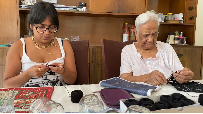 Some pieces are crocheted and knitted by hand between Shradha and Mallika (her maternal grandmother). They both collectively work on every crocheted piece between Delhi and New York. A continued partnership of 6 years, Fida Hussain continues to sew all your patchwork shirts in Delhi, India.