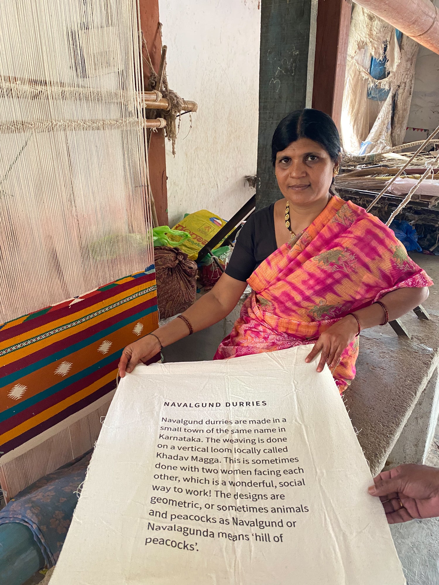 The story of how this craft began in Navalgund goes something like this - There was a wealthy man who overlooked everyday social and civil issues of the town, Navalgund. During his marriage, the bride's family had nothing to offer to the Son-in -law but just some dhurrie weaving tools. The man accepted the gift and with the knowledge of weaving his wife had, they began a small establishment where they taught the village women how to weave these dhurries that incorporate simple geometric shapes with bright saturated colors. Since then they have housed about 30 -40 women to weave these dhurries and continue to school the younger girls of Navalgund.