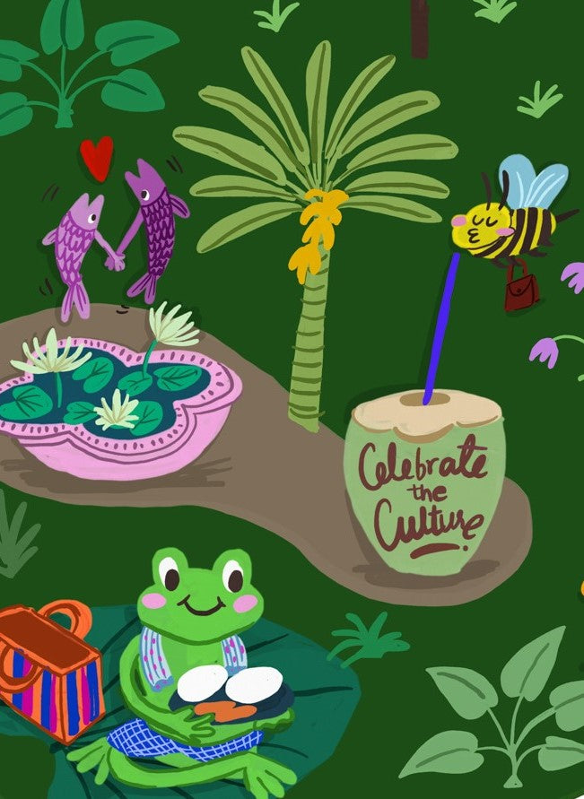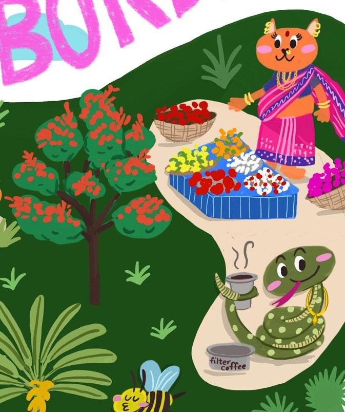 Giving so much warmth and possibly nostalgia, this artwork captures the essence of the city and its people, who find joy in the simplest of things. We have the Frog who is characterized to be a common village man, wearing a lungi and a towel around his neck, enjoying his idli on the road. The snake sips on a cup of filter coffee, the bee drinks his coconut water, two fishes have a romantic moment in the famous Cubbon Park style, the snail transports a fresh batch of marigolds and roses, the street cat characterized as a flower lady adorned in gold, and the crow flies to the market. This artwork is memorializing little moments of Bangalore, that we so fell in love with 🌼