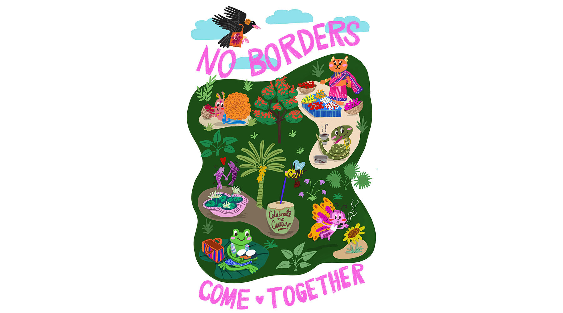 We created our first ever No Borders merch for our most recent event in Bangalore, India. A very special artwork made by Anjali Mehta as an ode to the garden city, a story we created, inspired by the city's local flowers, women, food, and its' garden creatures 🐸The artwork, if looked closely, is a vibrant flush of garden creatures carrying out their everyday hustles and being the most local Bangaloreans🌸