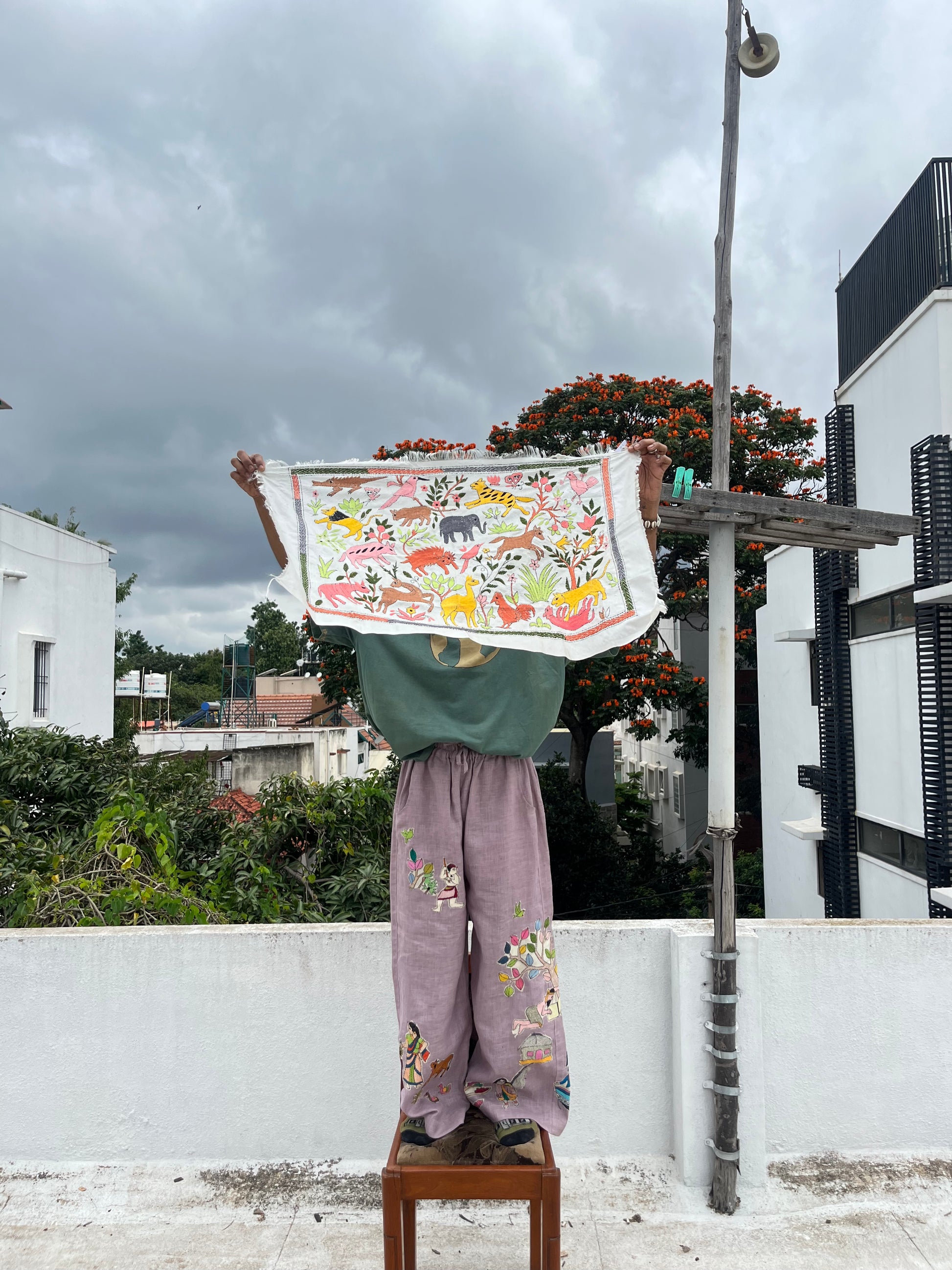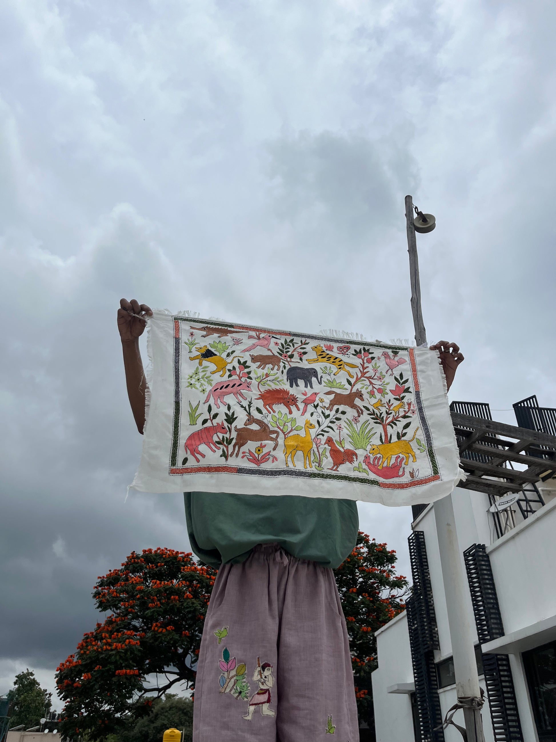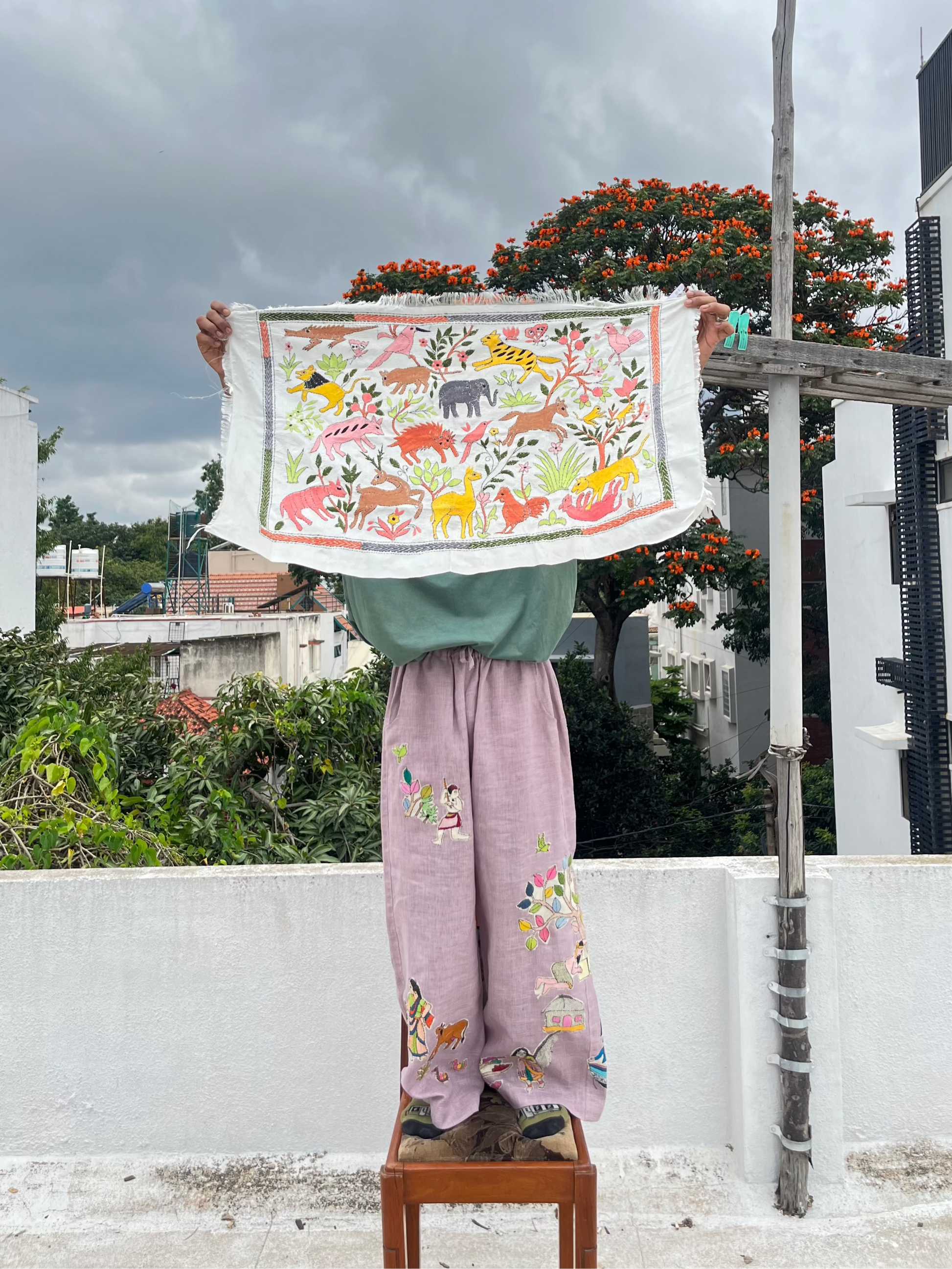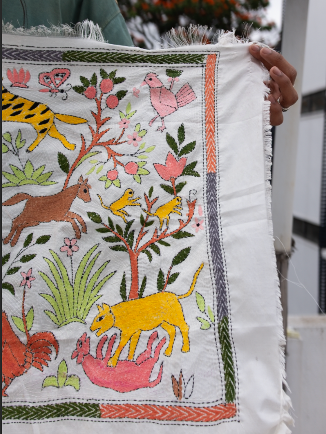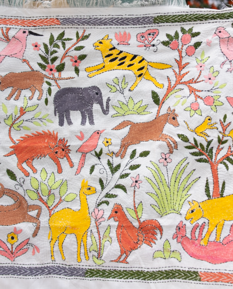 This Kantha tapestry scarf is handembroidered by Ajija from West Bengal, who continues a tradition where women embroidered old cloth with dreams, myths, and daily life.