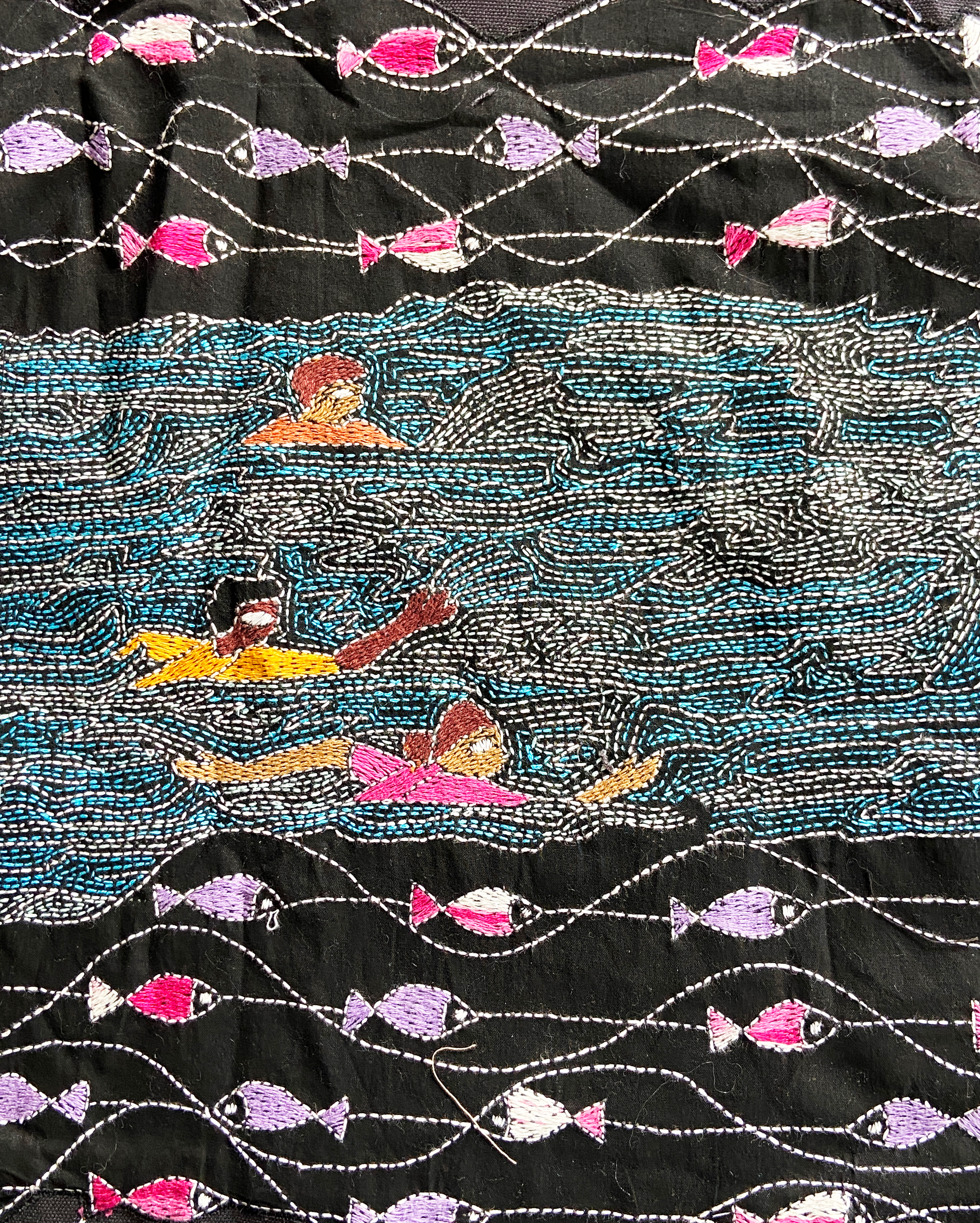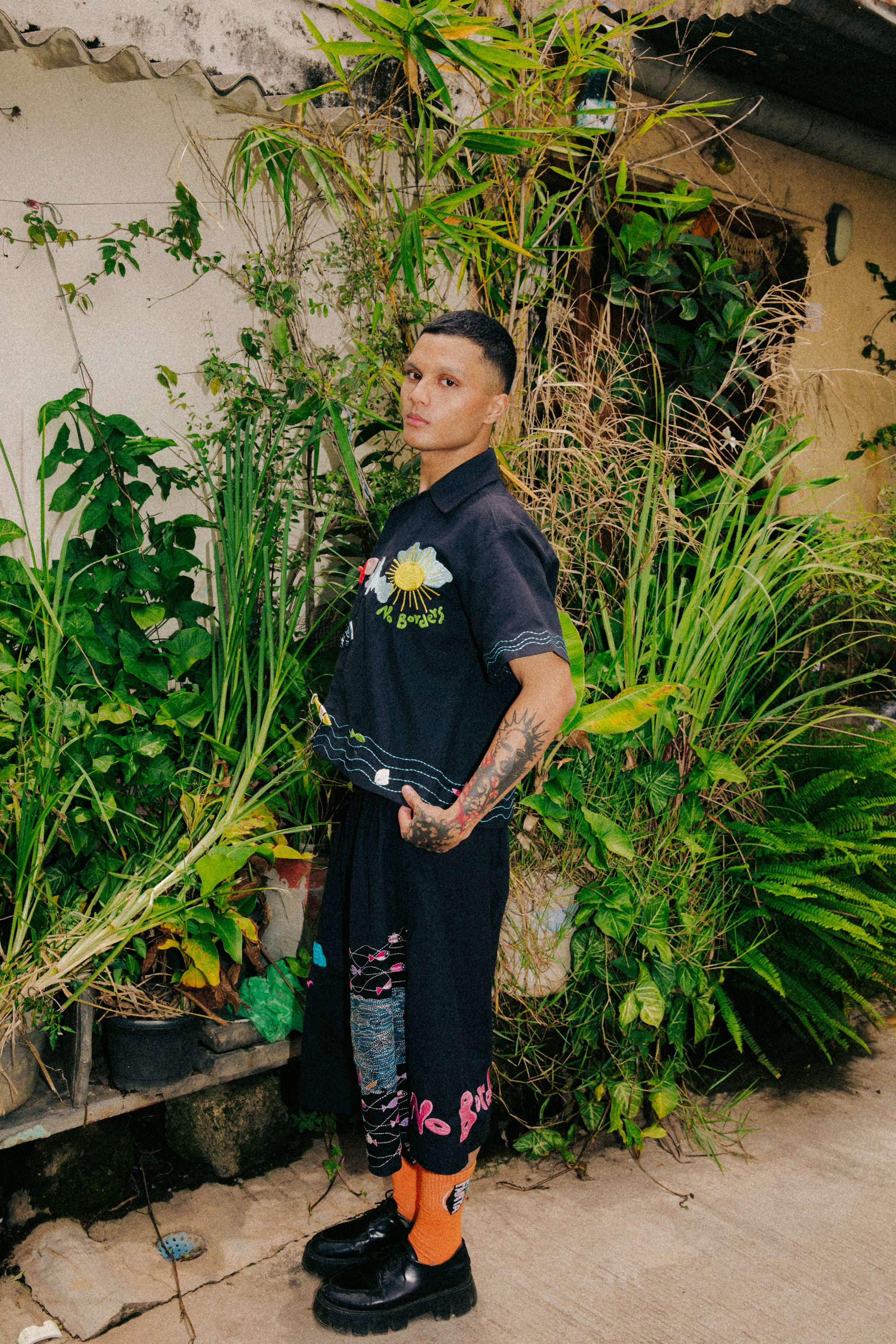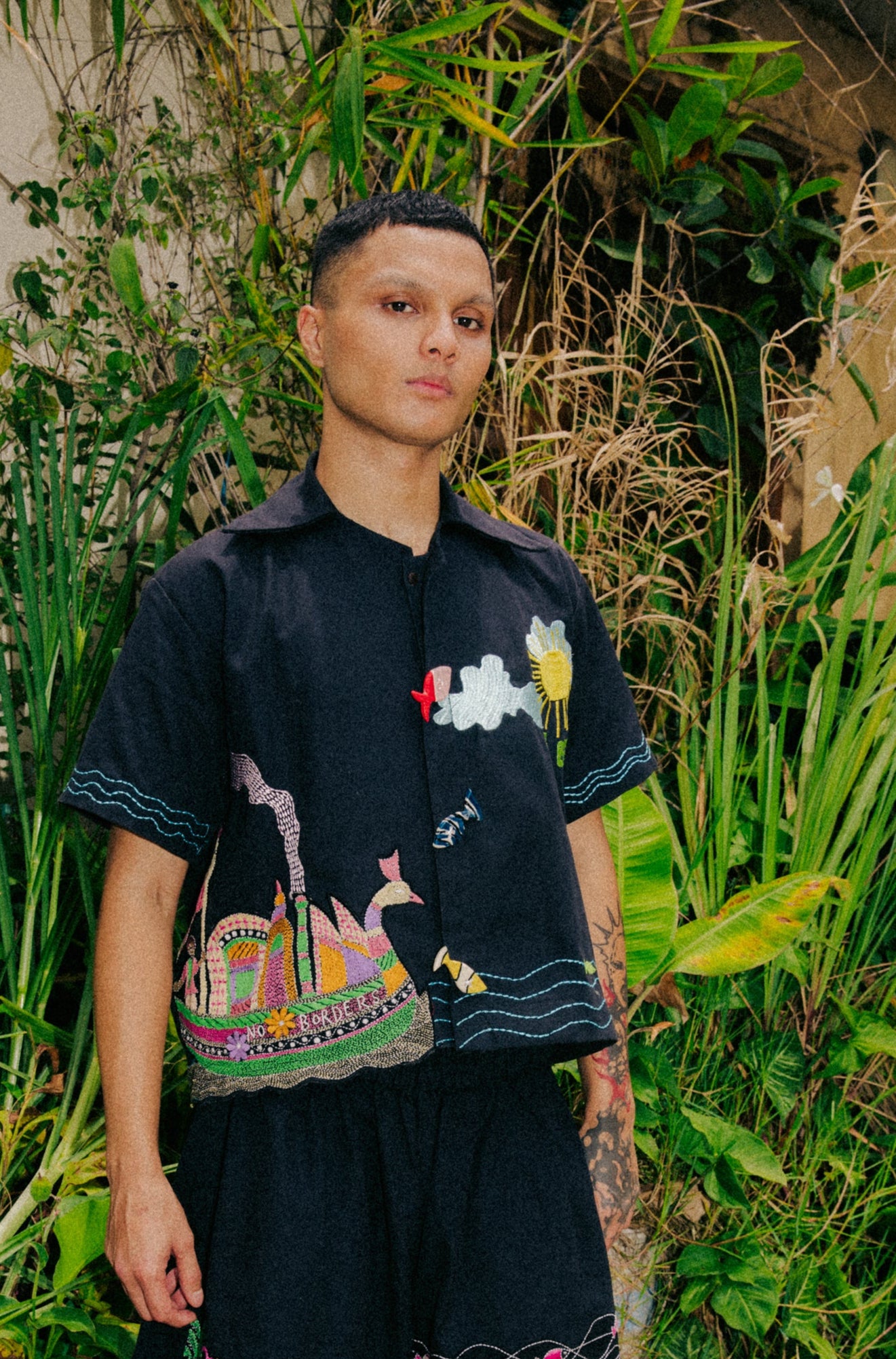 Hand-embroidered Kantha motifs capturing the joy of island life, coconuts, and local swimmers with a boat, celebrating Bengal’s rivers and lakes• Relaxed boxy crop shirt Relaxed oversized shorts • Playful, artisanal charm • Machine-embroidered lettering • Appliqué detail • Made in West Bengal