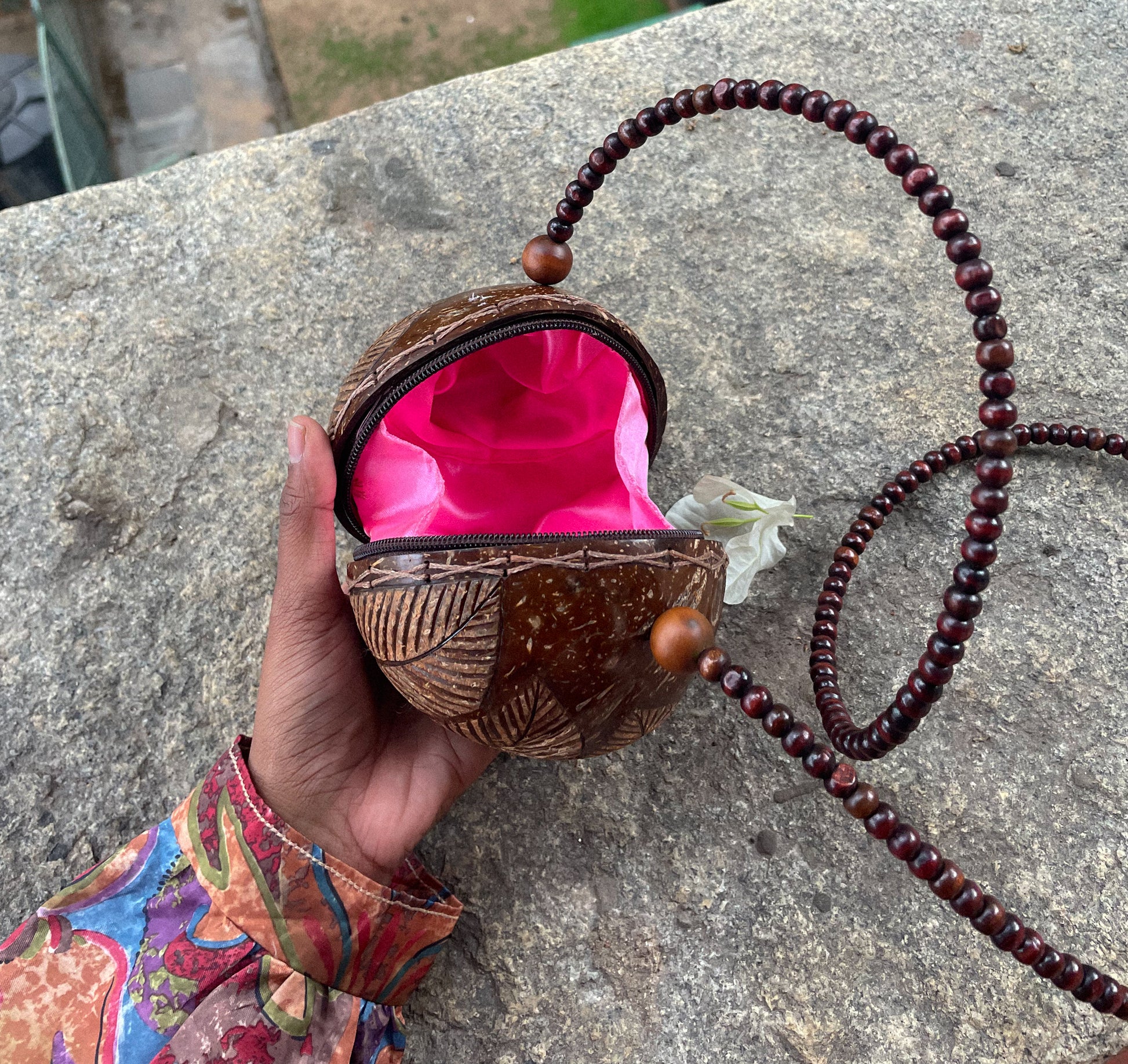 One-of-a-kind coconut shell mini bags, made using recycled coconuts. Bringing life to a part of the coconut that is usually considered waste and thrown out. With more than 45% of India’s coconut coming from Kerala, we only thought it to be best to work with the most local artists in villages of Kerala, to make turn waste into highly-crafted & and- carved coconut bags, and tell their stories to the world.