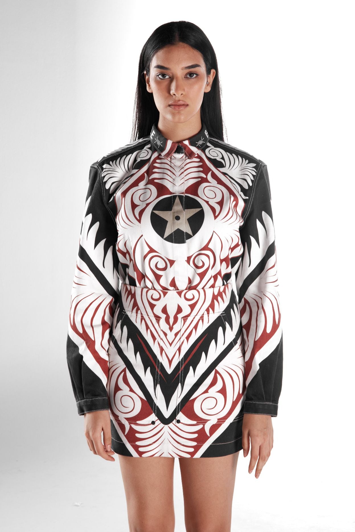 Unisex long sleeve non-stretch, fully printed RTD/ denim shirt "BIE Coat of Arms" digital print all over. Hidden press buttons on the front.