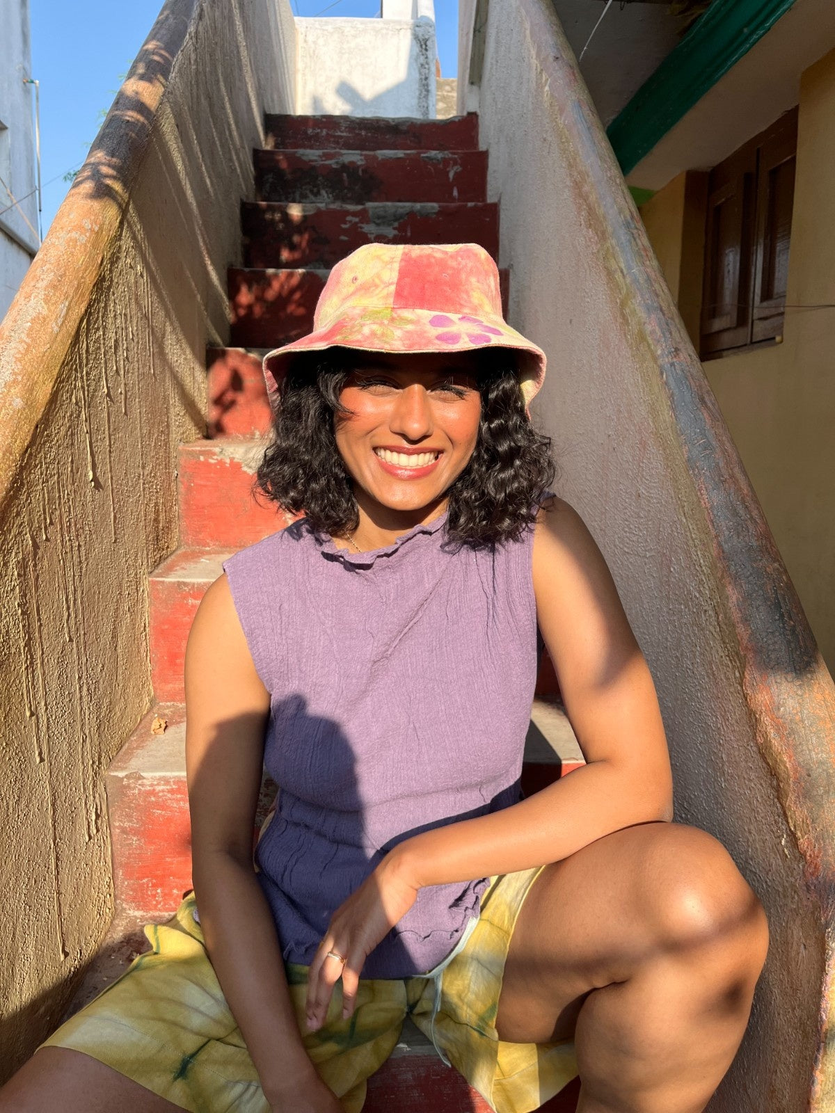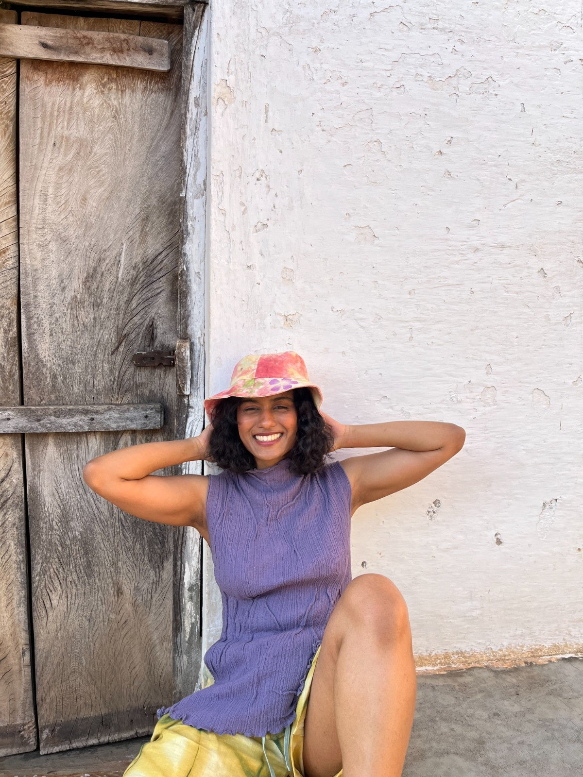 Genderless bucket hat, dyed using plant extracts imprinted with real flowers from Kokun's garden