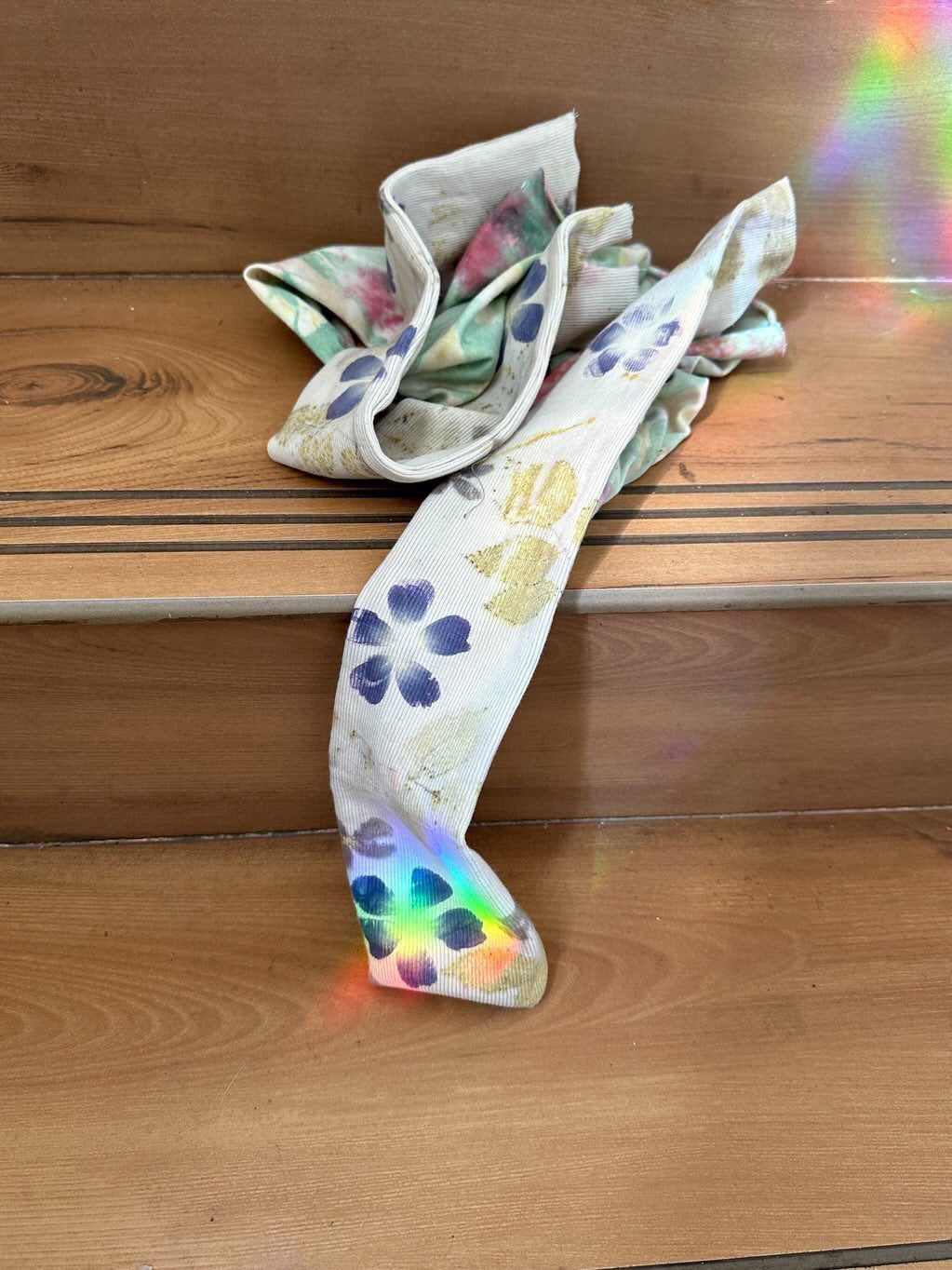 Fingerless gloves, eco-printed with real flowers from Kokun's garden.
