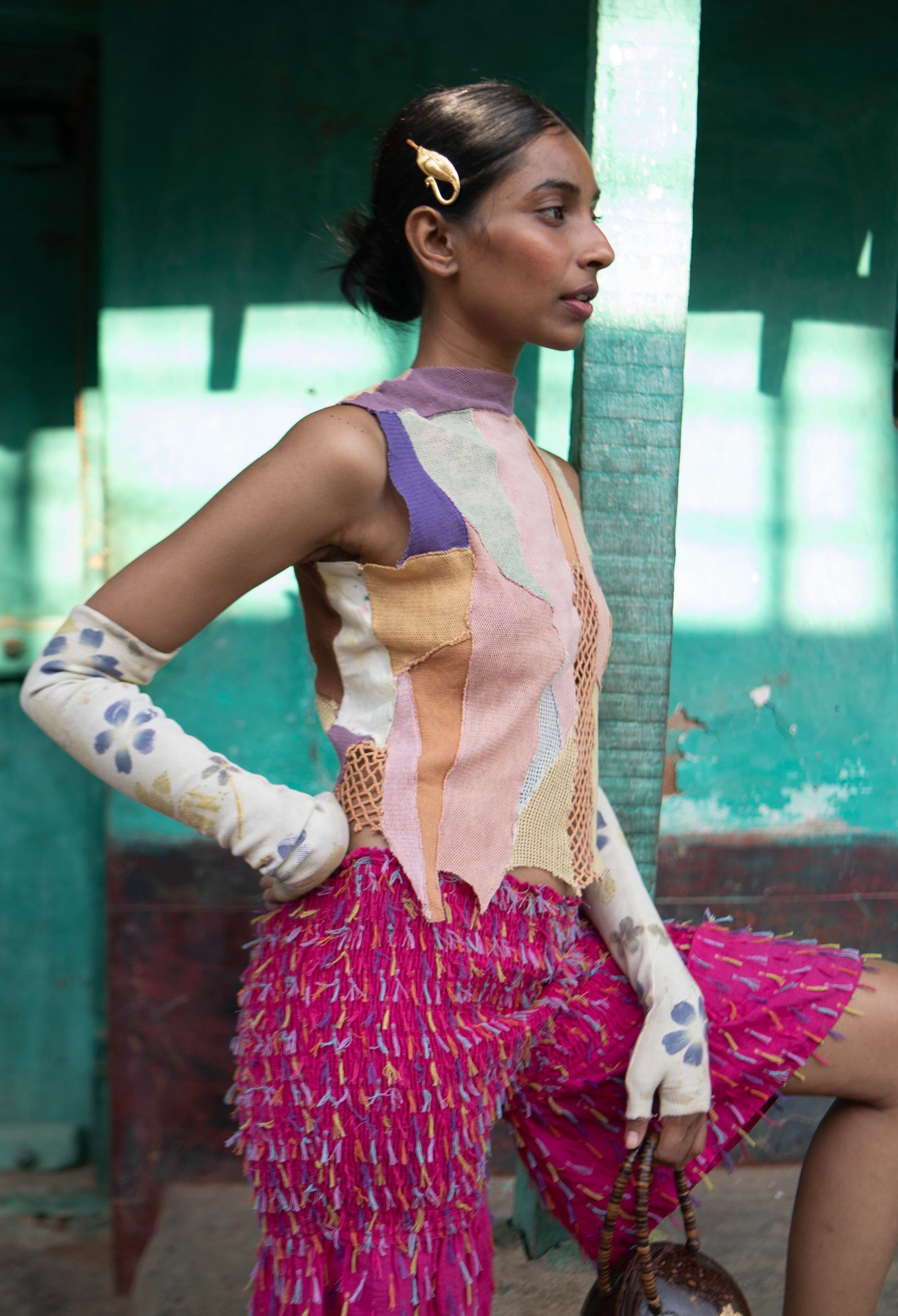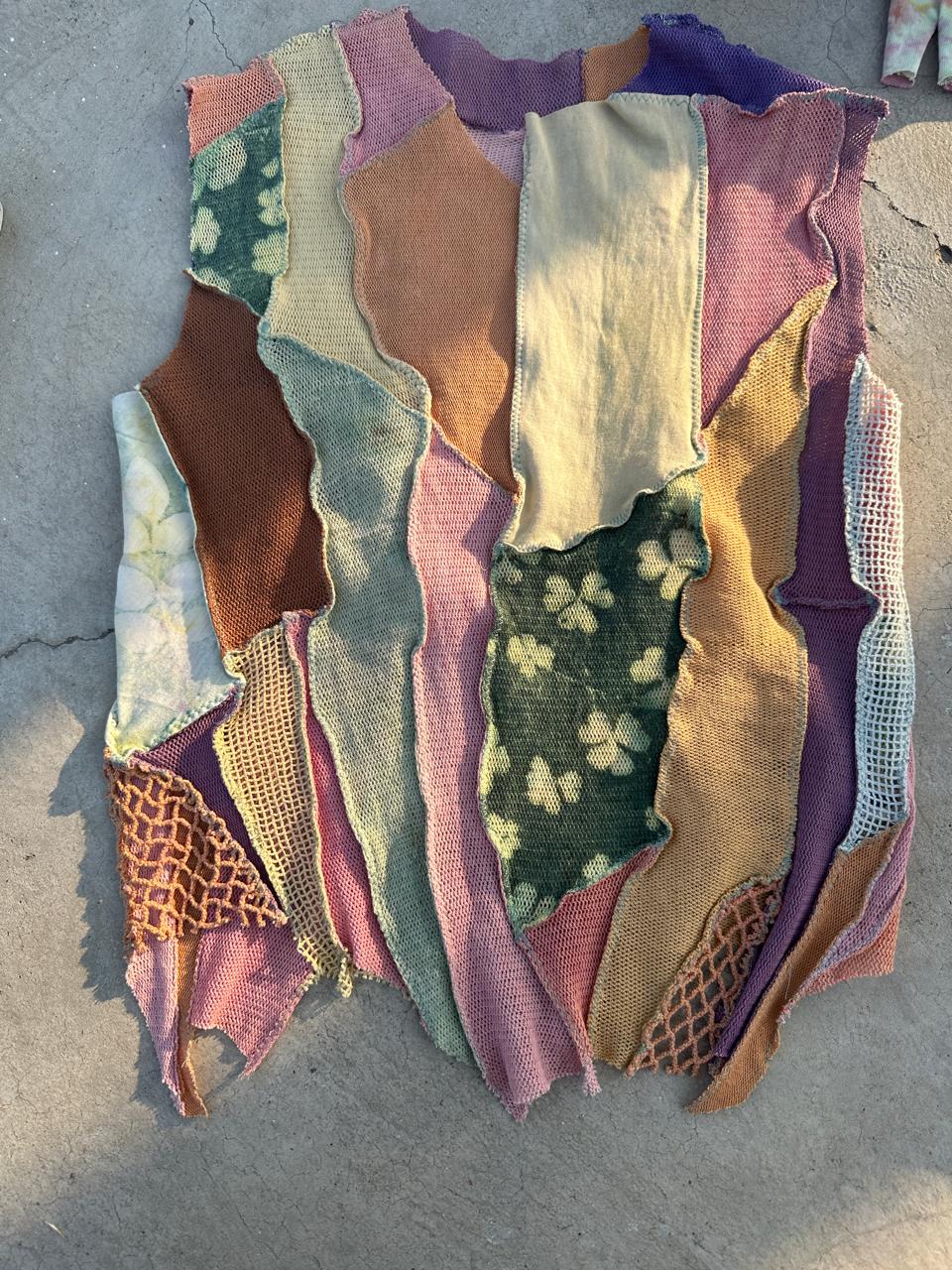 A kaleidoscopic of spring on this stretchy knit blouse. Bringing together varied plant dyed pieces of fabrics together to create a one-of-a-kind blouse.