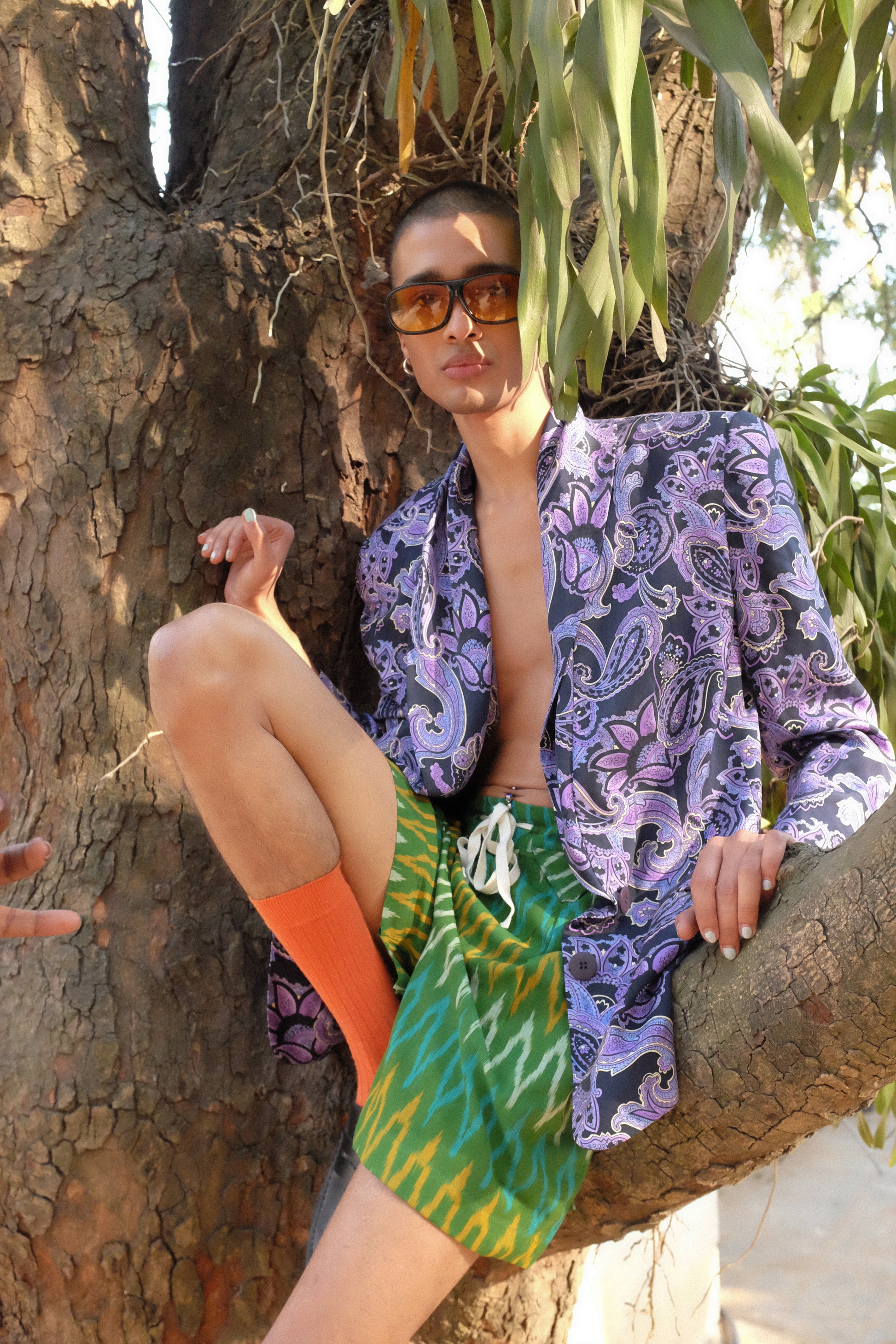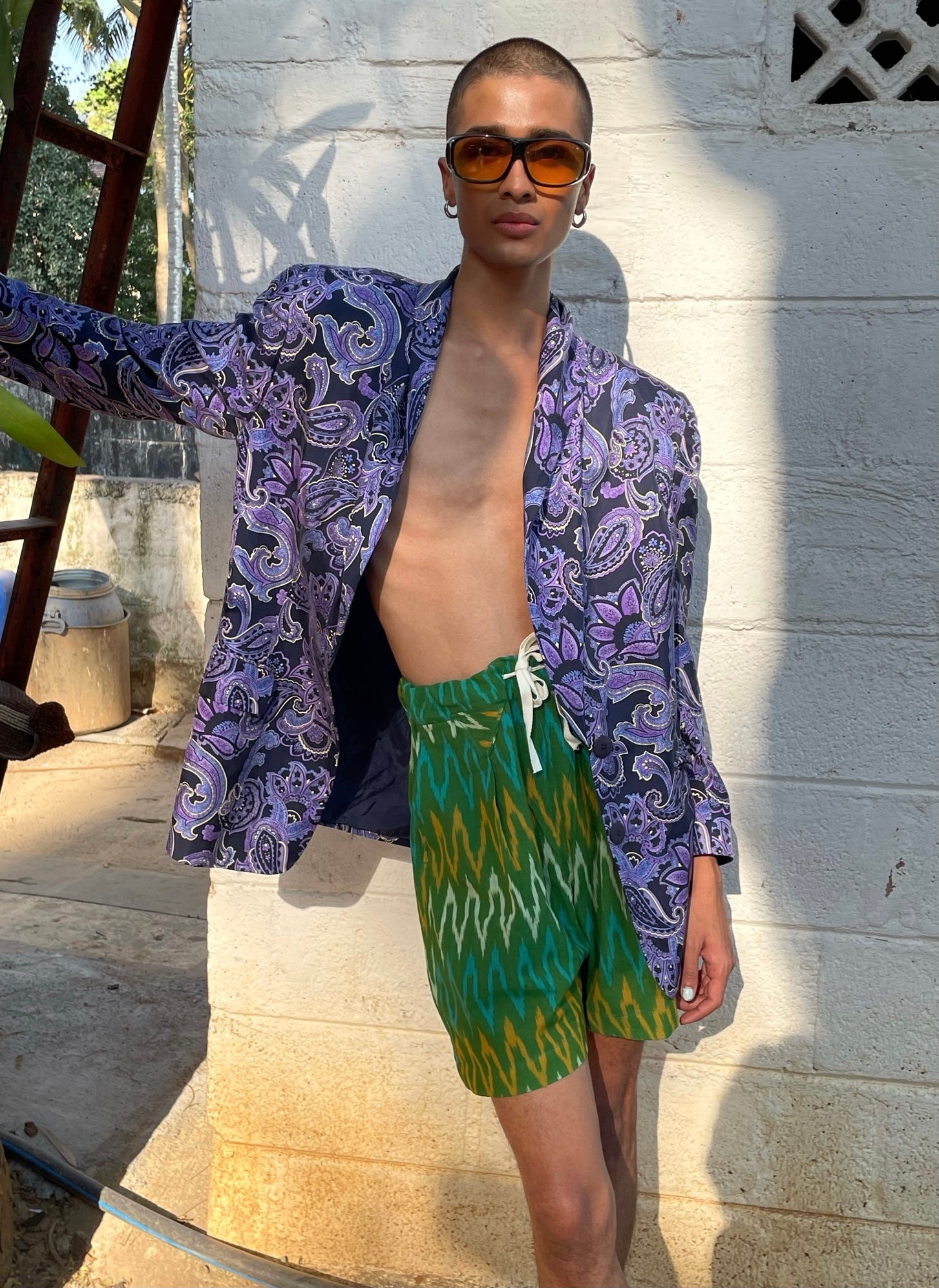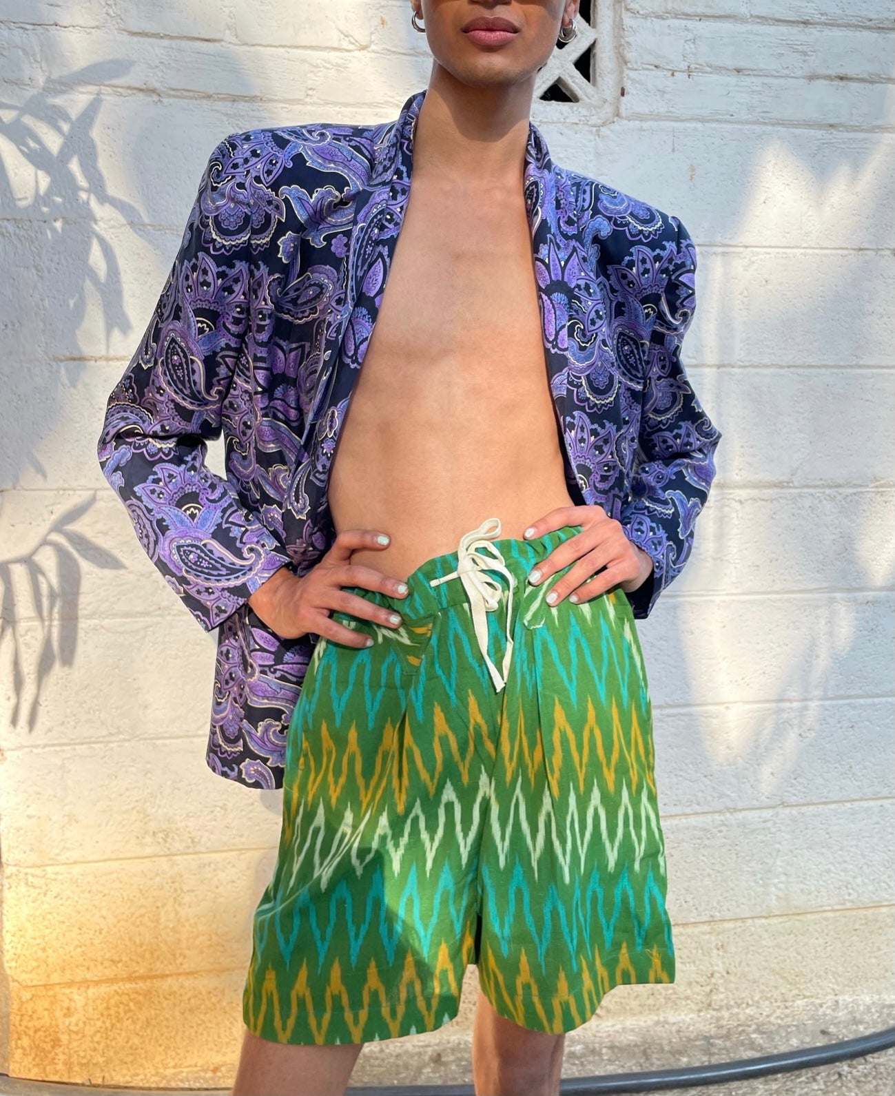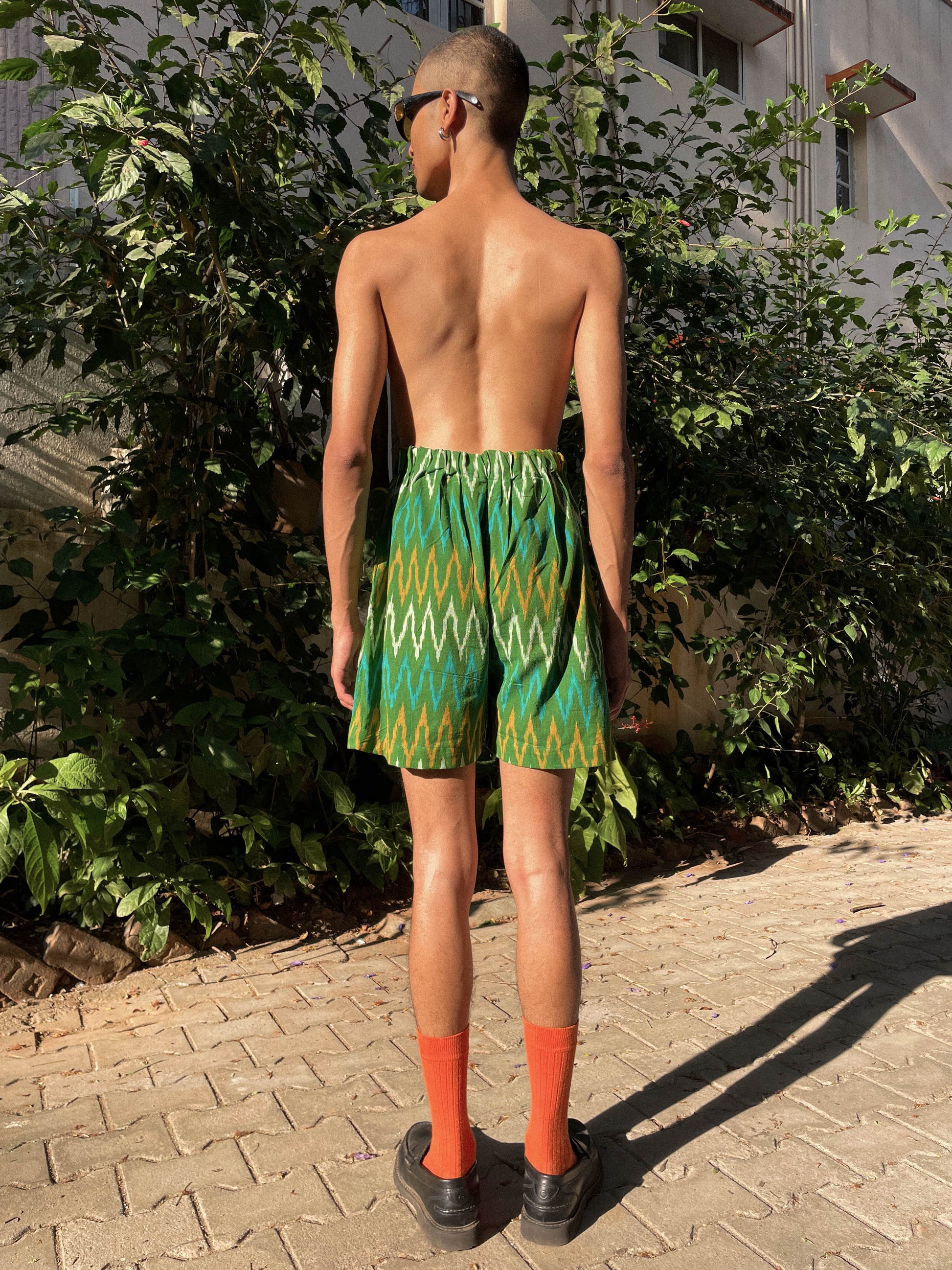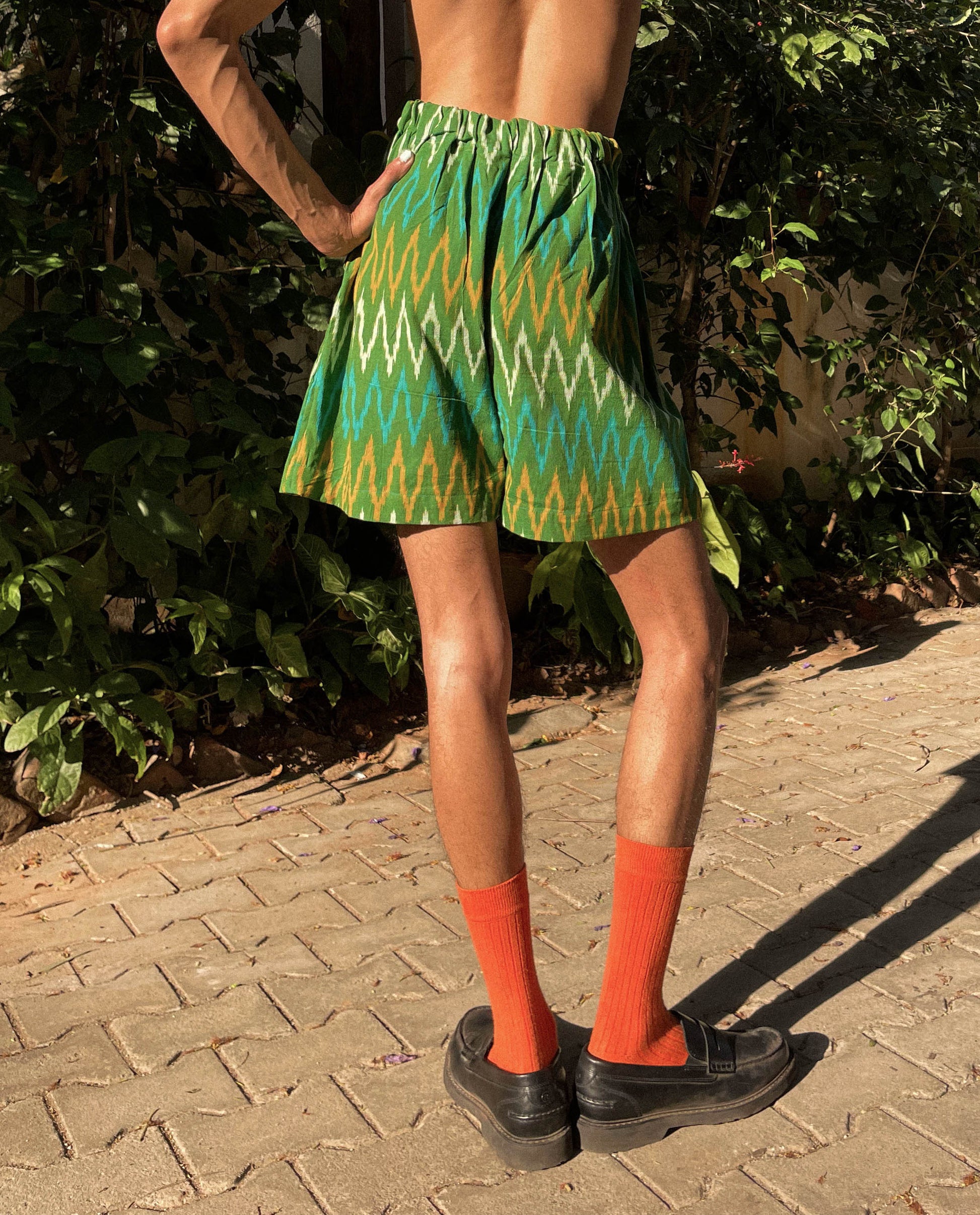 Green Ikat Sizeless Shorts for this summer season that is about to kick off. It can fit all sizes from extra small through large with a mechanism and pattern that we have developed. Have the summer of your life and drift off into the sunset knowing you are supporting the artisans in Telangana. Super light and airy, but a statement nonetheless! It’s oversized, boxy, and unisex; hand woven and dyed with love by artisans in the state of Telangana. It pairs beautifully with our Ikat shirts, creating a dance of patterns.