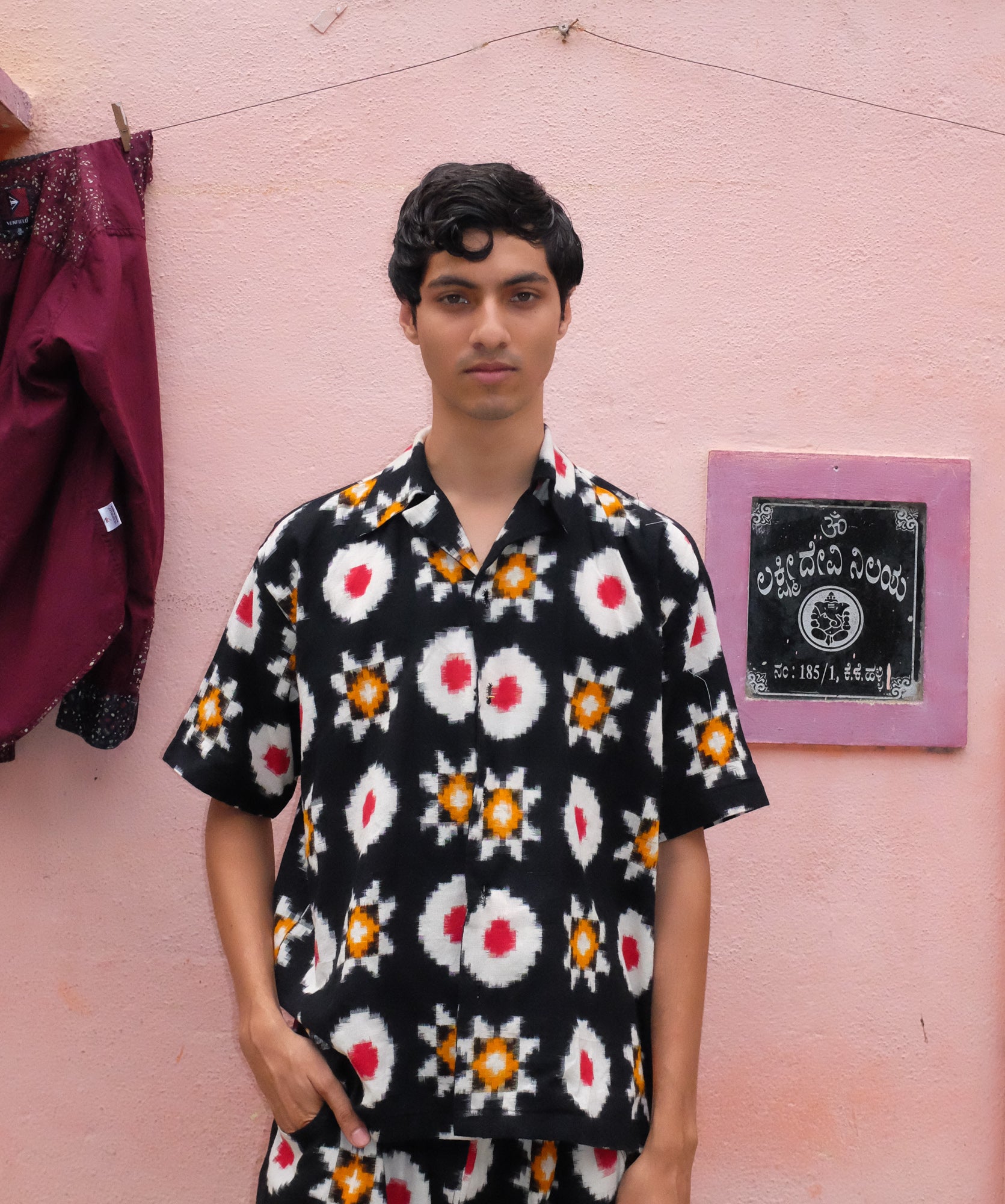 Embrace the blend of tradition, creativity, and style with our Bindi Shirt in Double Ikat. A perfect addition to your summer wardrobe, it promises both comfort and a standout look.Details - Black Cotton Ikat Oversized shirt with a boxy fit and notched collar for a relaxed look.
