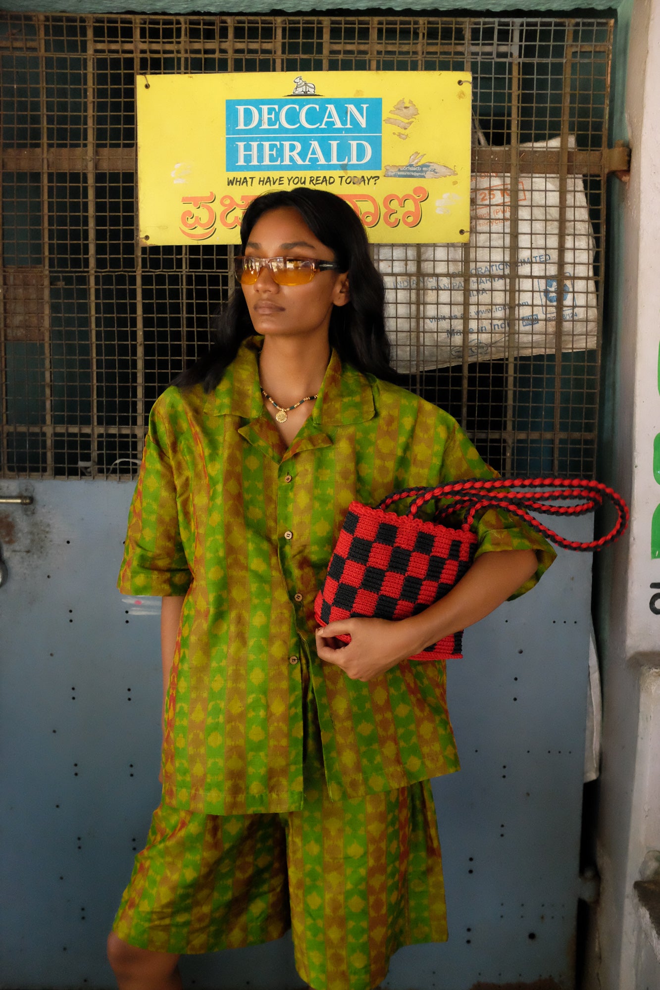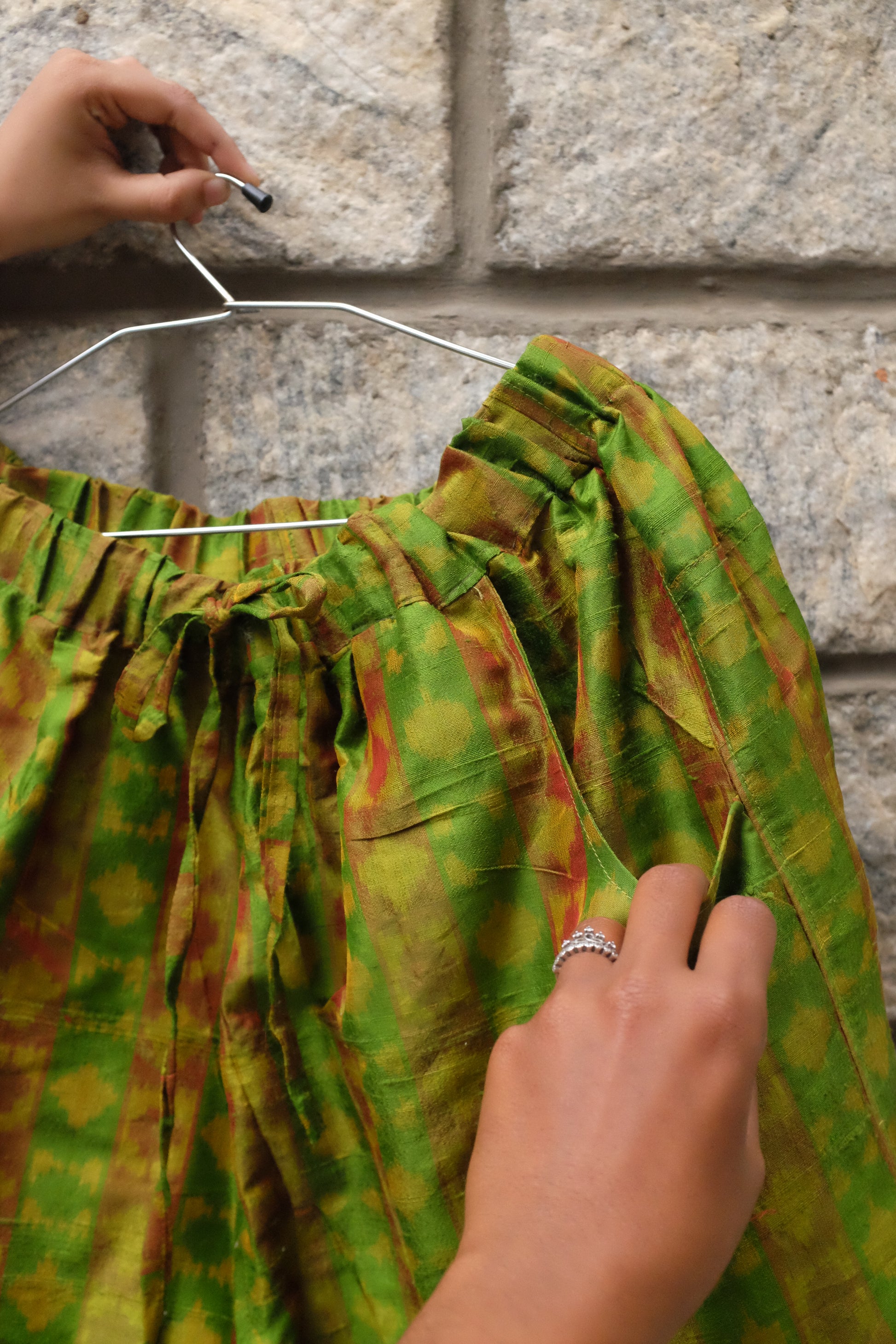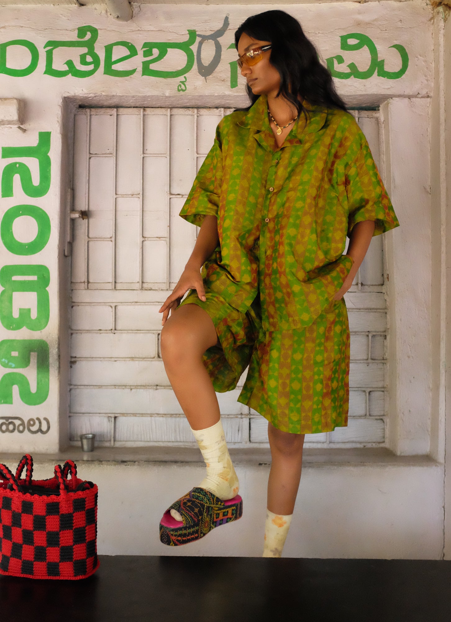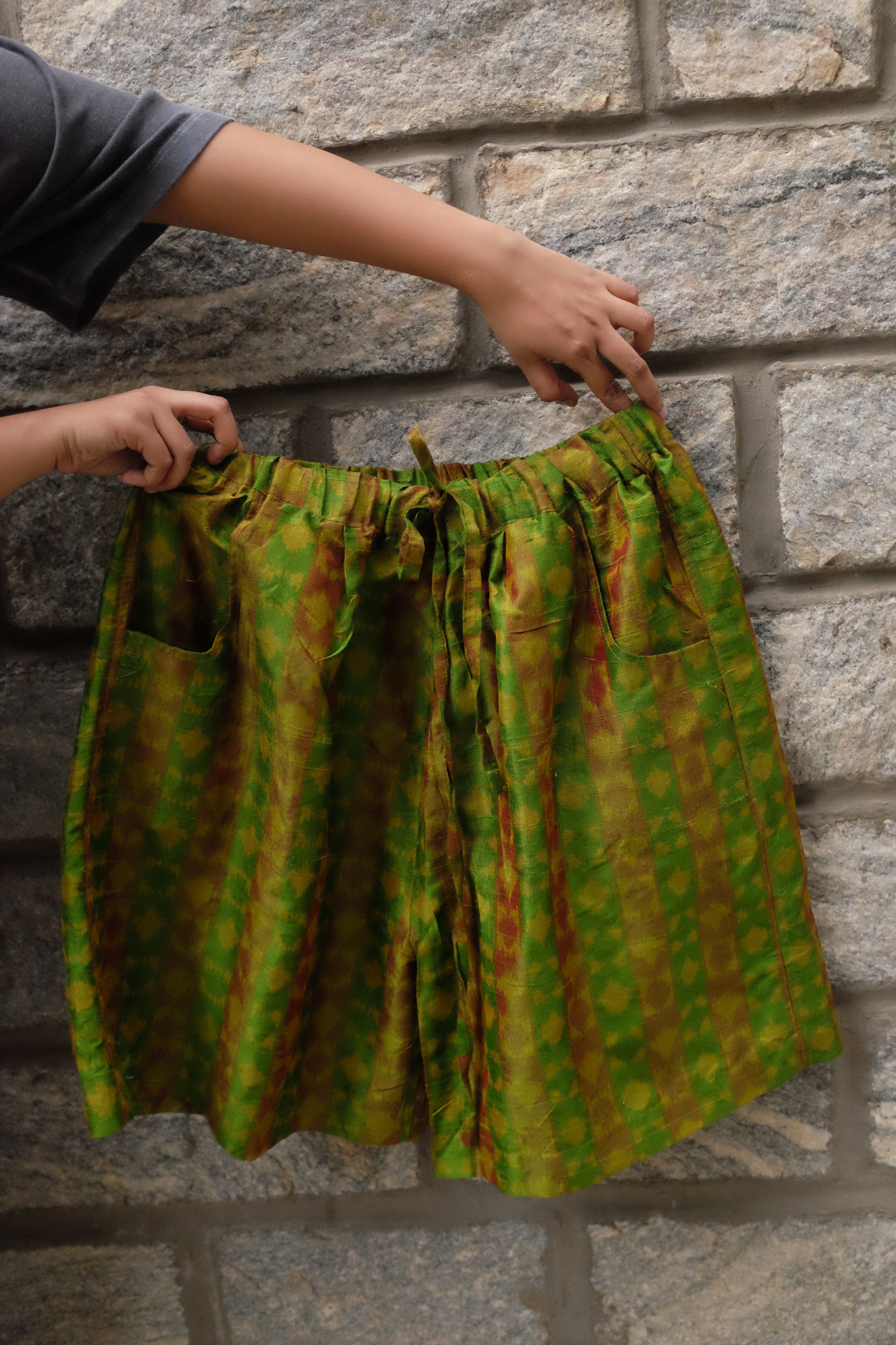 Step into elegance and feel like royalty with our beautiful Raw Silk Shorts, crafted in stunning shades of green and brown for a captivating mélange effect. With its raw hand feel and subtle shine, these shorts are perfect for those special occasions when you are the main event 😘😍 Made with the single Ikat technique, this fabric is woven with meticulous care and love by our talented artisan Chandana. 🎀