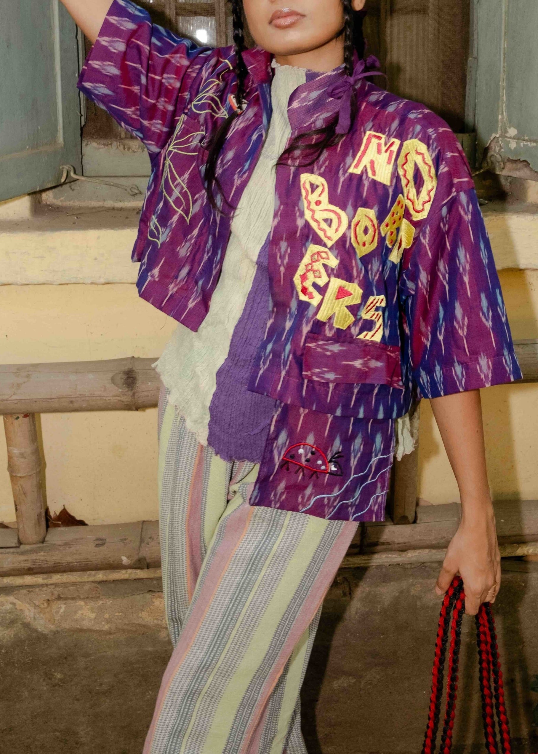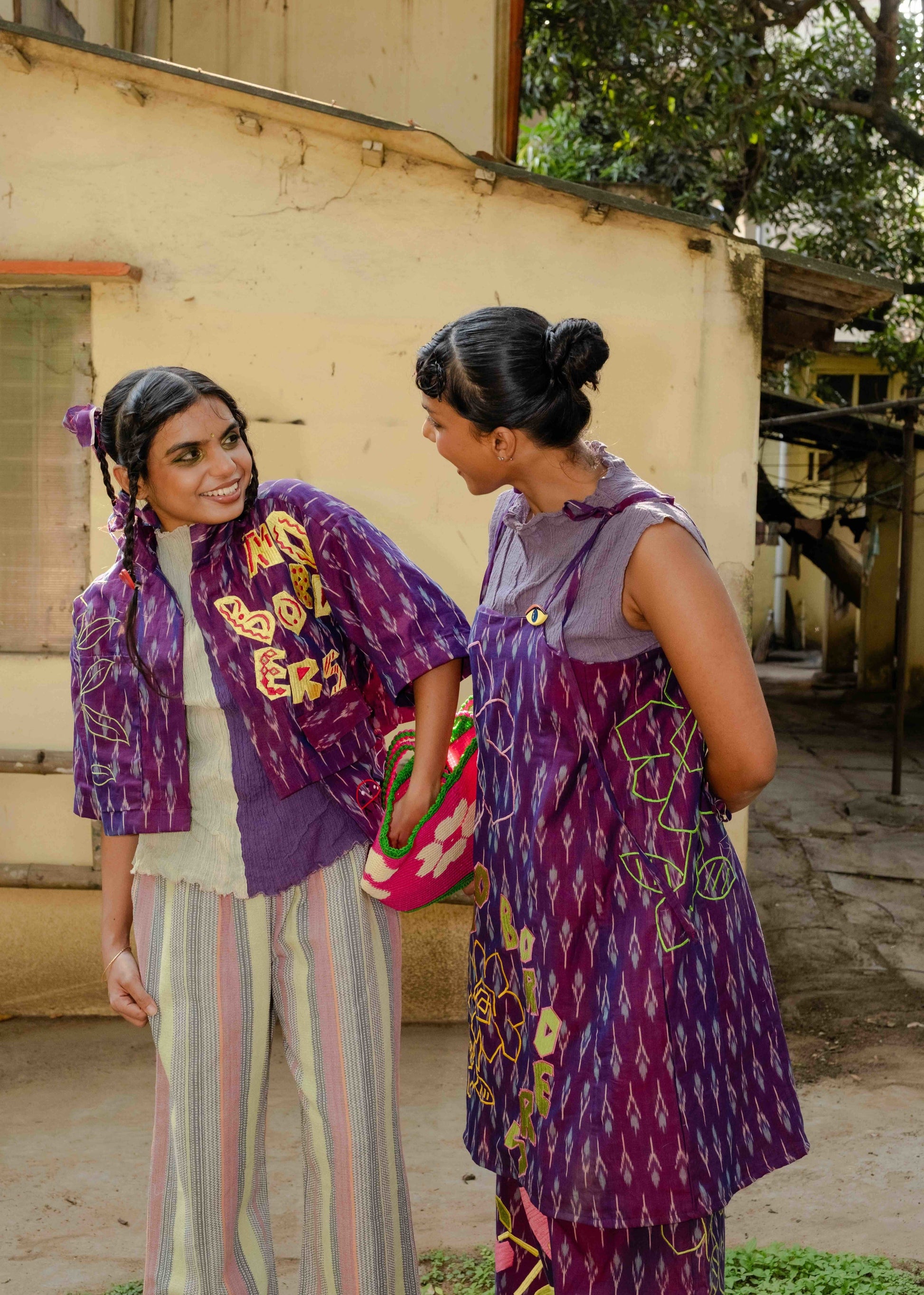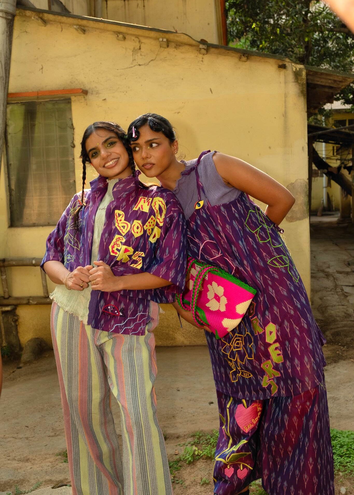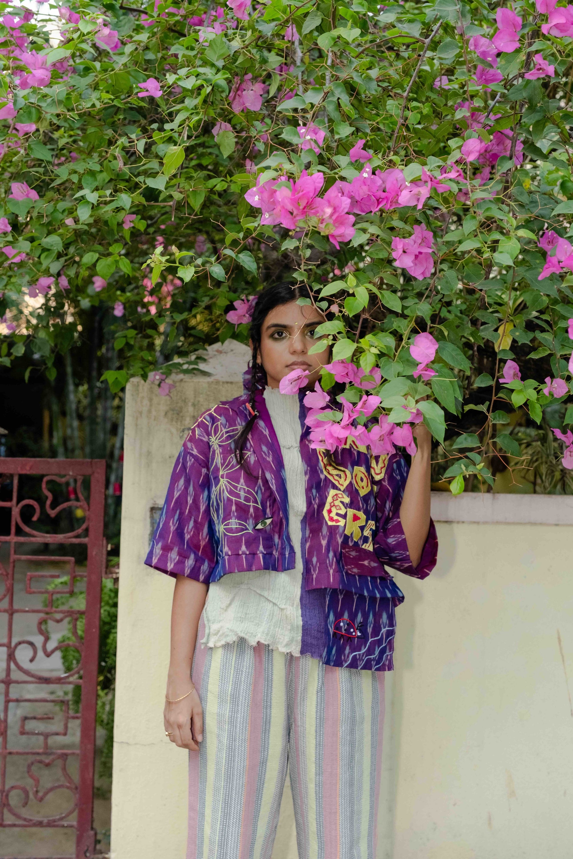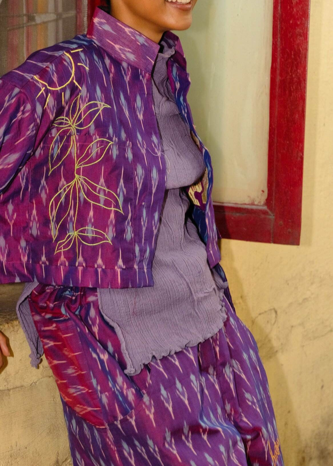 Our "Let Love Grow" Ikat crop shirt, is a burst of playfulness & craftsmanship. Creating stories via embroidery on this delicate single-weave ikat fabric creating a stand-out look with a fun, cheerful summer vibe.