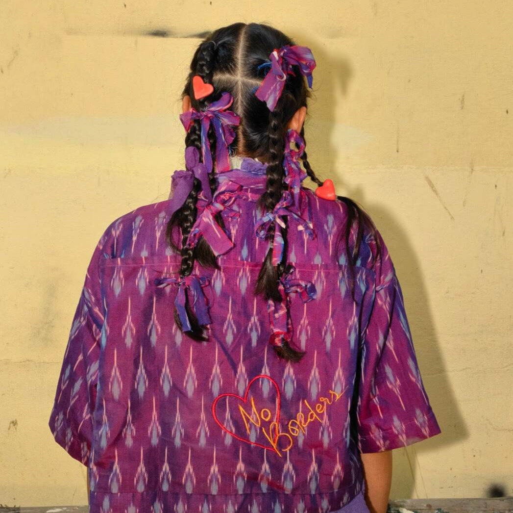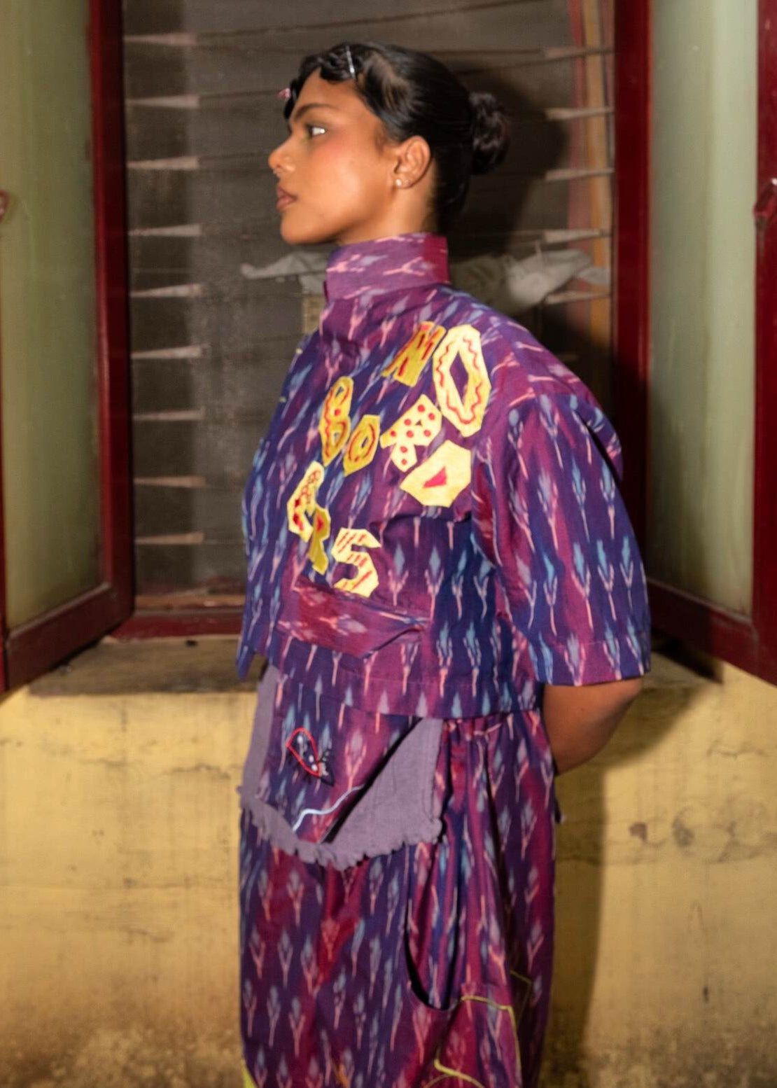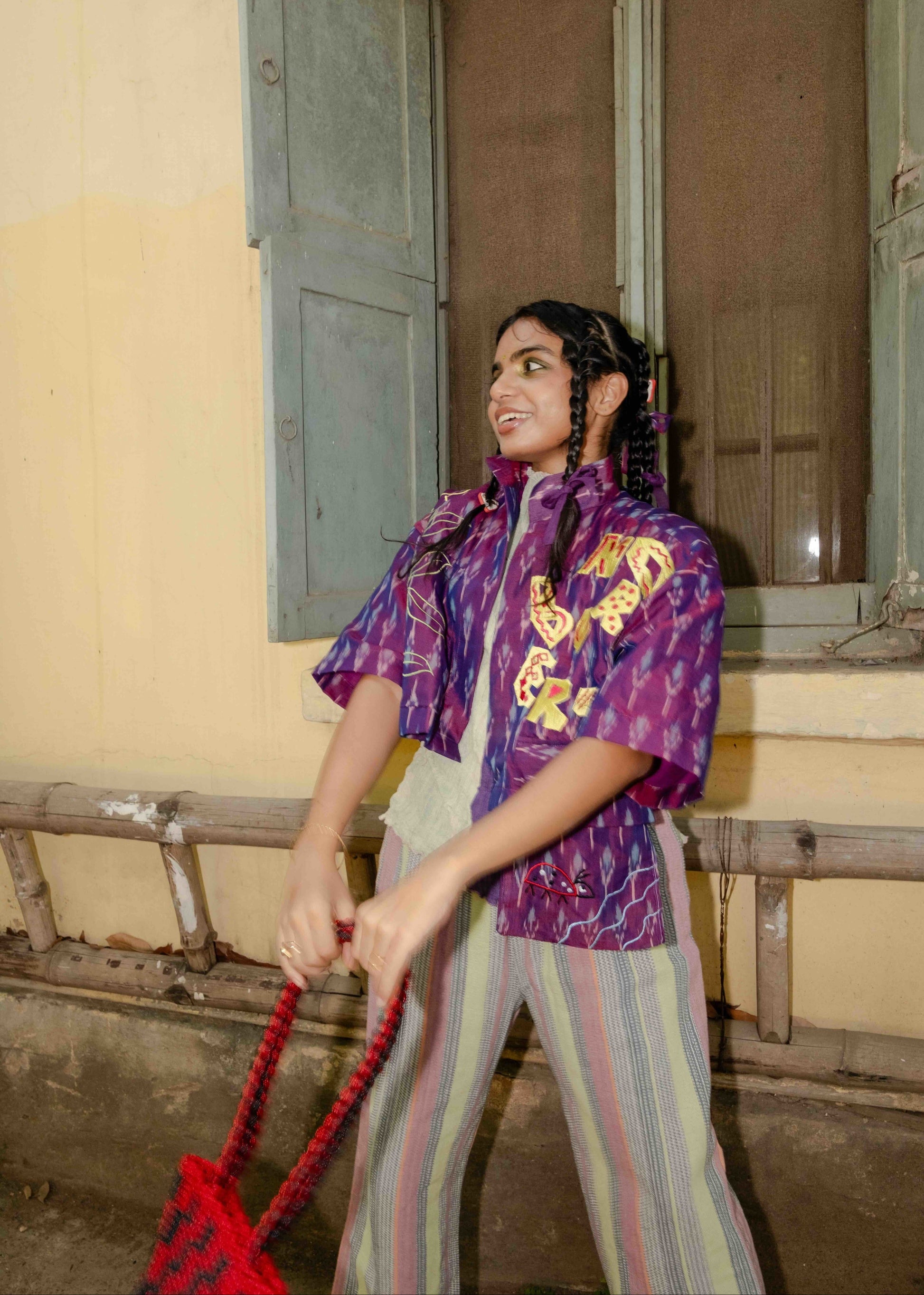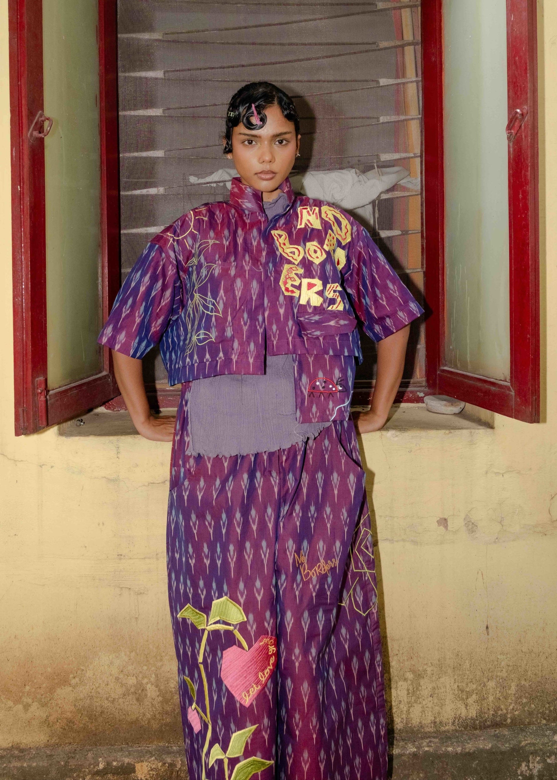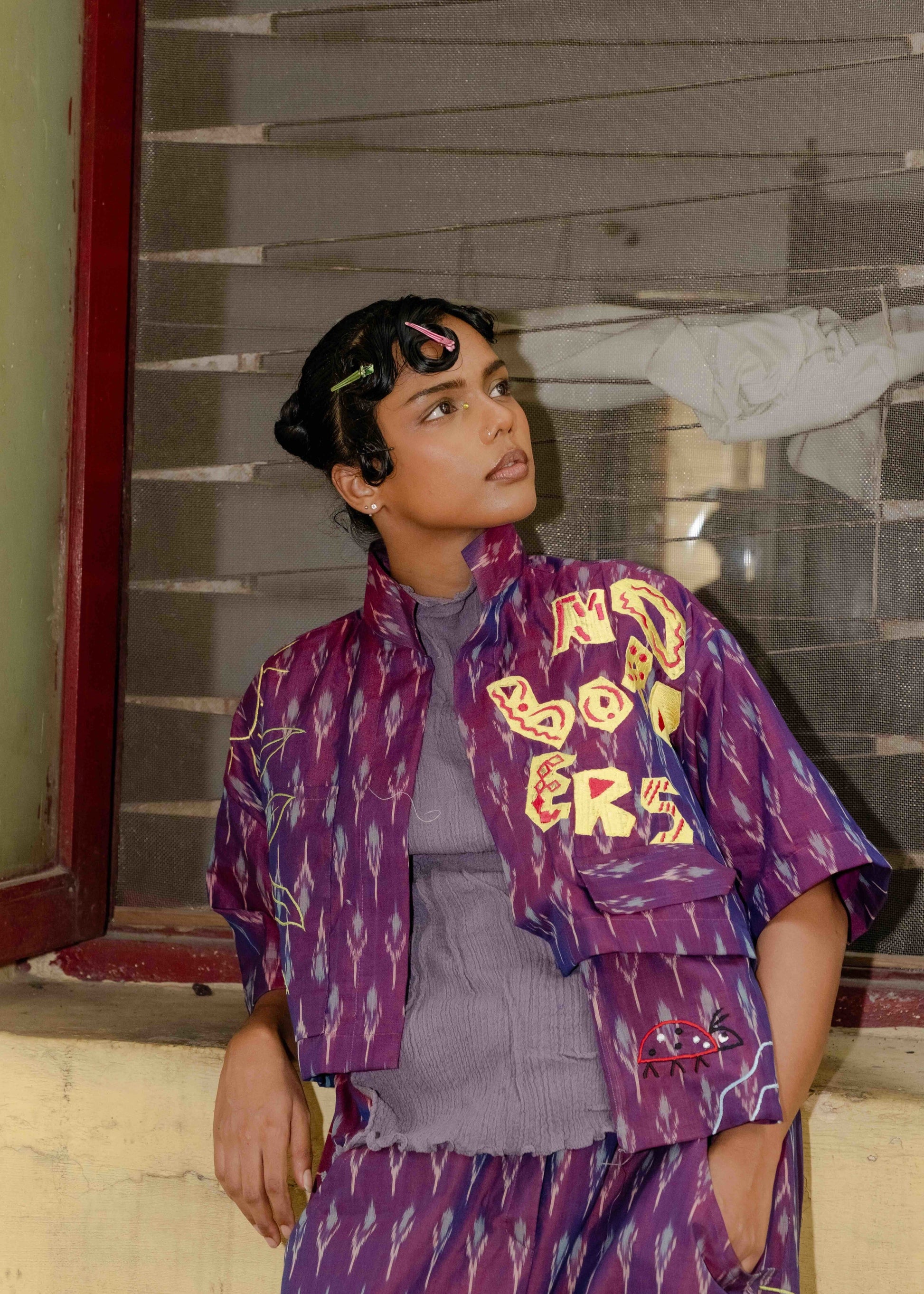 Our "Let Love Grow" Ikat crop shirt, is a burst of playfulness & craftsmanship. Creating stories via embroidery on this delicate single-weave ikat fabric creating a stand-out look with a fun, cheerful summer vibe.