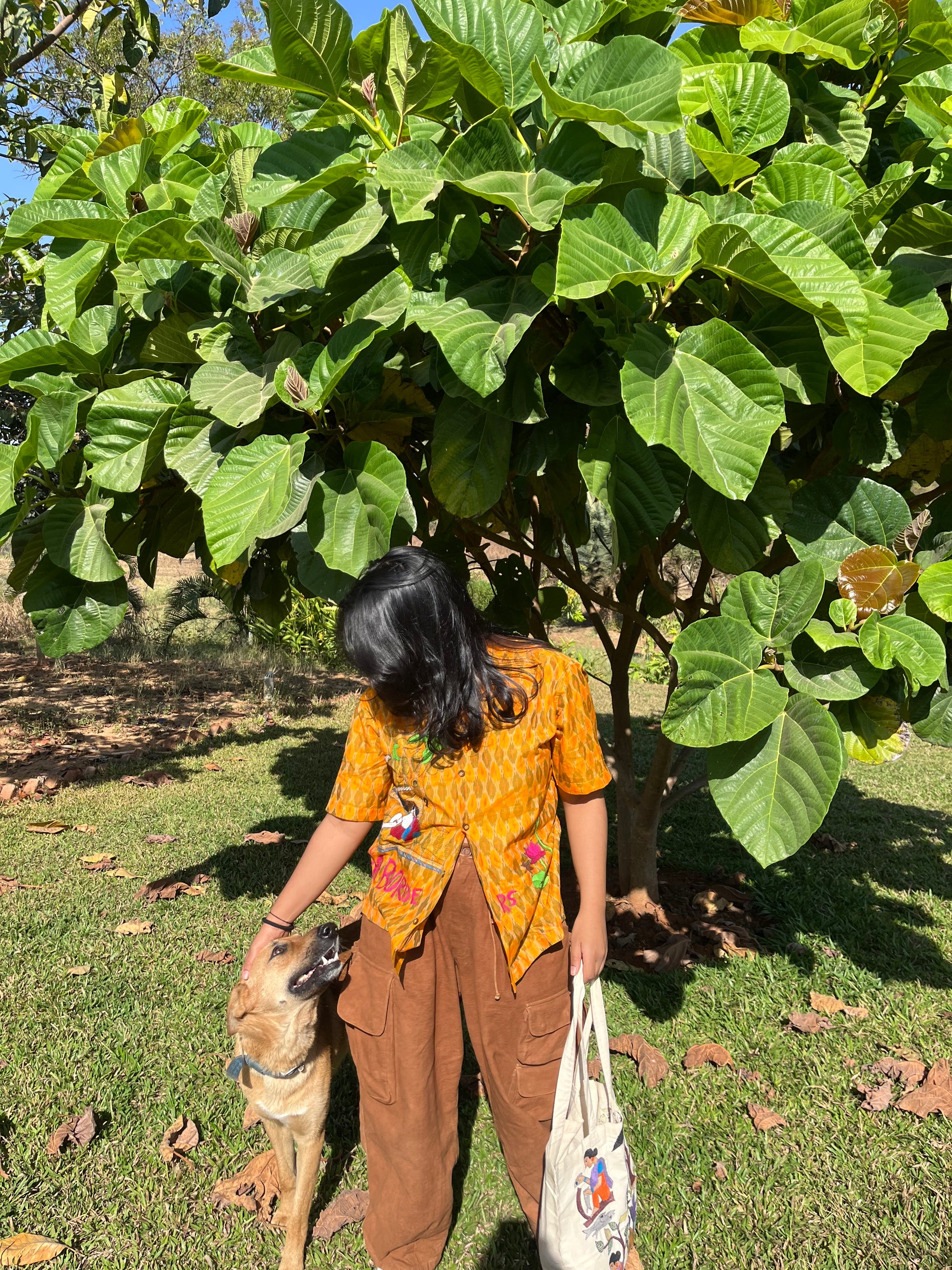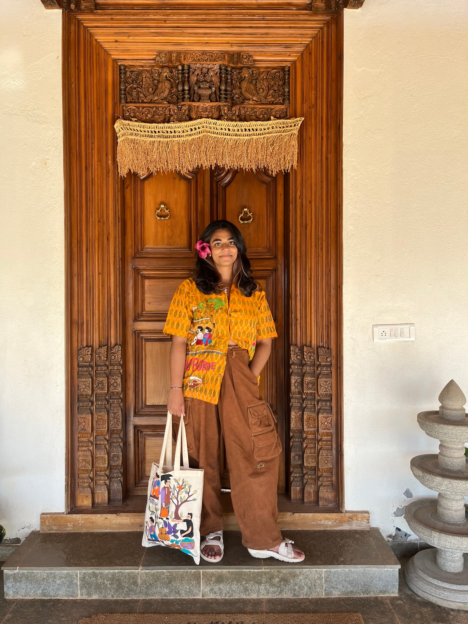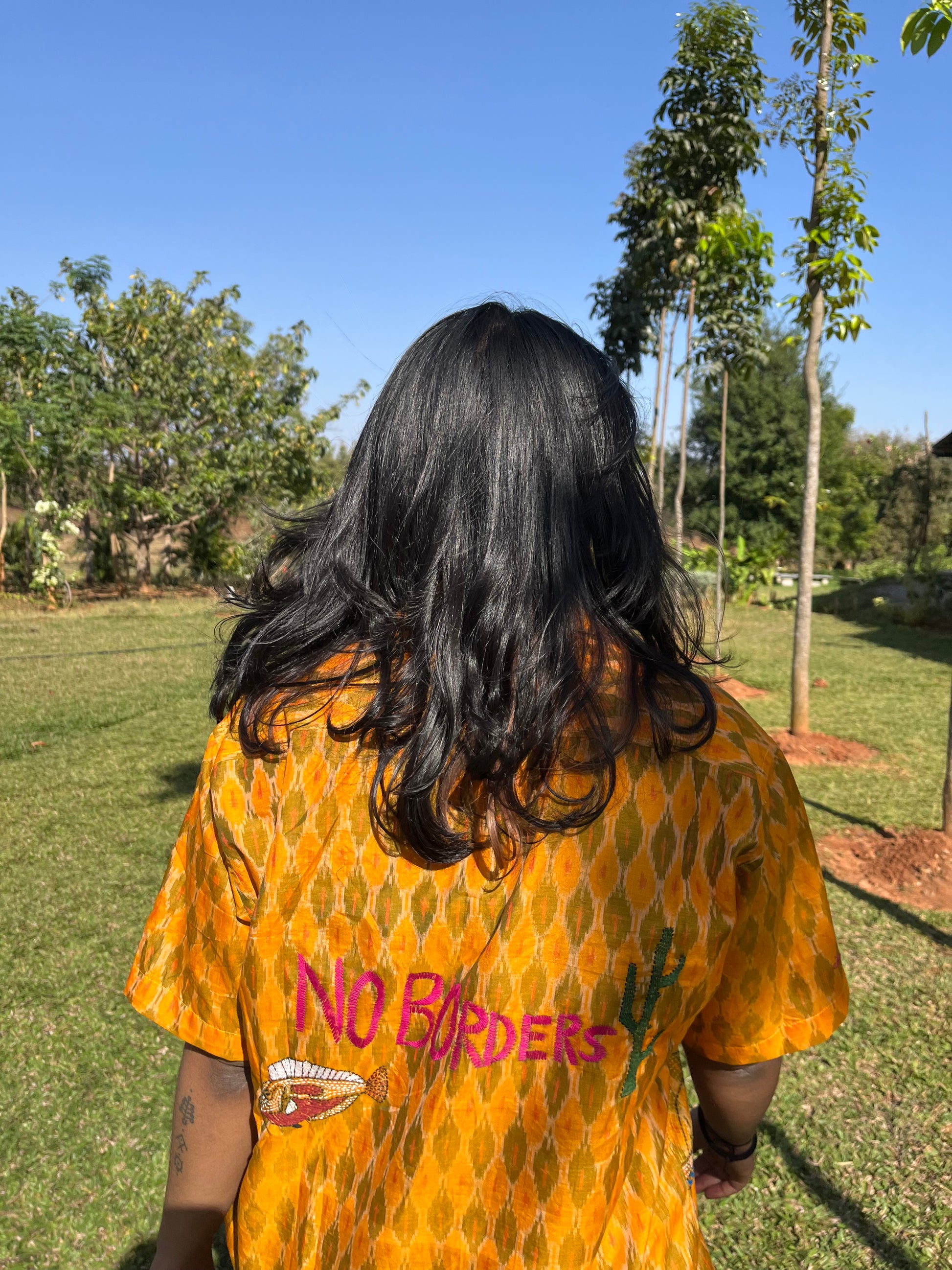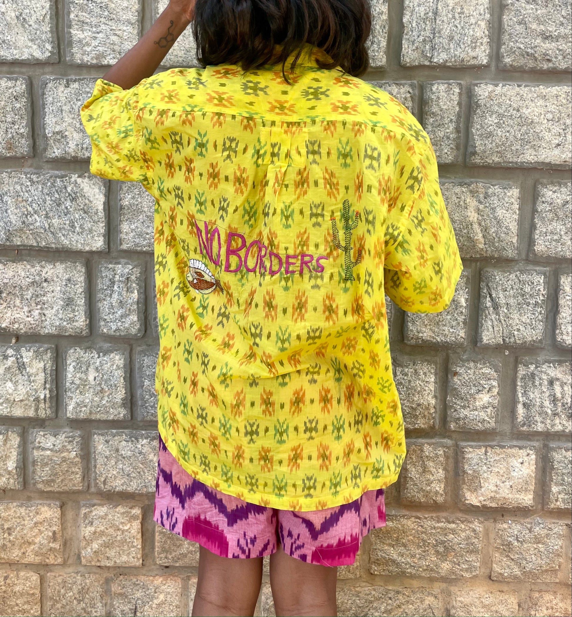 Our Kantha artisan Ajija turned this story into a beautiful Kantha motif and now it lives to tell its tale. The shirt has a beautiful single ikat pattern all over with the folklore of Nanoor overlying on top in Kantha. Super light and airy, but a statement nonetheless! It’s oversized, boxy, and unisex; Ikat fabric is hand woven and dyed with love by artisans in the state of Telangana and Kantha is done by Ajija and her team of women artisans who embroidered this vibrant story on our Ikat shirt.
