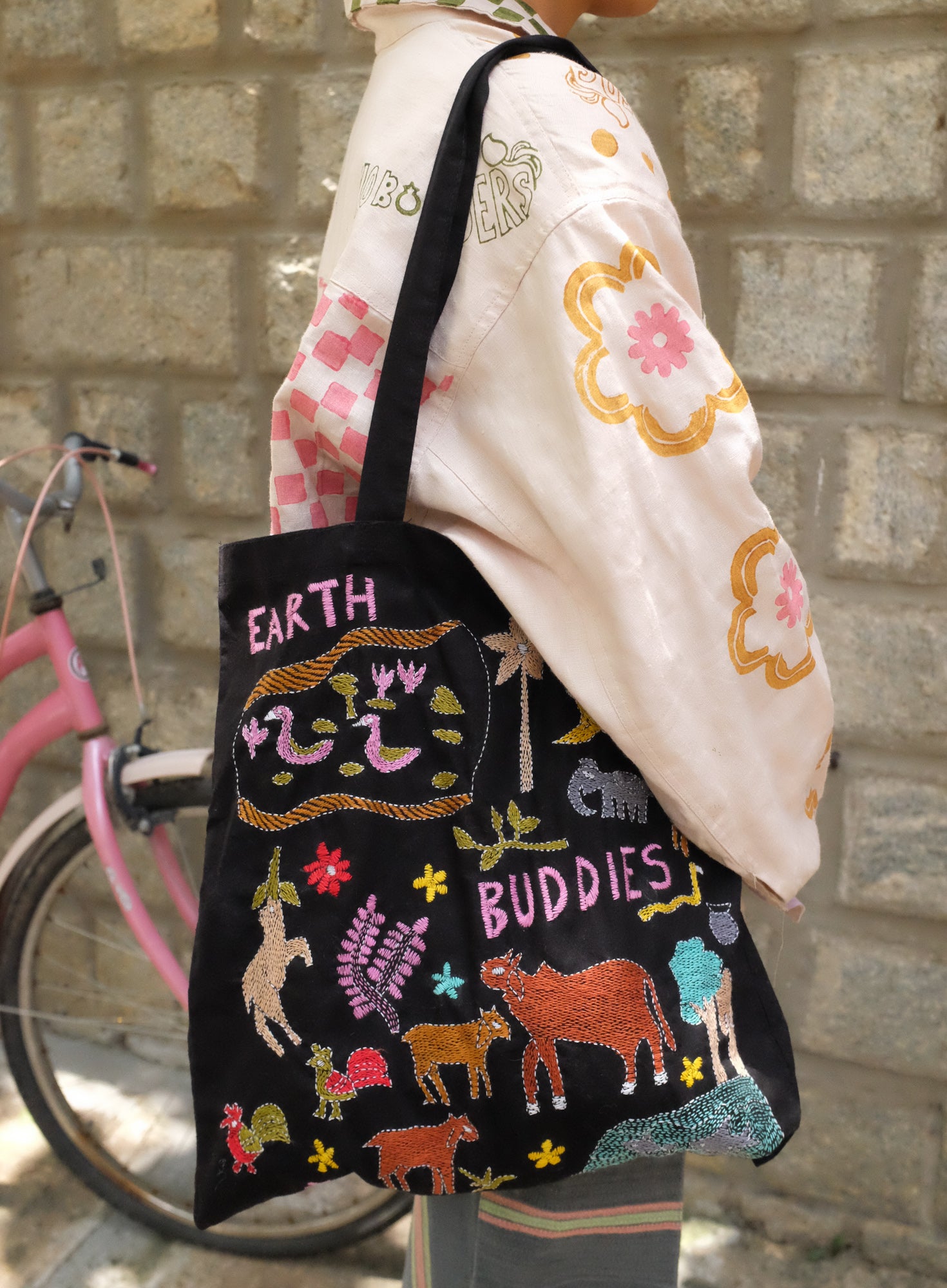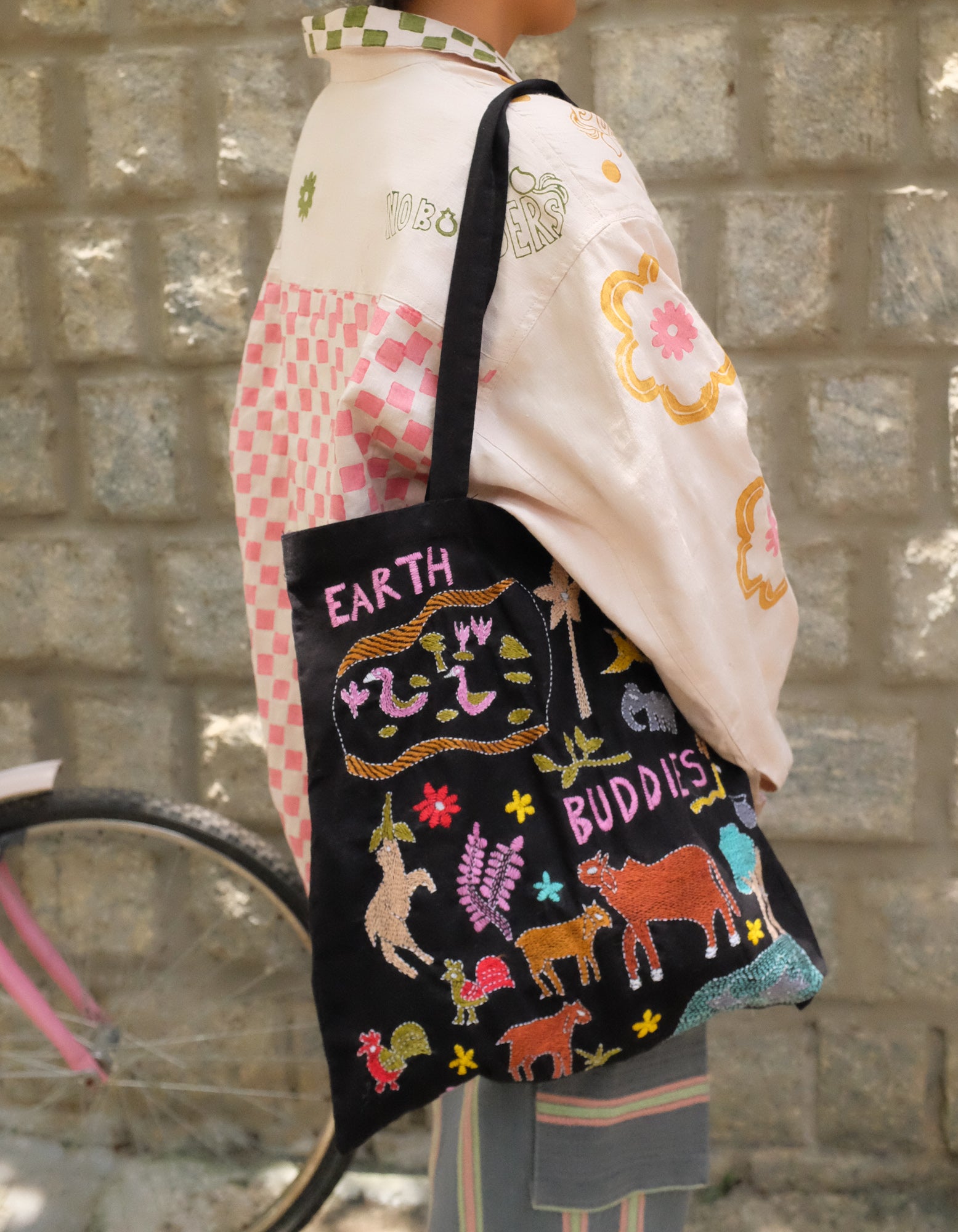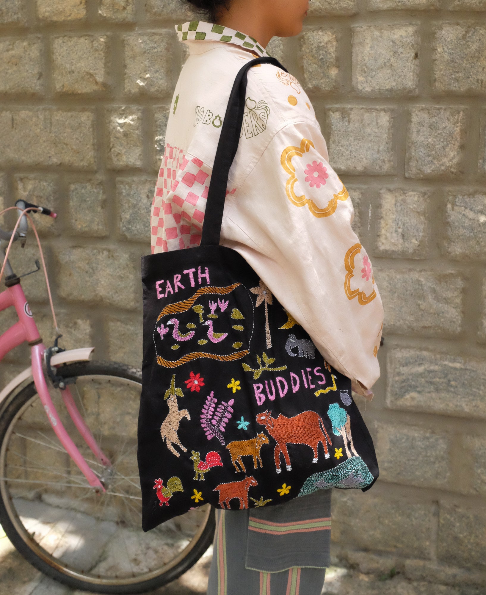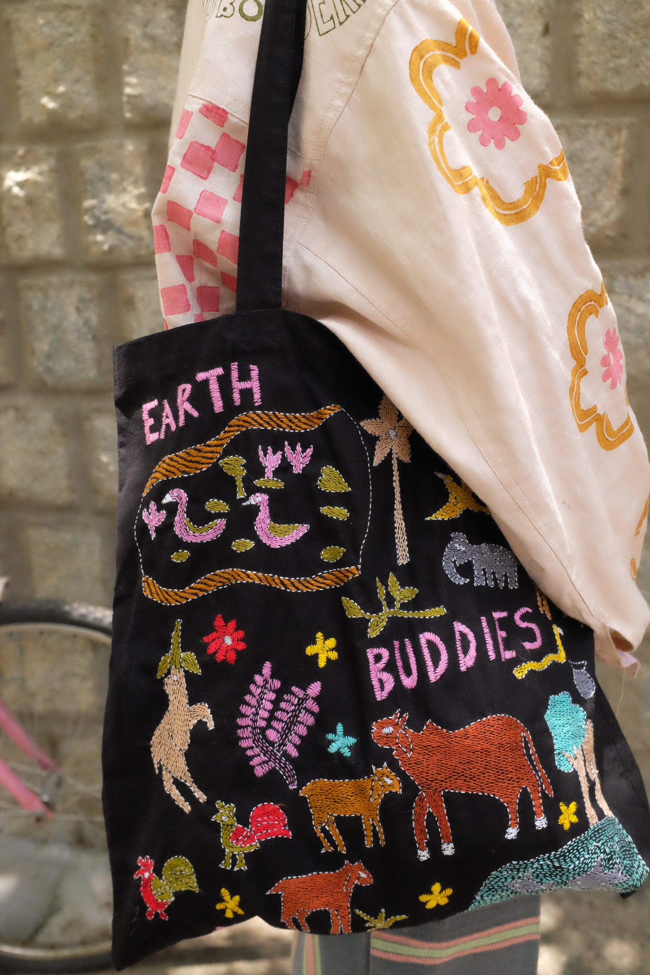 Introducing our newest Kantha Tote Bags in elegant black, now featuring reimagined vibrant motifs that tell even more stories from the villages of Bengal. Created by our talented artisan friend Priya, these tote bags are part of the "Earth Buddies" collection, celebrating the adorable animals, plants, and trees from our previous village Kantha designs 🌻✨