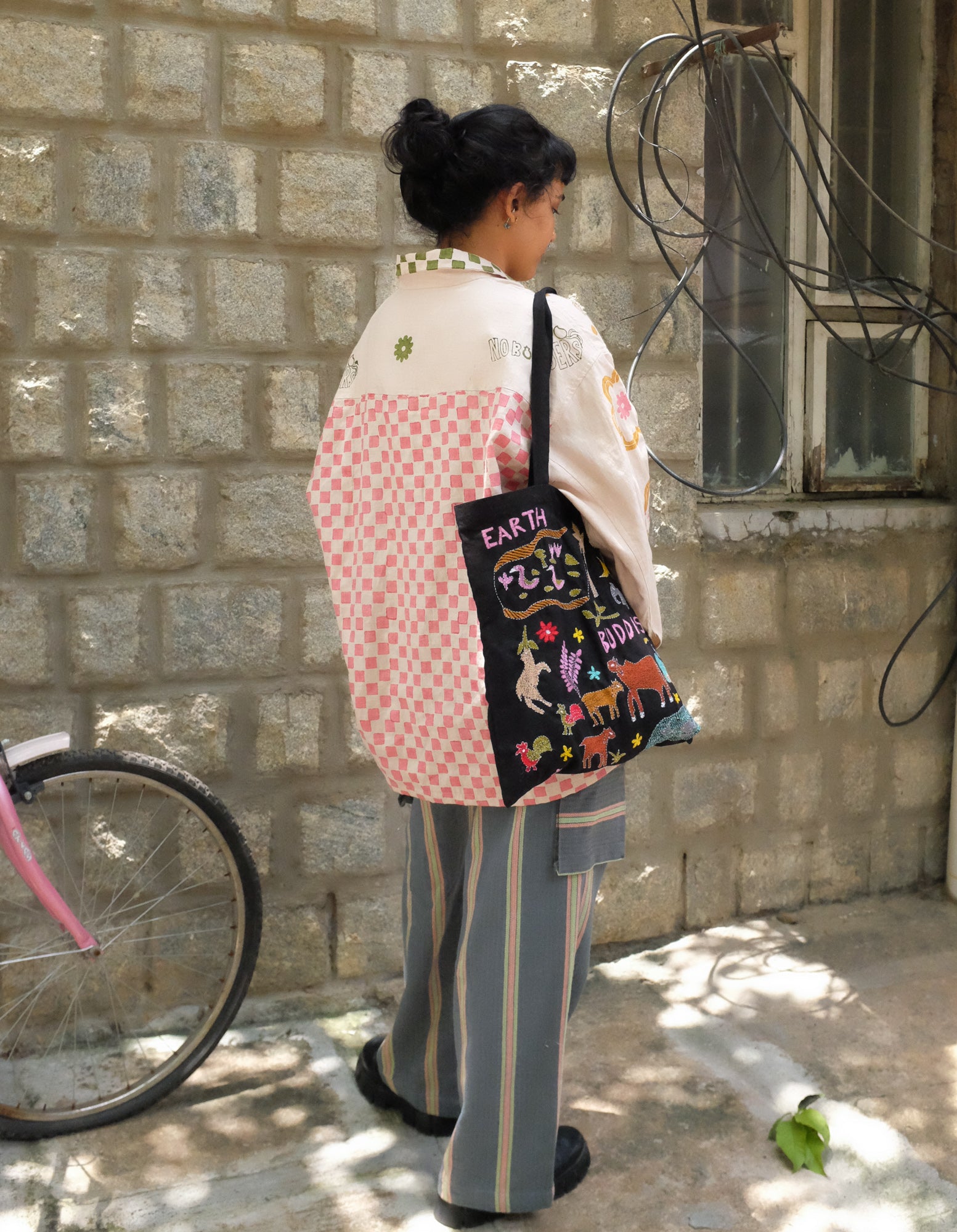 Carry the essence of Bengal's villages with you and showcase the beauty of traditional Kantha embroidery with our Kantha Tote Bags in Black - Earth Buddies Collection. Wear your values loud and proud with this unique and meaningful accessory 🦚Measurements -
