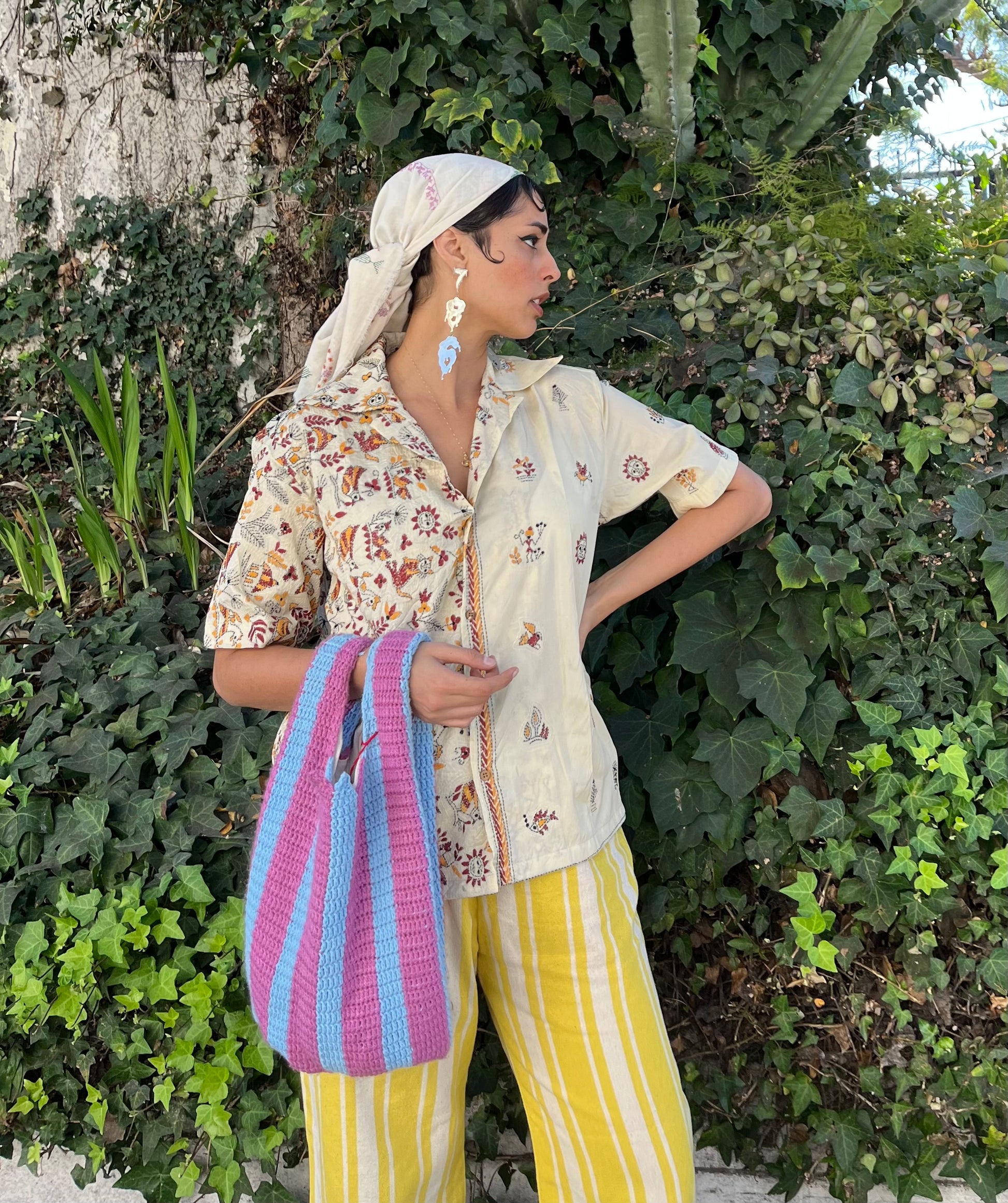 The artwork/motifs are first hand-drawn by the local hand-drawing experts or the artisan herself, and then traced onto the fabric, and then hand-embroidered using colorful mercerized cotton threads in a classic running stitch pattern on locally sourced materials.
