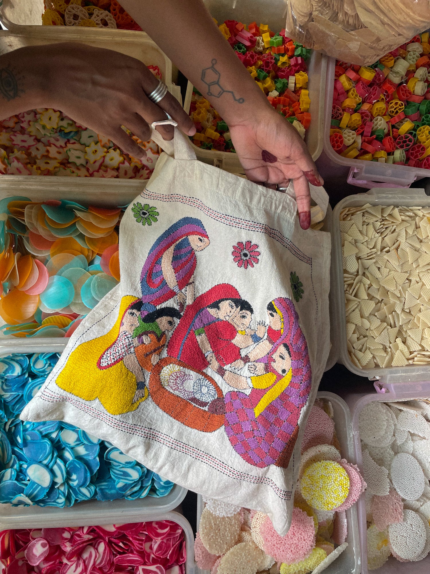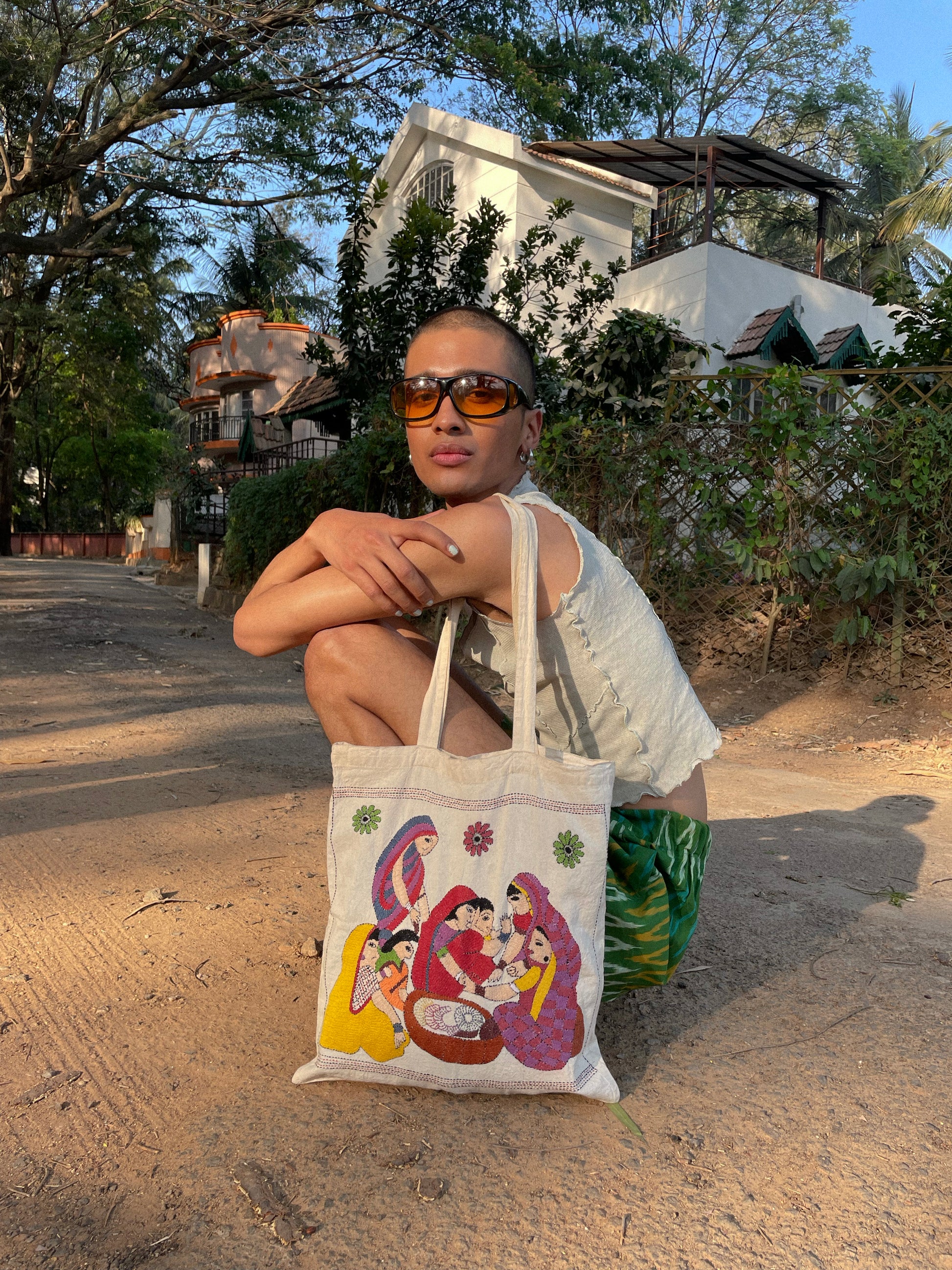 We designed these easy-to-use Tote bags with her inspired by scenes that depict the local scenes of Bengal 🌺 The tote bag;depicts a scene of women gathered around to try on bangles and buy them.