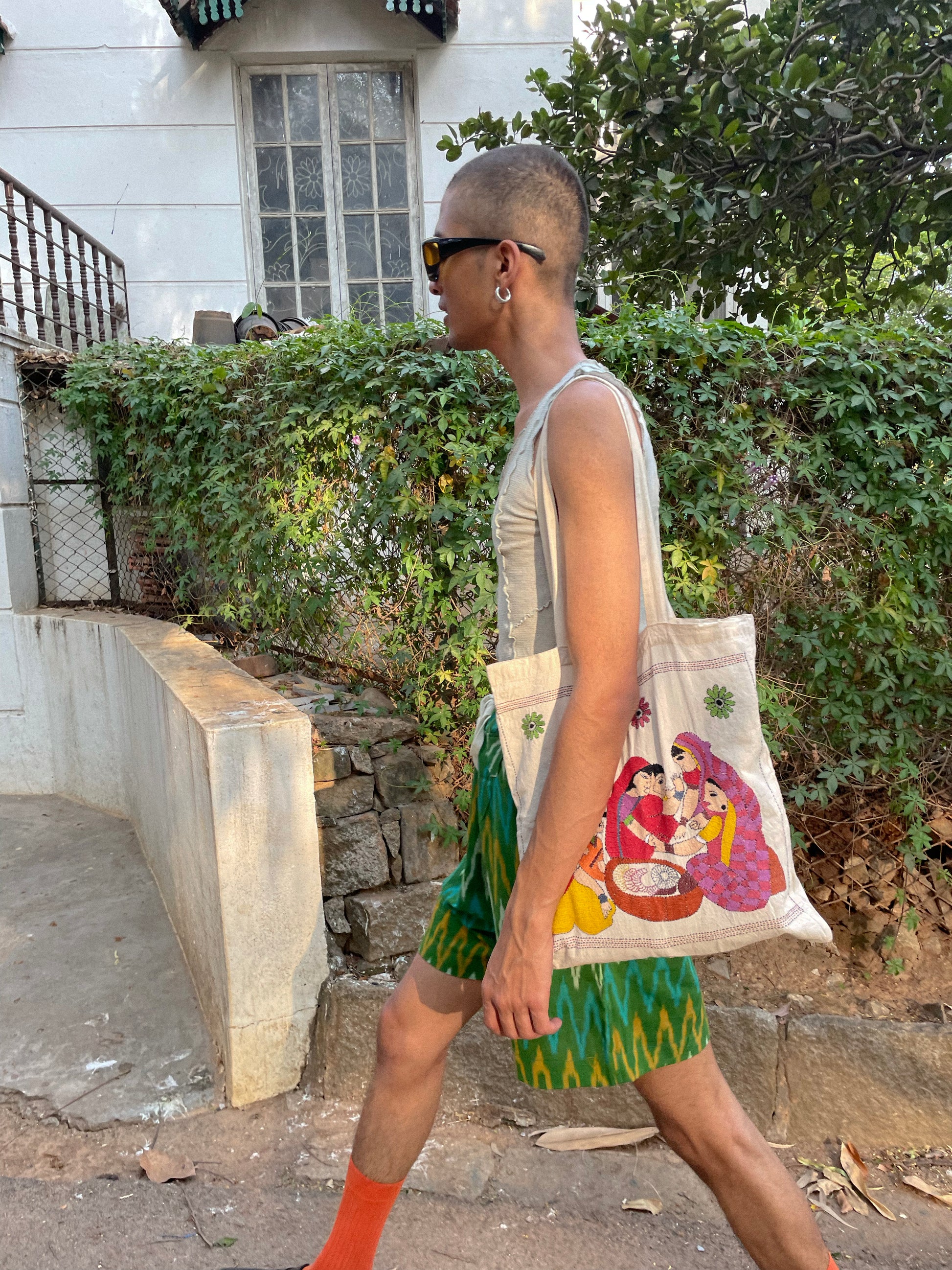 Introducing versatile, and lightweight, utility bags designed as a part of our efforts to re-innovate traditional crafts of the world and pioneering the shift towards bringing indigenous skills to contemporary design. This embroidered Kantha tote bag is lovingly crafted by our Artisan Ajija Sultana, who is an independent Kantha artisan working with her mother and a group of women in her village to craft, train and design the art of Kantha.