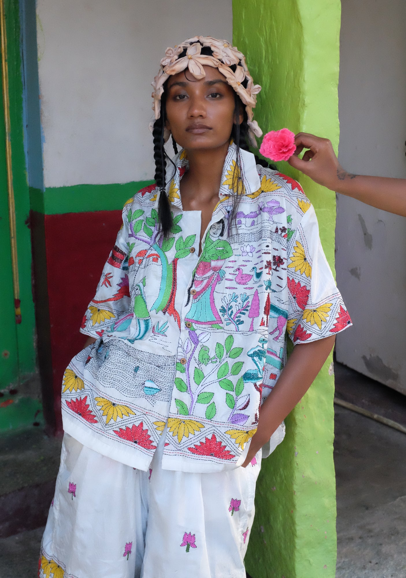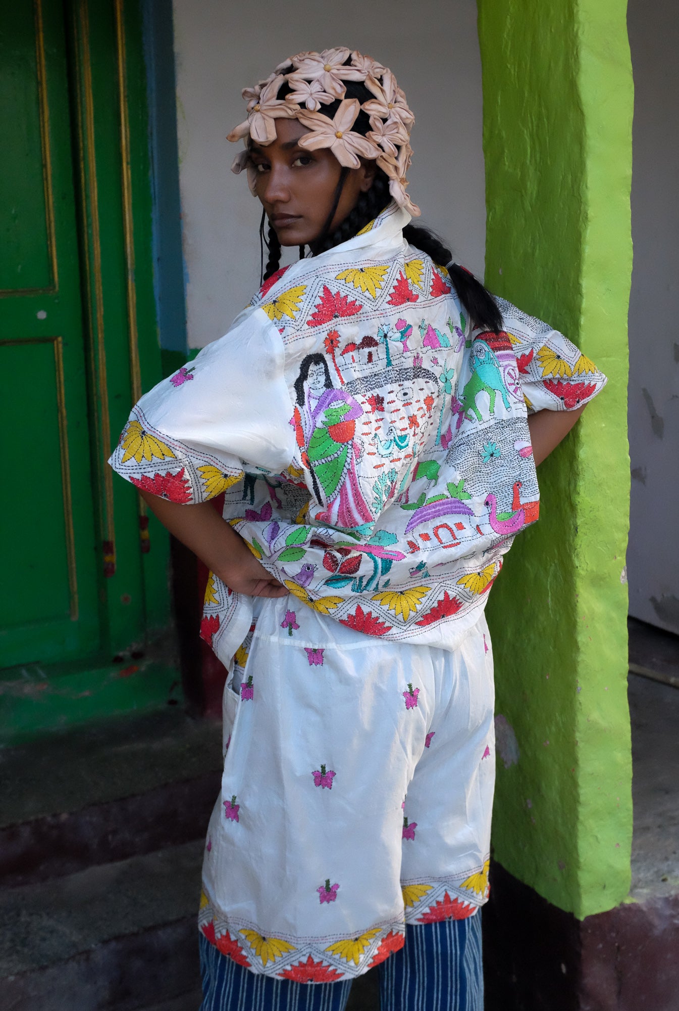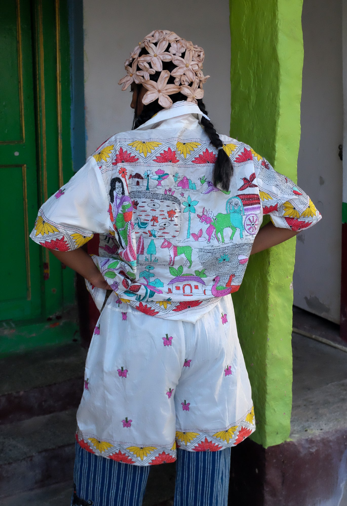 Artisan Collaboration:This design is hand- embroidered by our dearest friend artisan Priya from Bengal who has been working with us for over 3 years, Over that time we built a lovely bond with her, sharing stories and being each others' support. With the help of No Borders, she as been able to successfully grow her team in the Nanoor village district, employing young women from neighboring villages to work with her. That she says is her biggest achievement yet.