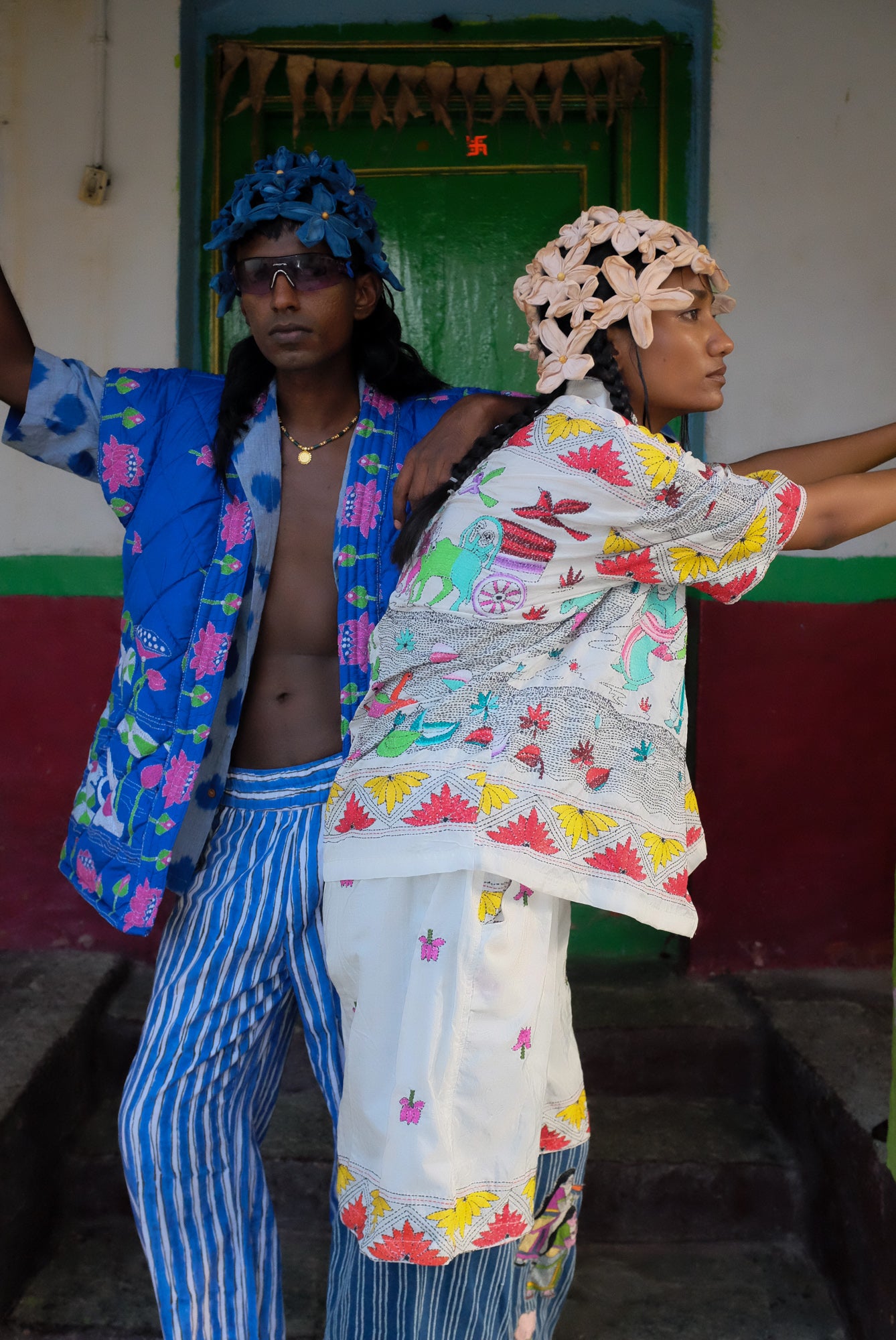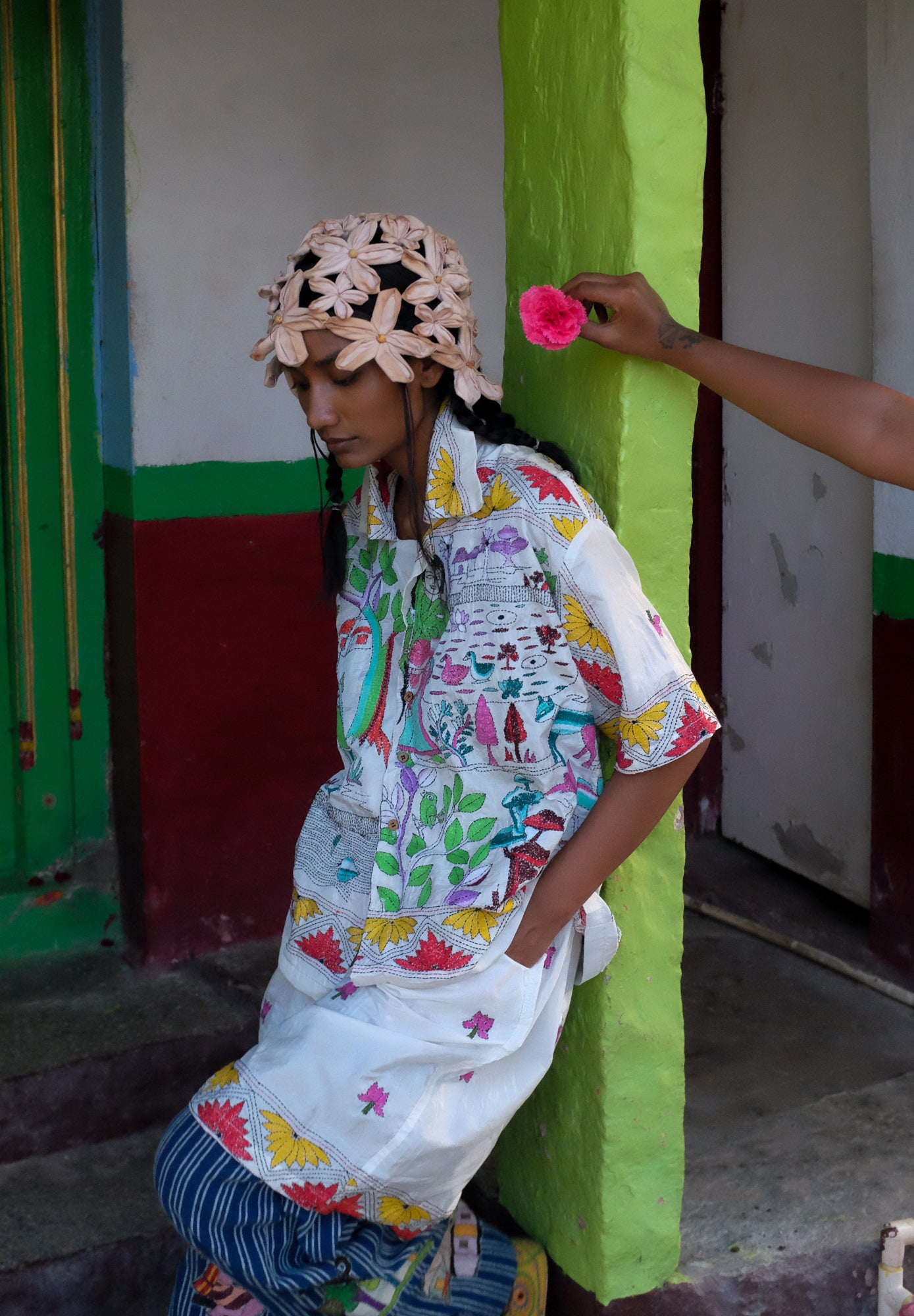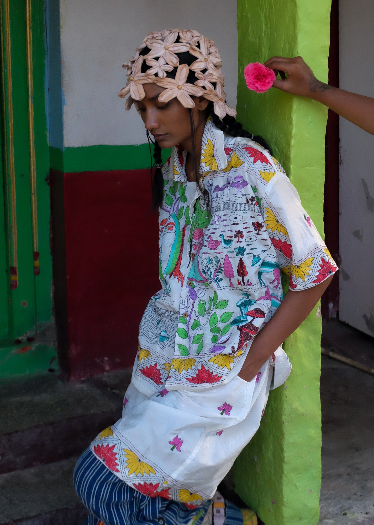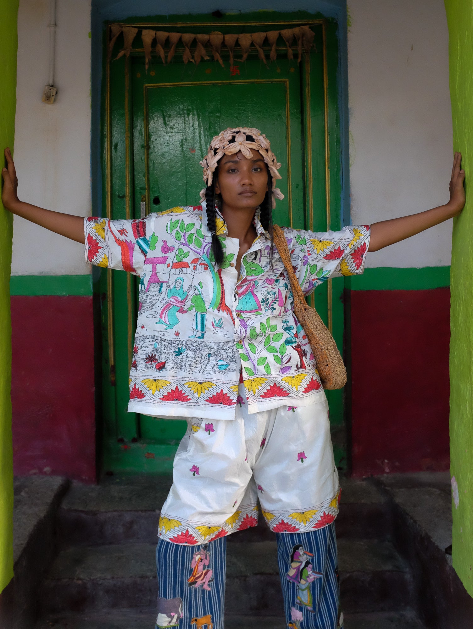 Artisan Collaboration:This design is hand- embroidered by our dearest friend artisan Priya from Bengal who has been working with us for over 3 years, Over that time we built a lovely bond with her, sharing stories and being each others' support. With the help of No Borders, she as been able to successfully grow her team in the Nanoor village district, employing young women from neighboring villages to work with her. That she says is her biggest achievement yet.