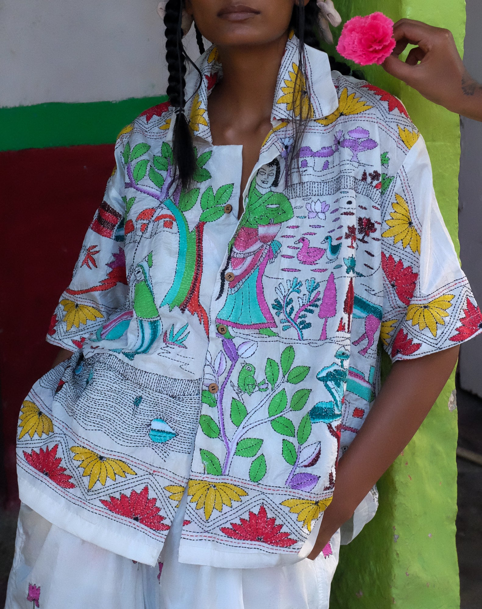 Introducing our meticulously stitched and lovingly crafted Kantha Embroidered Tussar Silk Shirt. Made by our talented artisan Ajija Sultana and her team of women artisans, this shirt features vibrant stories embroidered on locally sourced Tussar Silk. The design is inspired by the everyday scenes at the village markets of Bengal, with motifs that narrate the day-to-day life of local sellers and street vendors through the age-old embroidery technique π₯πΉβ¨π§΅