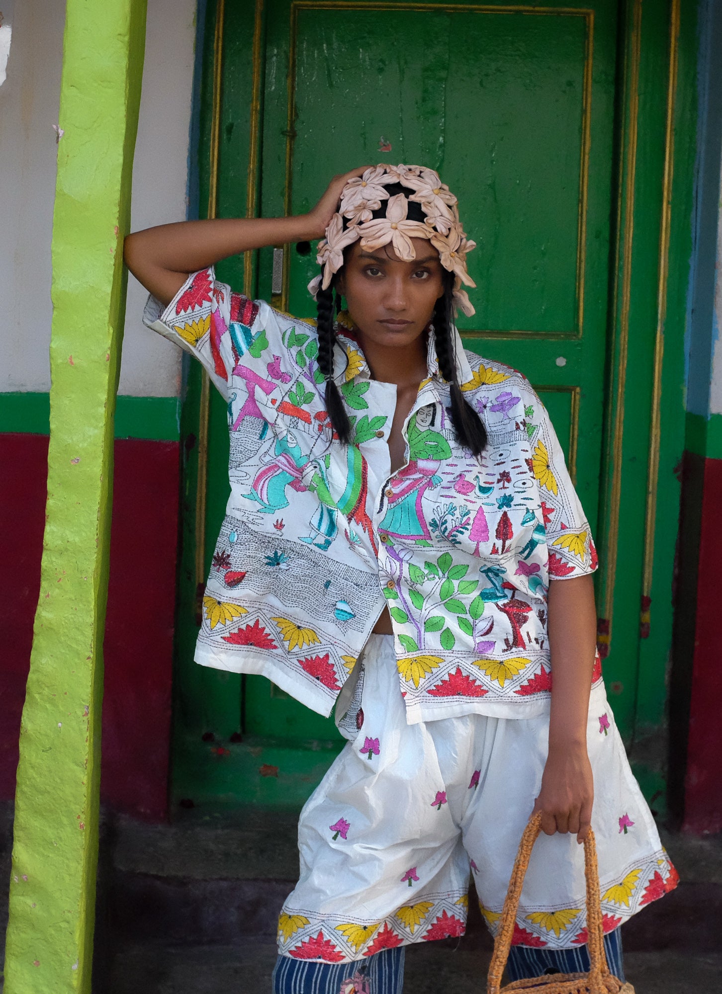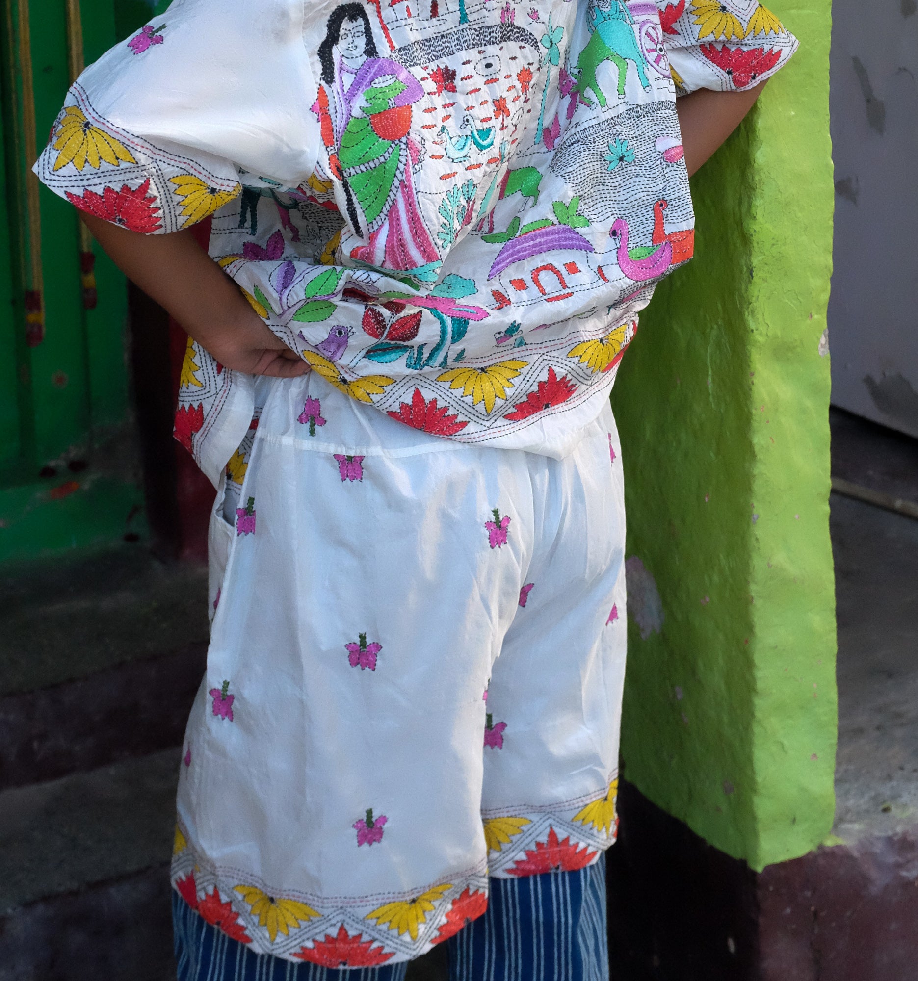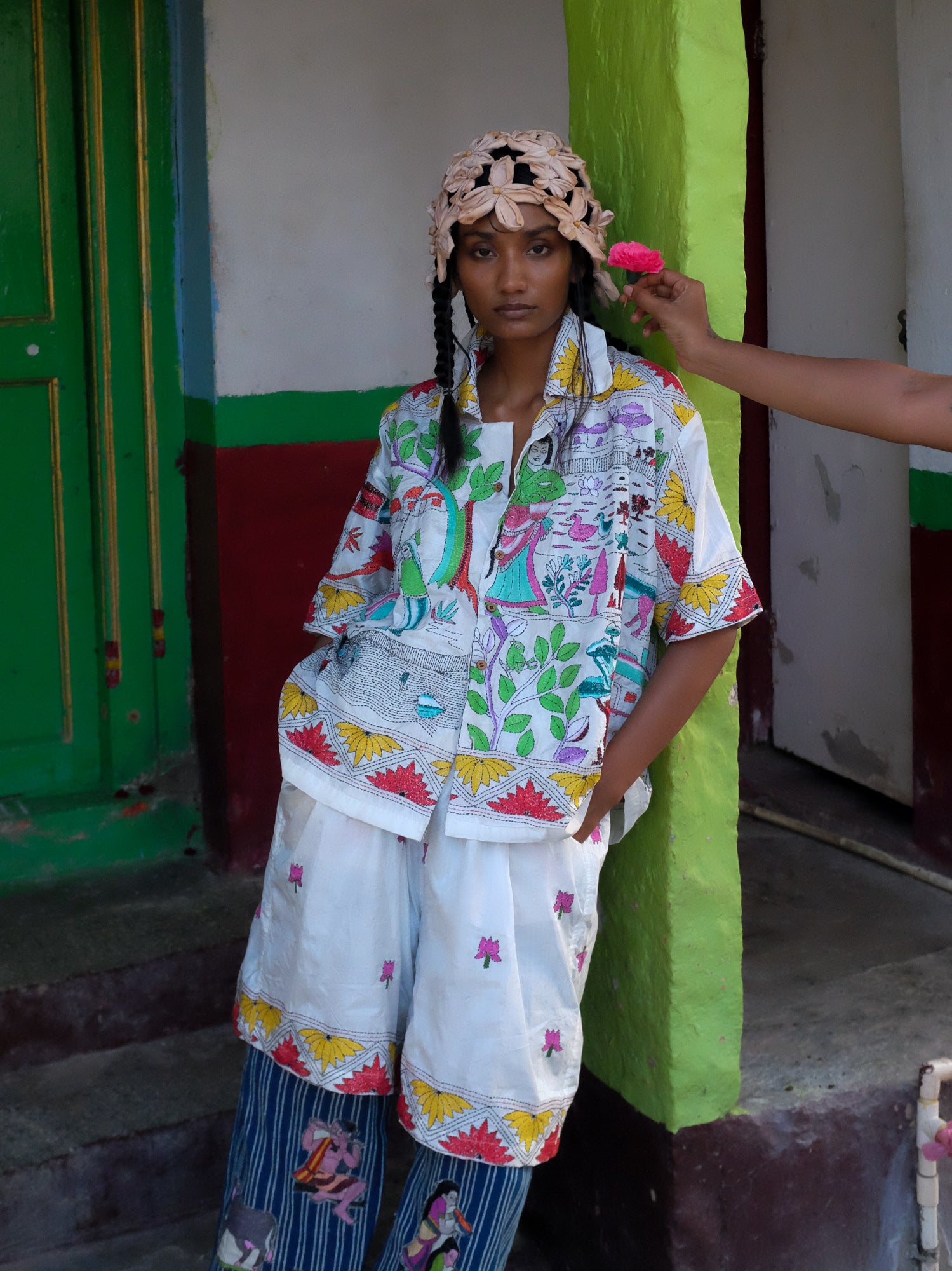 Introducing our meticulously stitched and lovingly crafted Kantha Embroidered Tussar Silk Shorts. Made by our talented artisan Ajija Sultana and her team of women artisans, these shorts feature vibrant stories embroidered on locally sourced Tussar Silk. The design is inspired by the everyday scenes at the village markets of Bengal, with motifs that narrate the day-to-day life of local sellers and street vendors through the age-old embroidery technique 🥀🌹✨🧵