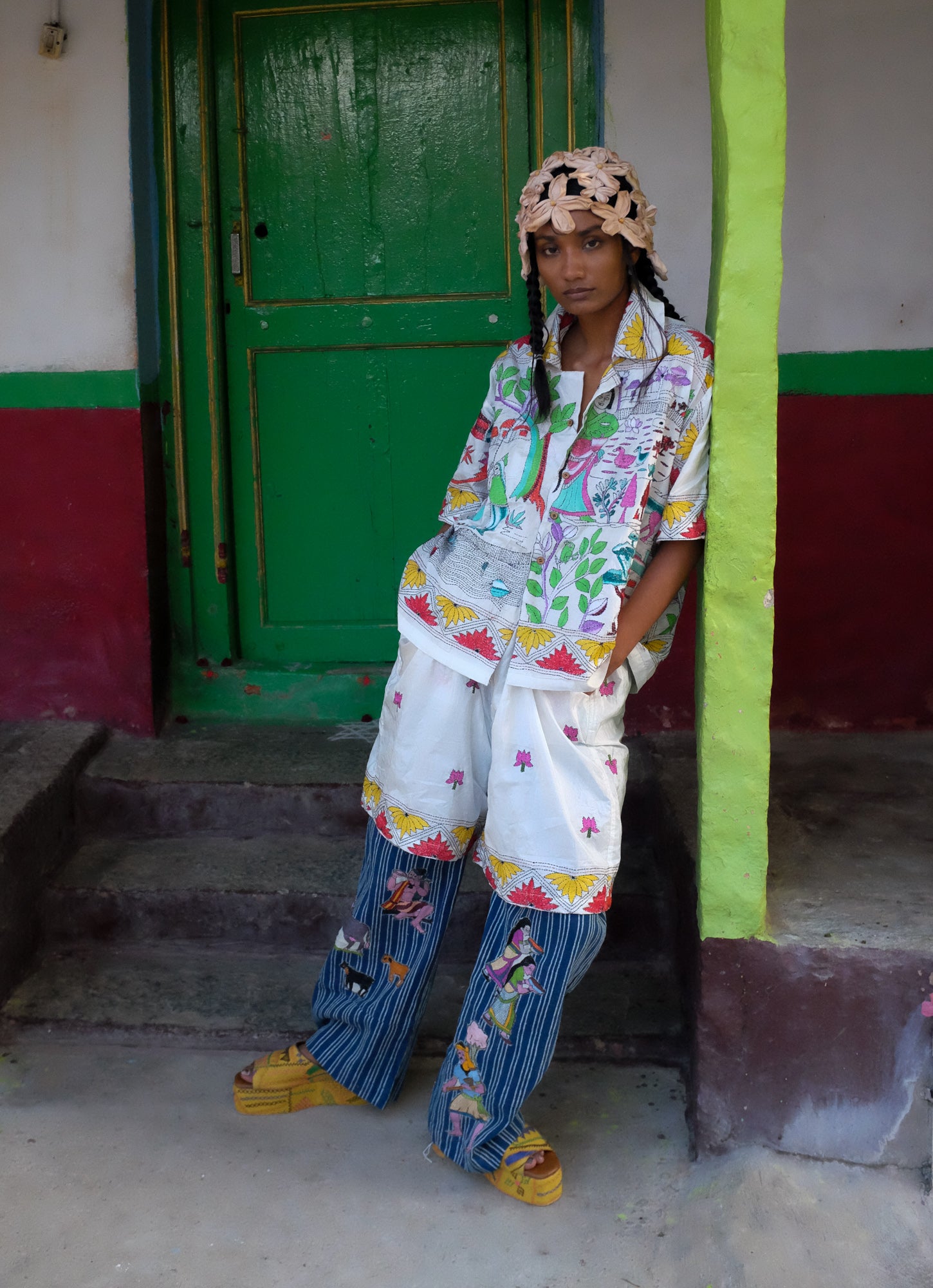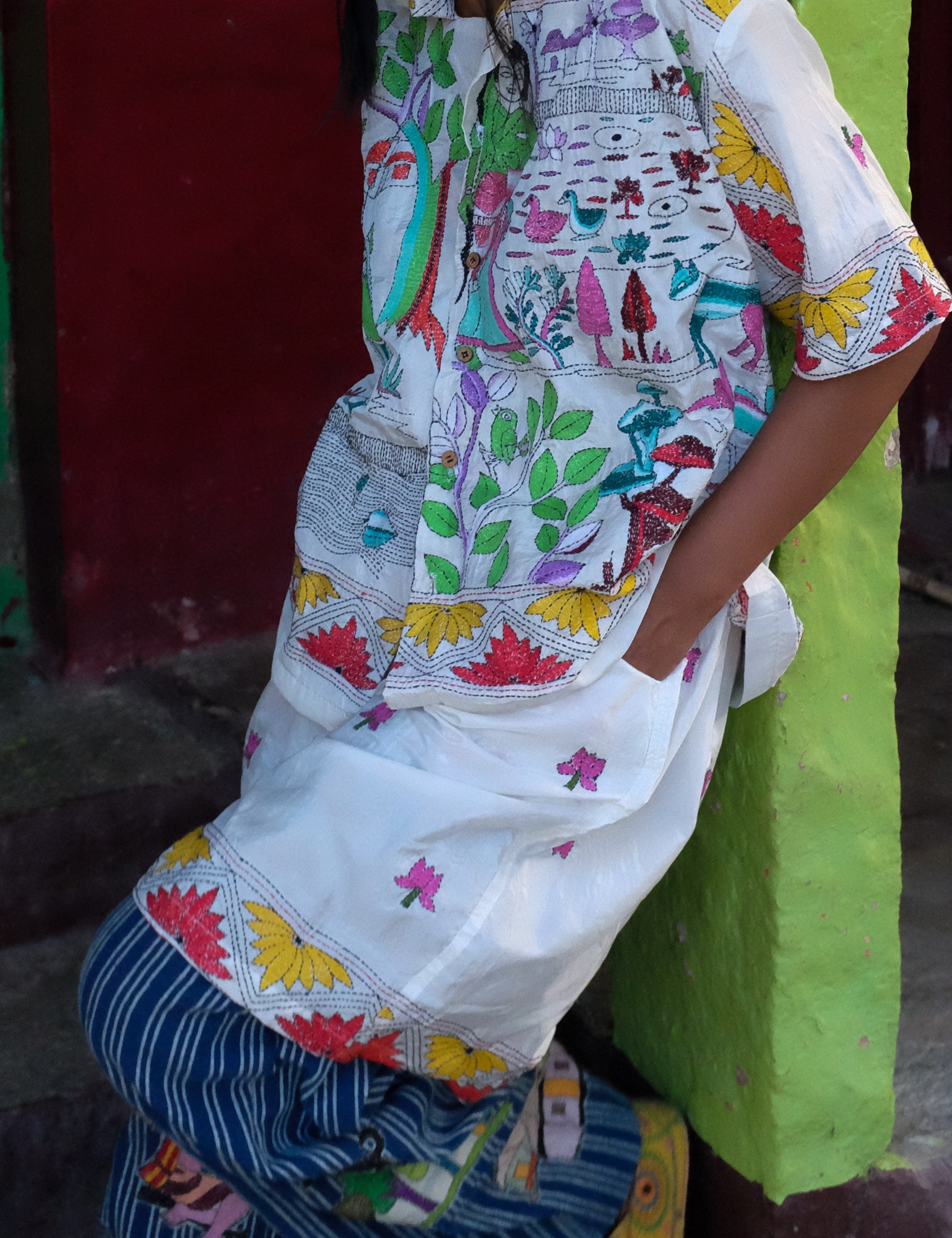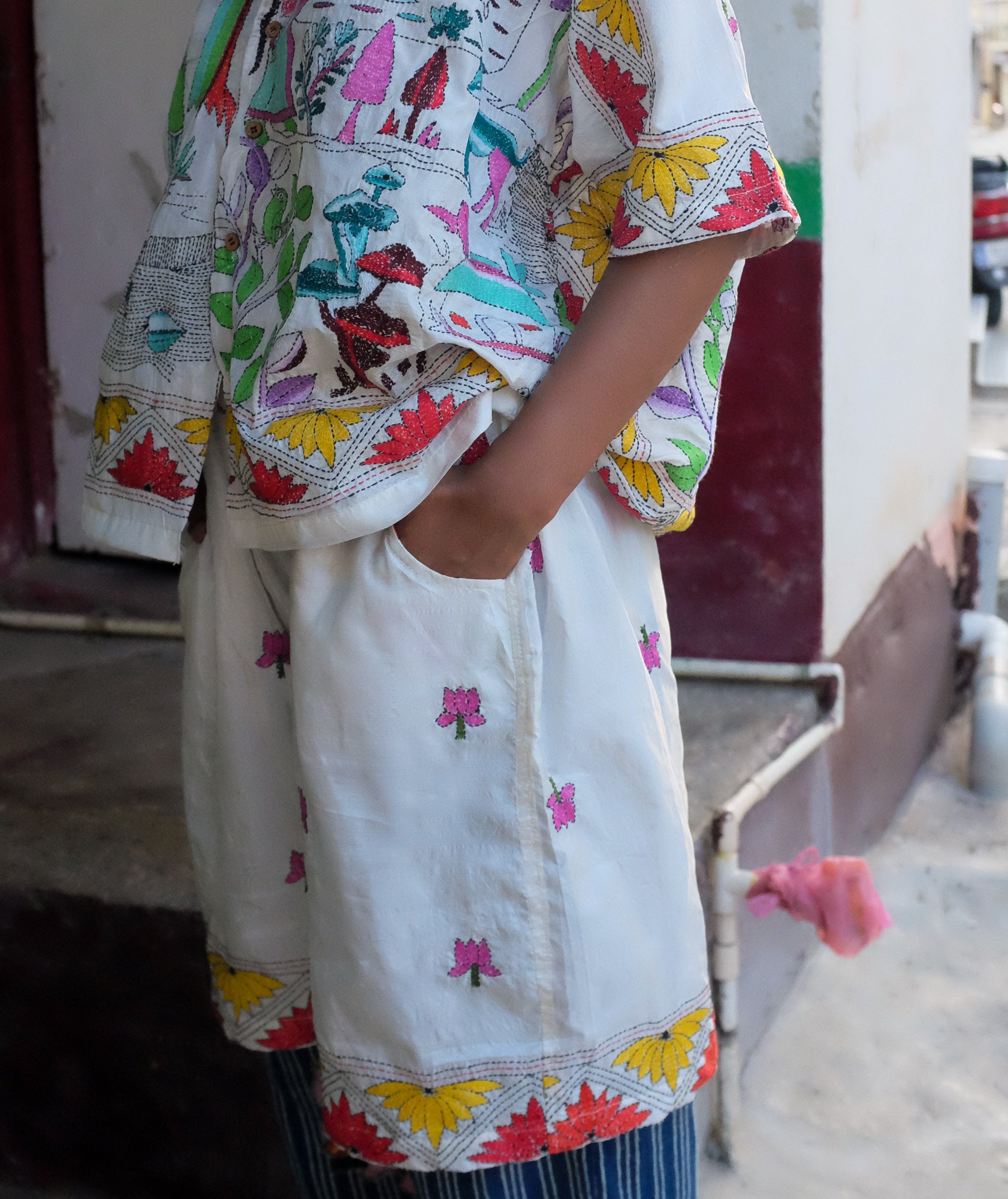 Artisan Collaboration: This design is hand- embroidered by our dearest friend artisan Priya from Bengal who has been working with us for over 3 years, Over that time we built a lovely bond with her, sharing stories and being each others' support. With the help of No Borders, she as been able to successfully grow her team in the Nanoor village district, employing young women from neighboring villages to work with her. That she says is her biggest achievement yet.