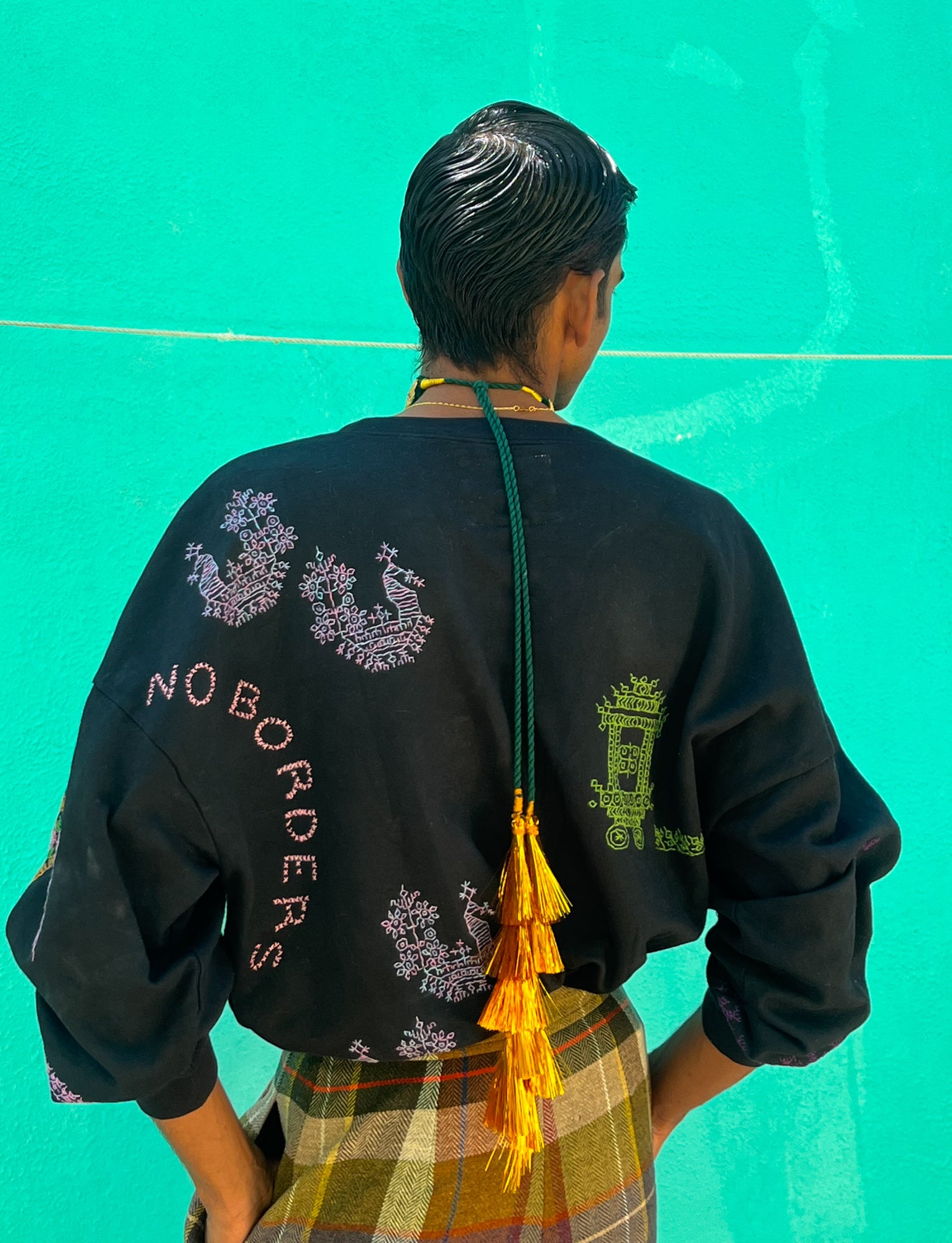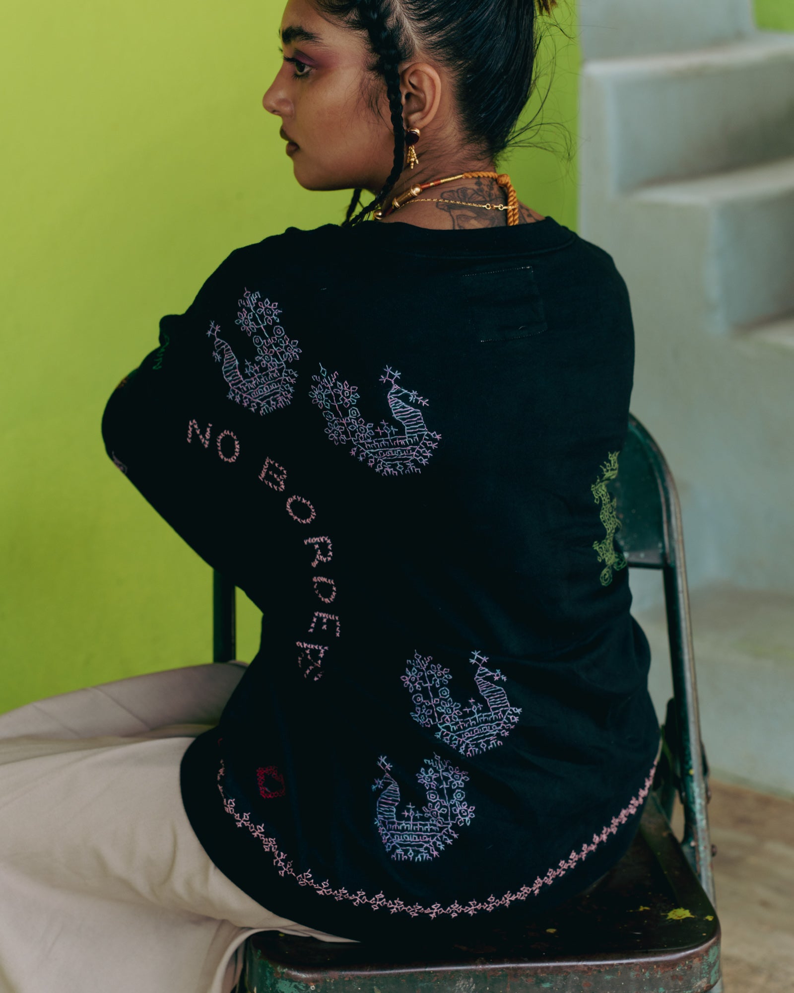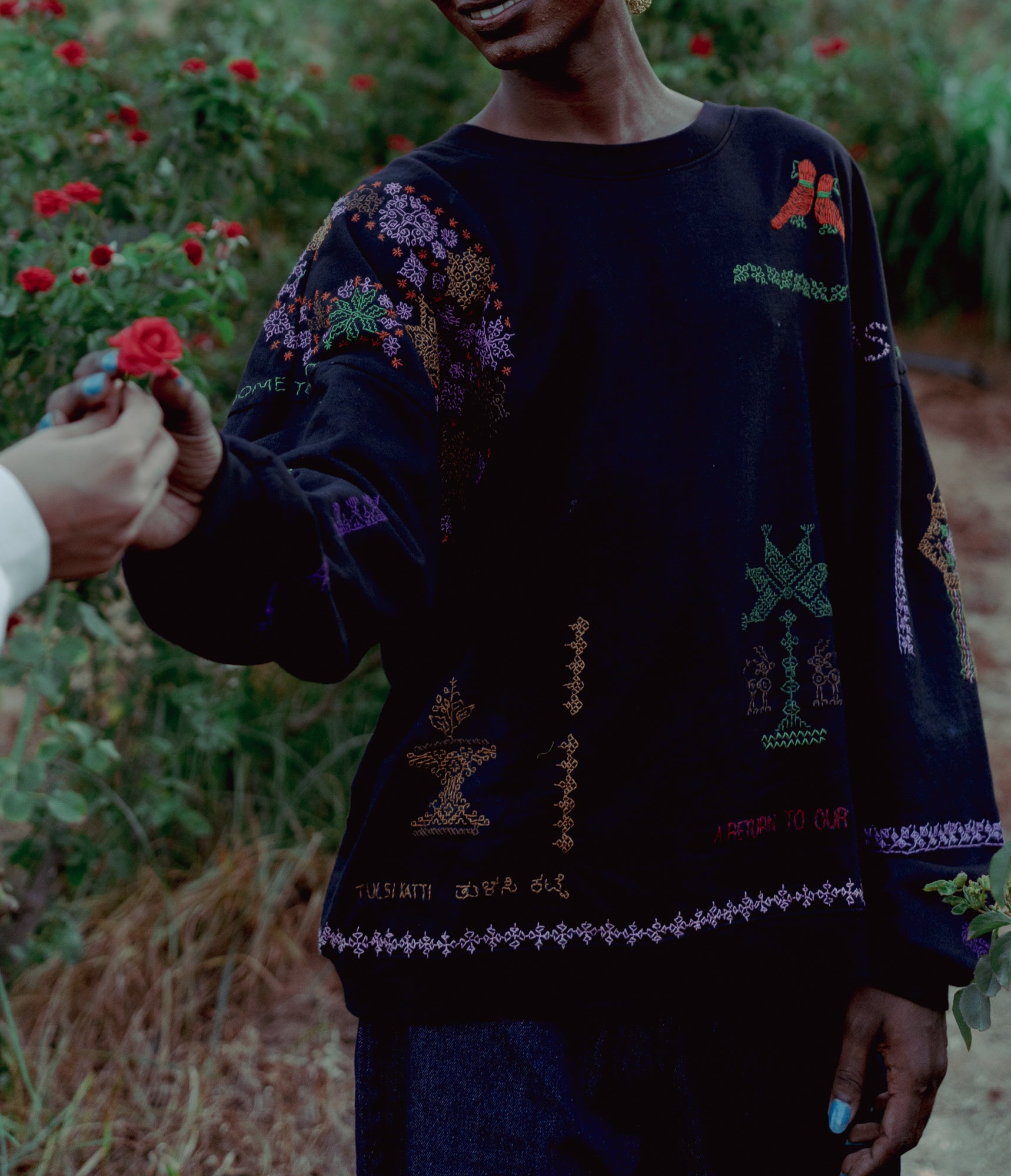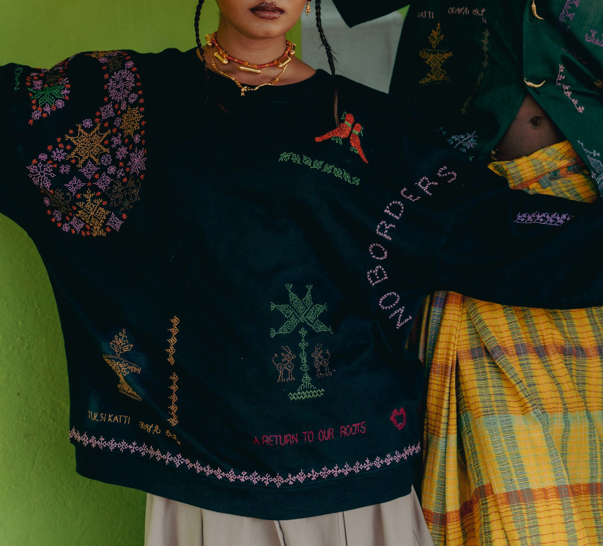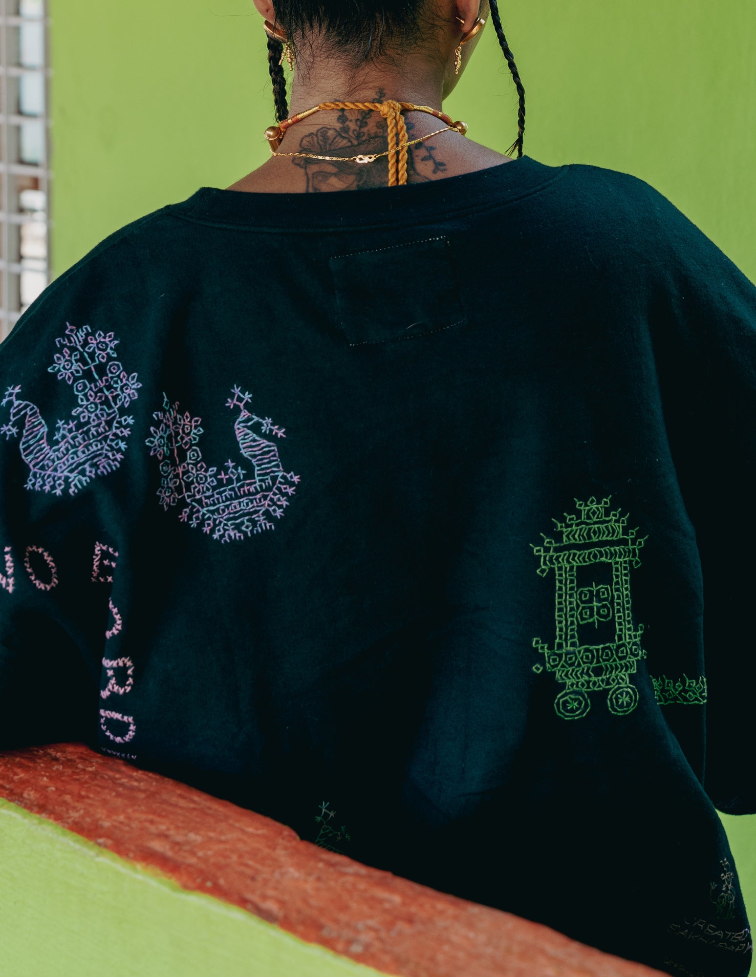 A product of Love - the Stories of our ancestors sweatshirt was created as an effort to embrace our land, protect our ancestral skills and go back to Mother Earth 🌍 The embroidery was co-created with artisans in Dharwad, our hometown in North Karnataka, crafted with the women of Sakhi Saphalya, a non- profit that works in partnership with skilled women from neighbouring villages to empower them with the Kasuti craft. The sweatshirt is lovingly made by our friends at Oshadi Collective, using purely organic Cotton jersey fabric, dyed in black using natural pigments and stitched by the highly skilled workers from Erode, Tamil Nadu 🌸