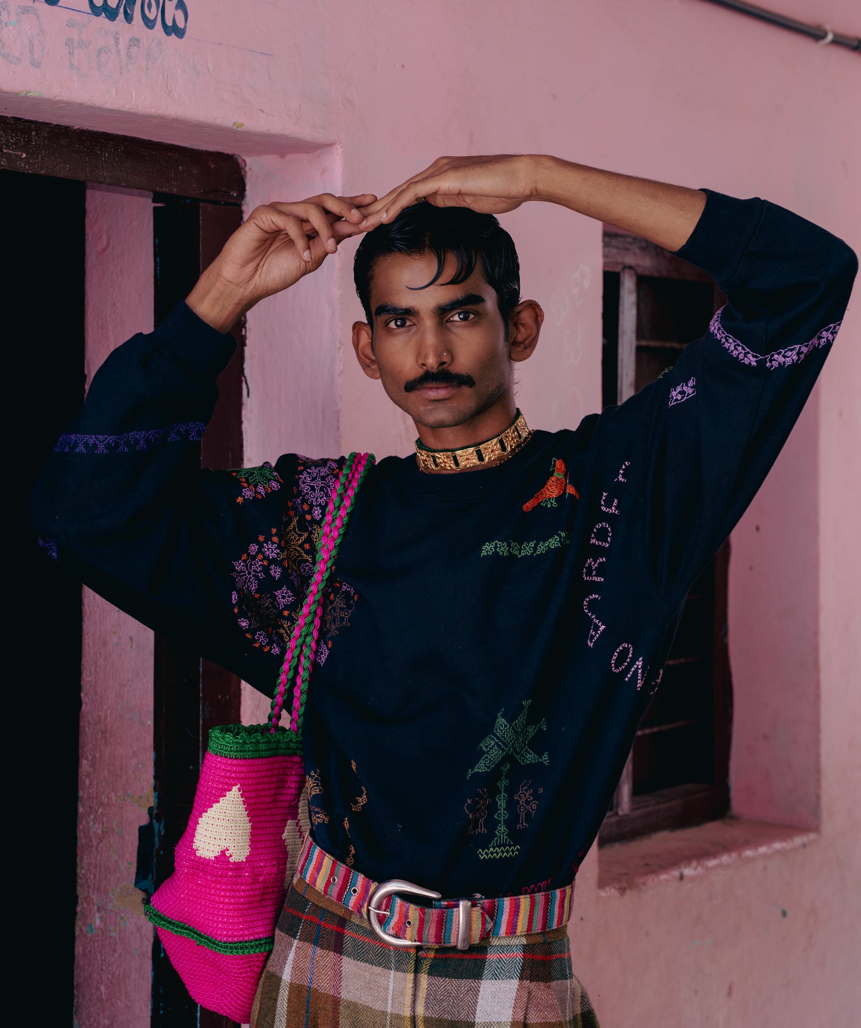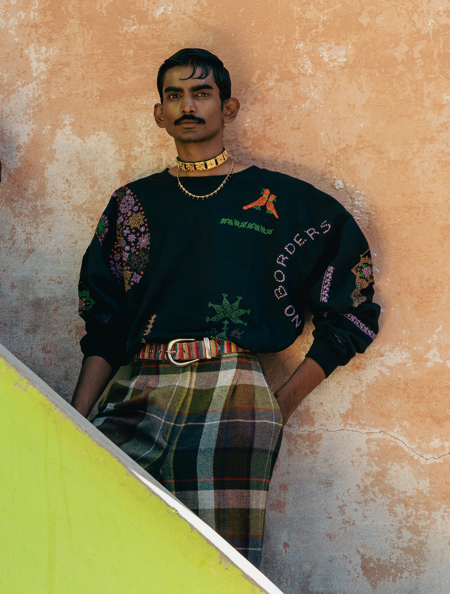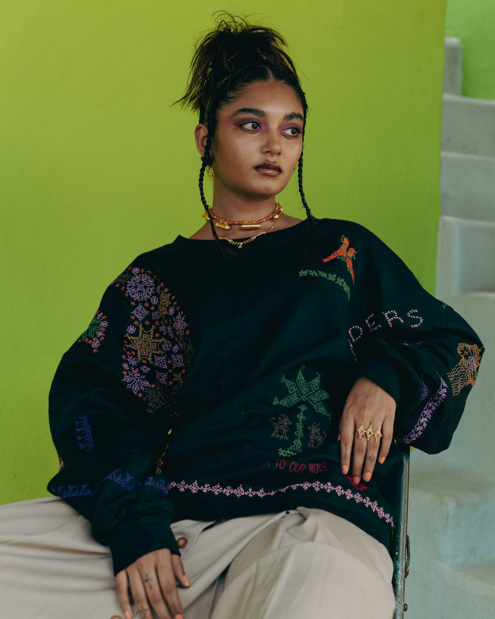 Model is wearing S-M. We styled the Stories of Ancestors black sweatshirt with our most treasured vintage pieces that we have collected through out the world over the last four years. Rupal wearing a Lacrosse plaid pants from the 80's, Kripali wearing it with a vintage midi skirt from the 60's, while Elton paired with with an oversized denim trouser by one of our favourite designers,I am Isigo🧚🏾 Jewels by Ziddi