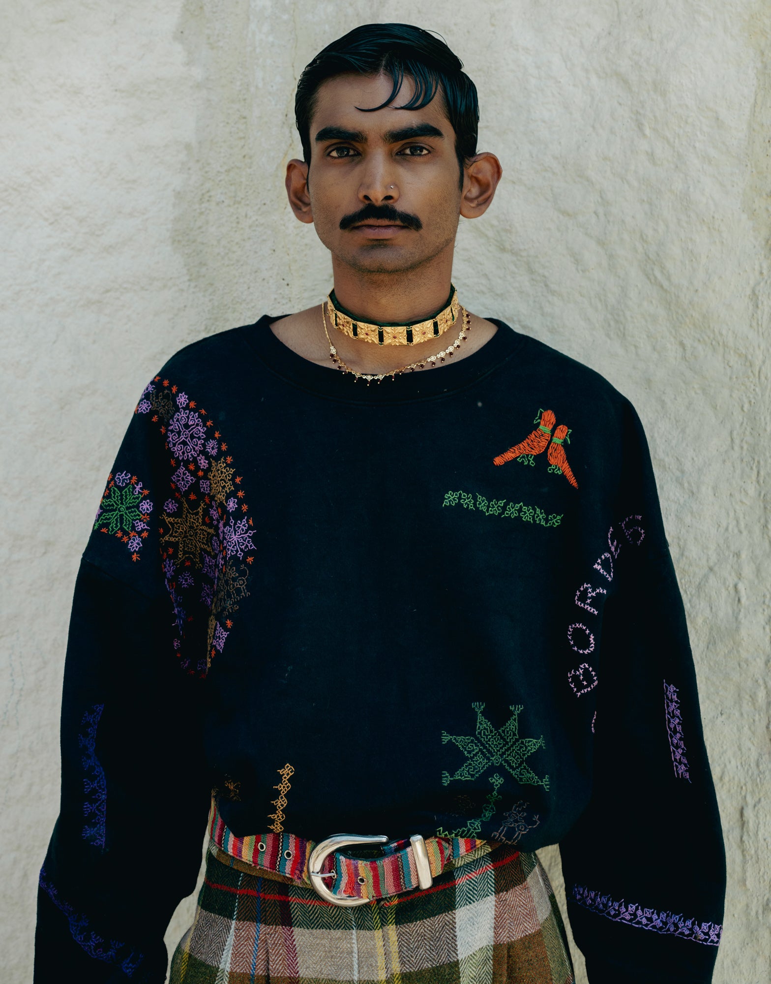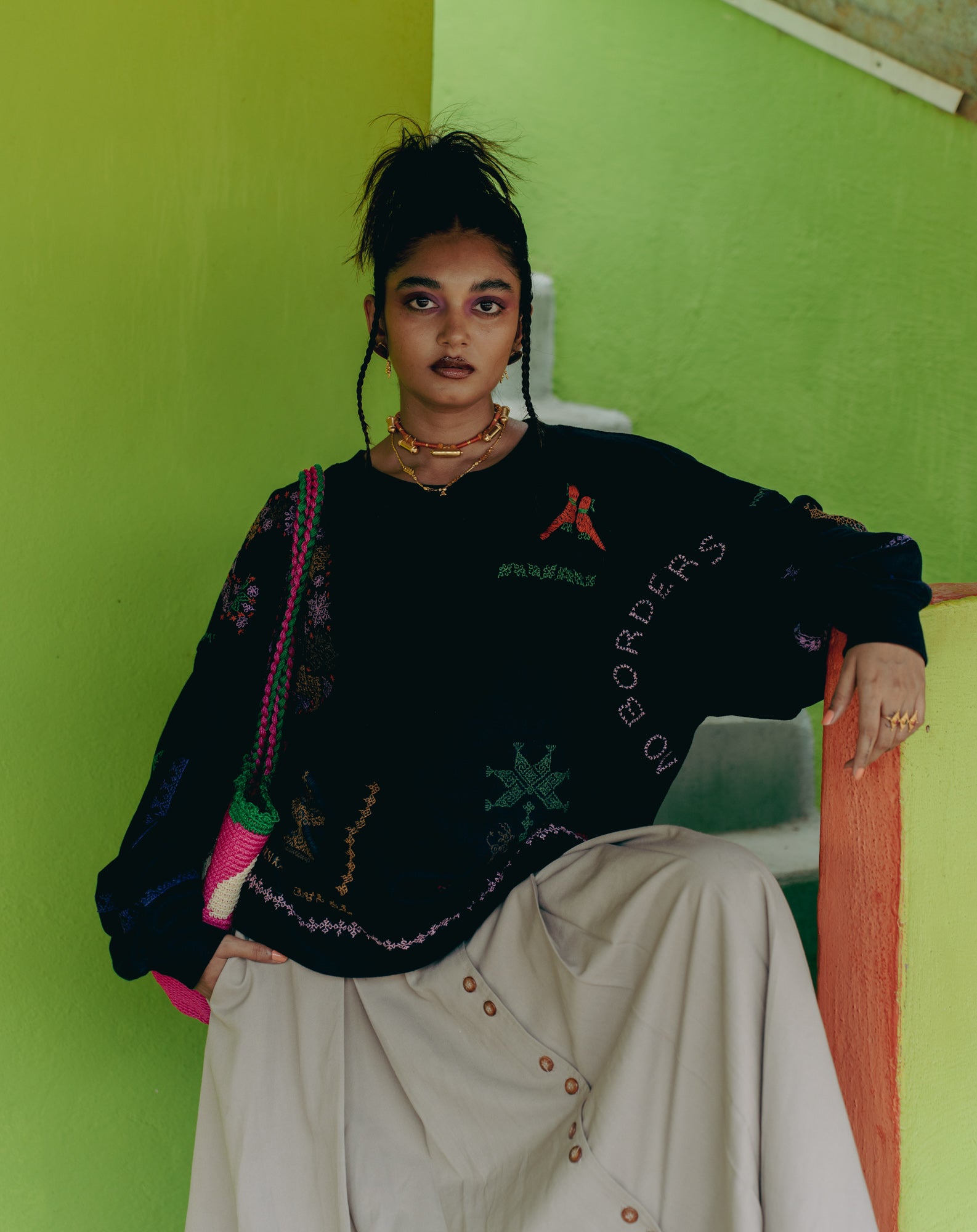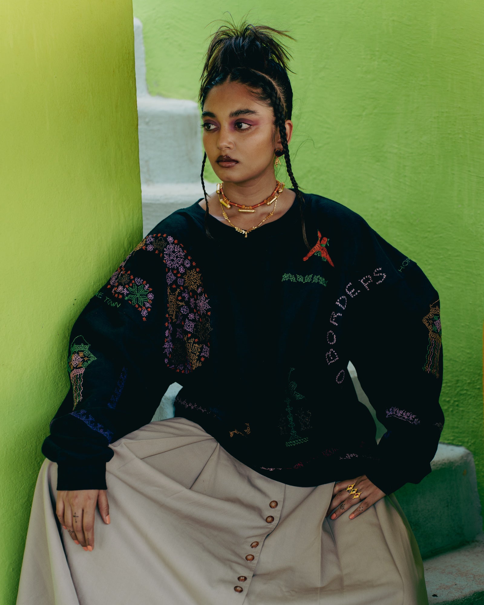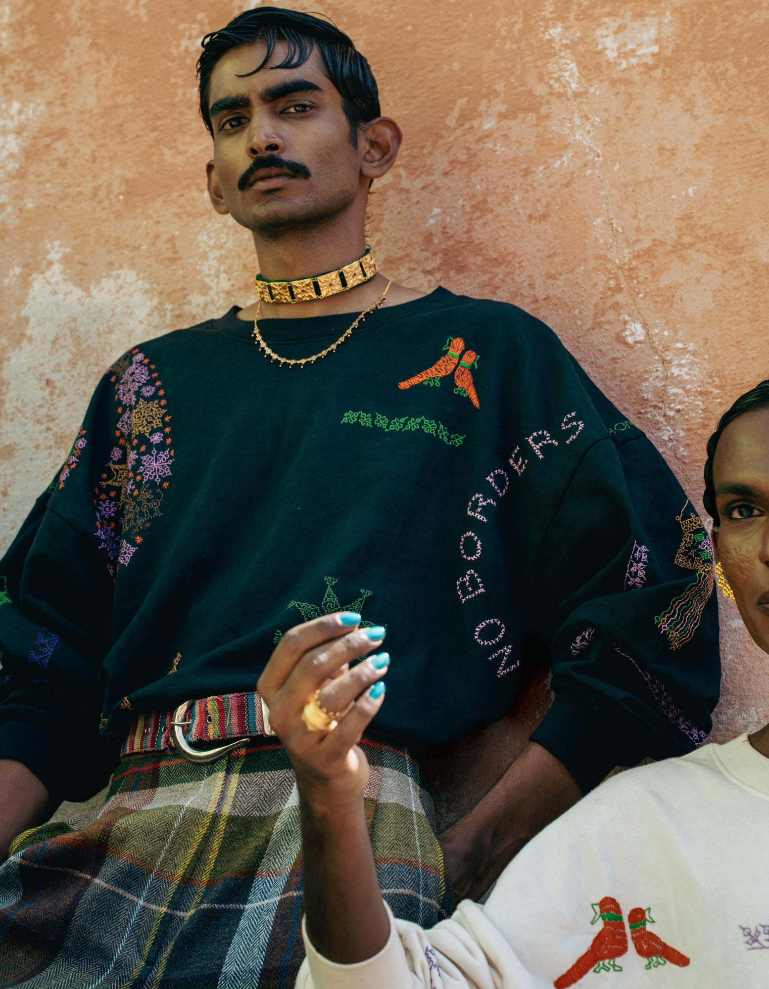 Model is wearing S-M. We styled the Stories of Ancestors black sweatshirt with our most treasured vintage pieces that we have collected through out the world over the last four years. Rupal wearing a Lacrosse plaid pants from the 80's, Kripali wearing it with a vintage midi skirt from the 60's, while Elton paired with with an oversized denim trouser by one of our favourite designers,I am Isigo🧚🏾 Jewels by Ziddi