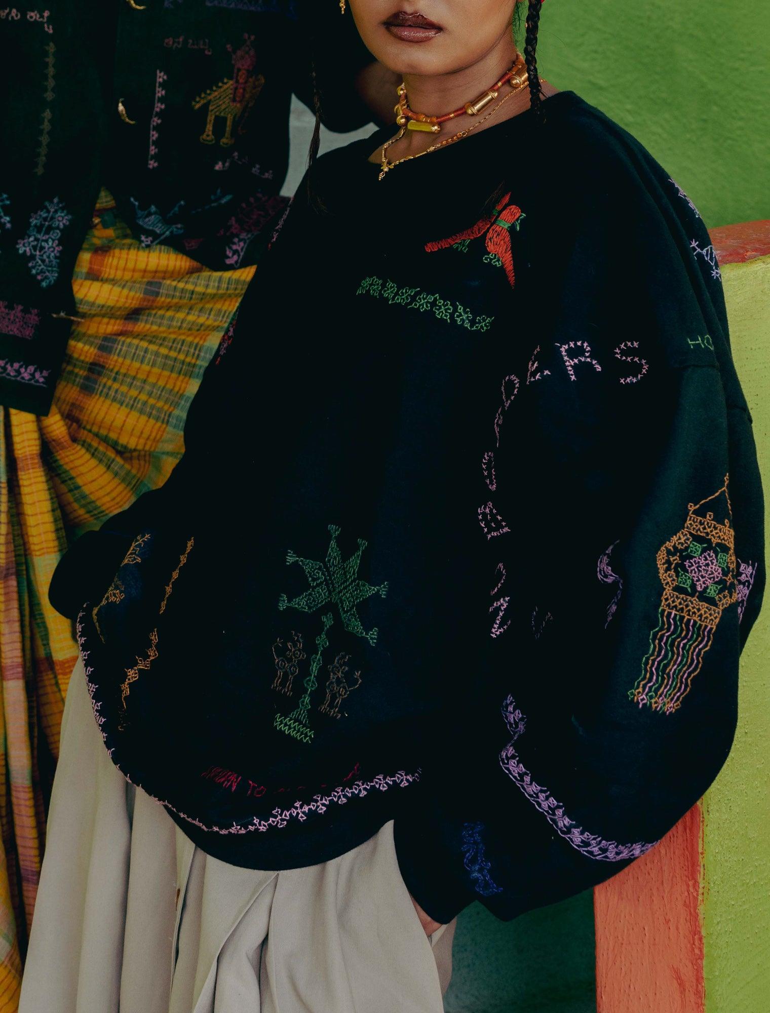 Consciously created oversized sweatshirt with hand embroidered Kasuti motifs that celebrates an ancient art form that dates back to the 6th century native to North Karnataka 🛖🌞