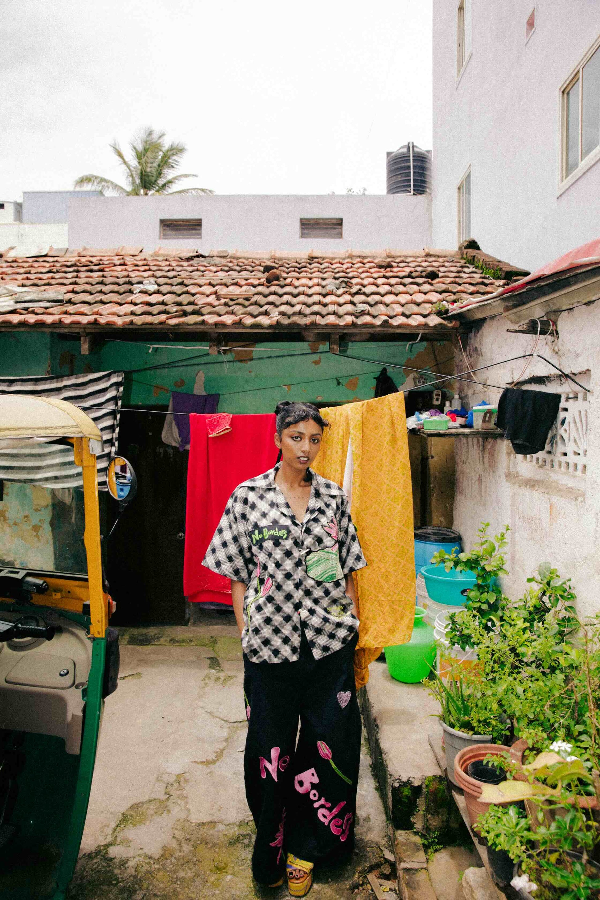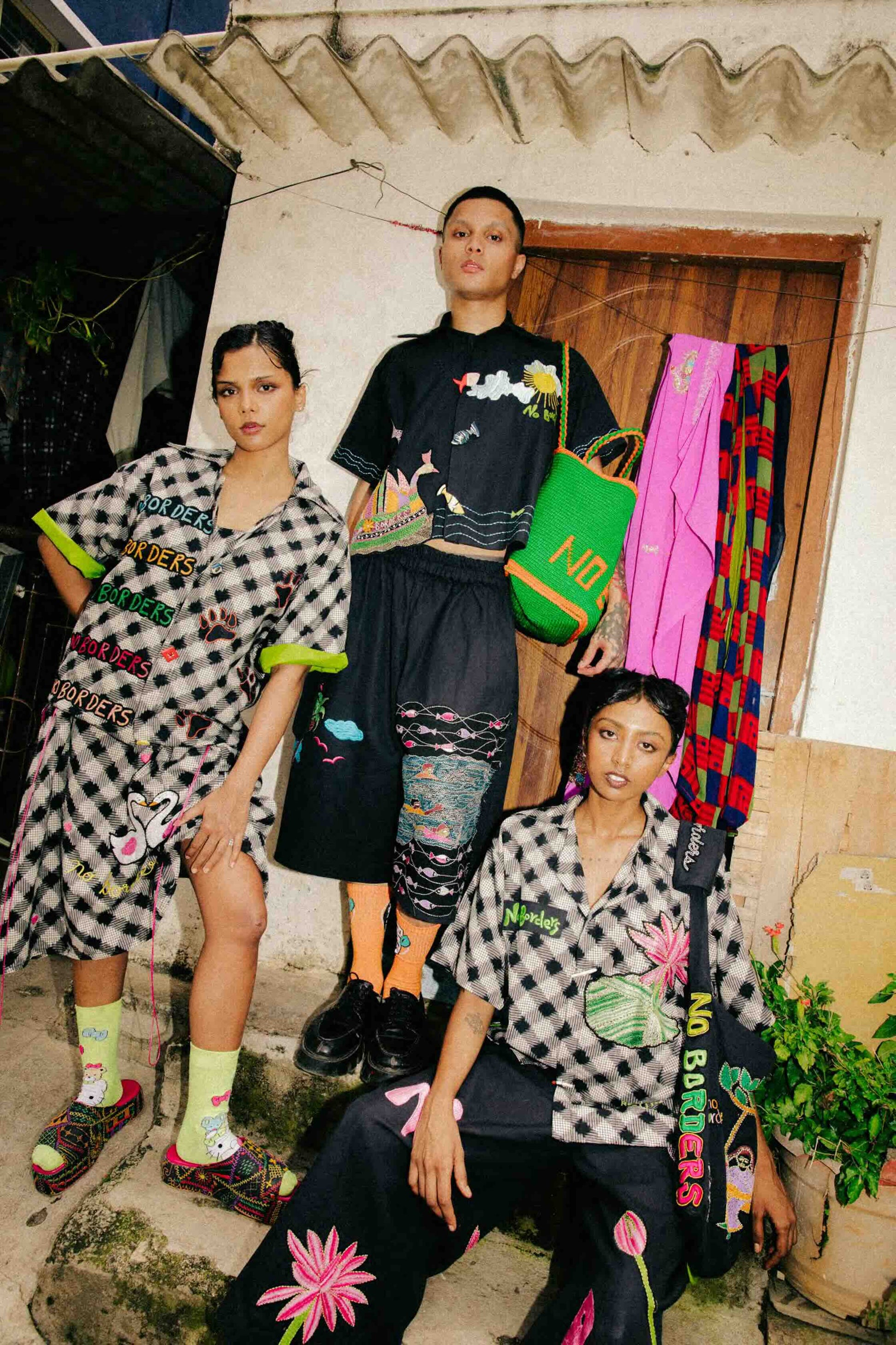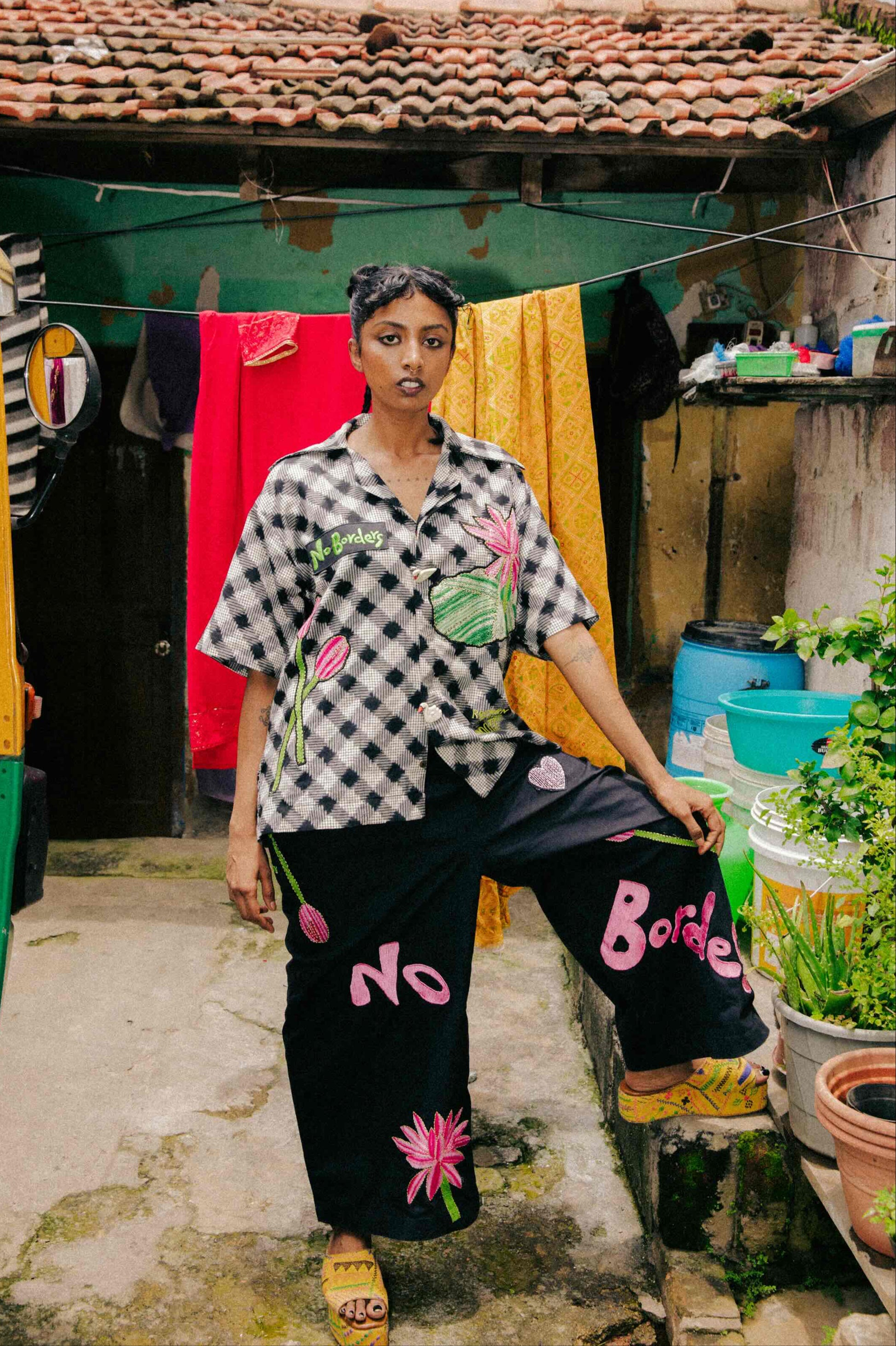 Crafted from 100% cotton canvas, this set features oversized Lily Pants with a relaxed, low-crotch silhouette, drawstring waistband, and semi-circular pockets with lime-green accents. Kantha water lily motifs and No Borders machine embroidery, created in collaboration with West Bengal artisans, blend hand and machine techniques for a statement-ready look. The matching oversized drop-shoulder shirt features a lapel collar, patch pockets, and raised appliqué details, with Kantha water lily embroidery and rooted text accents, reflecting precise in-house tailoring and artisanal craftsmanship.