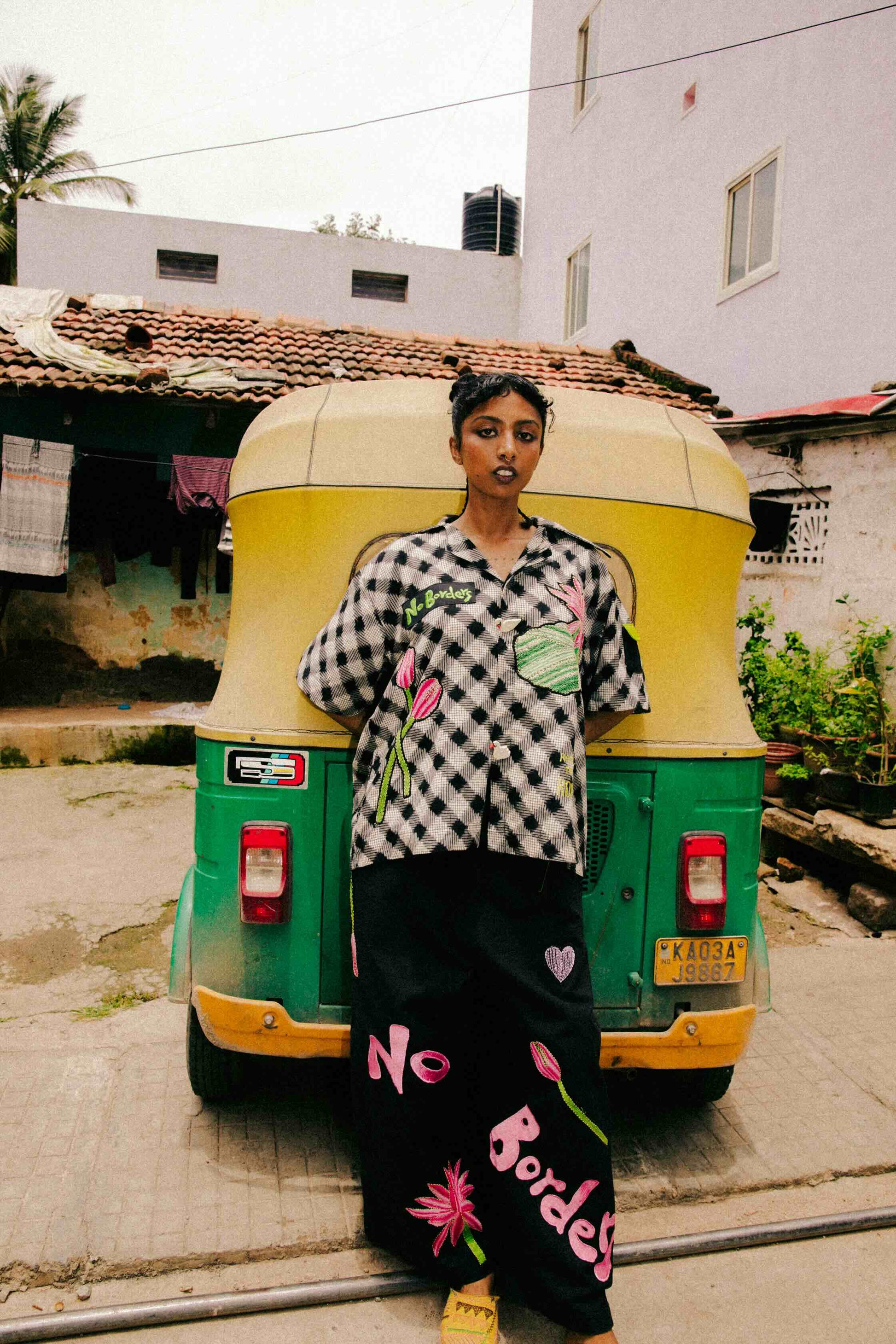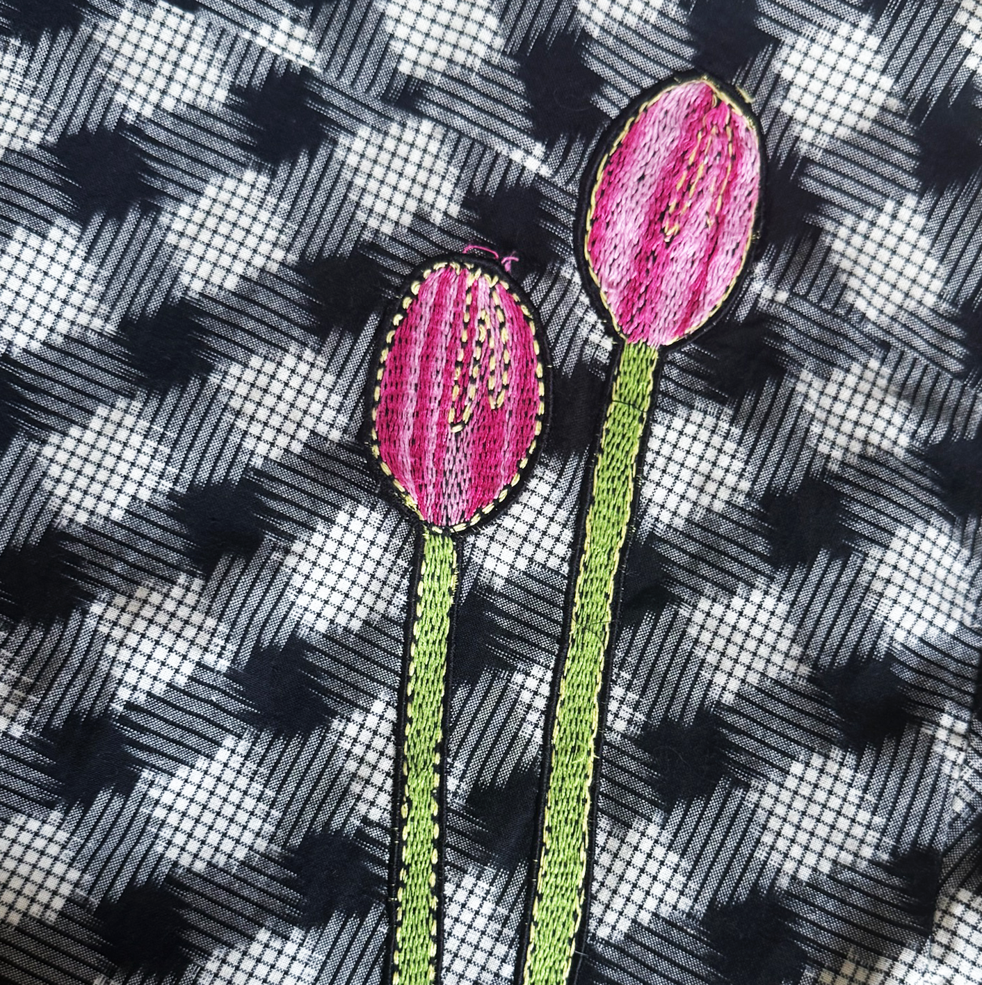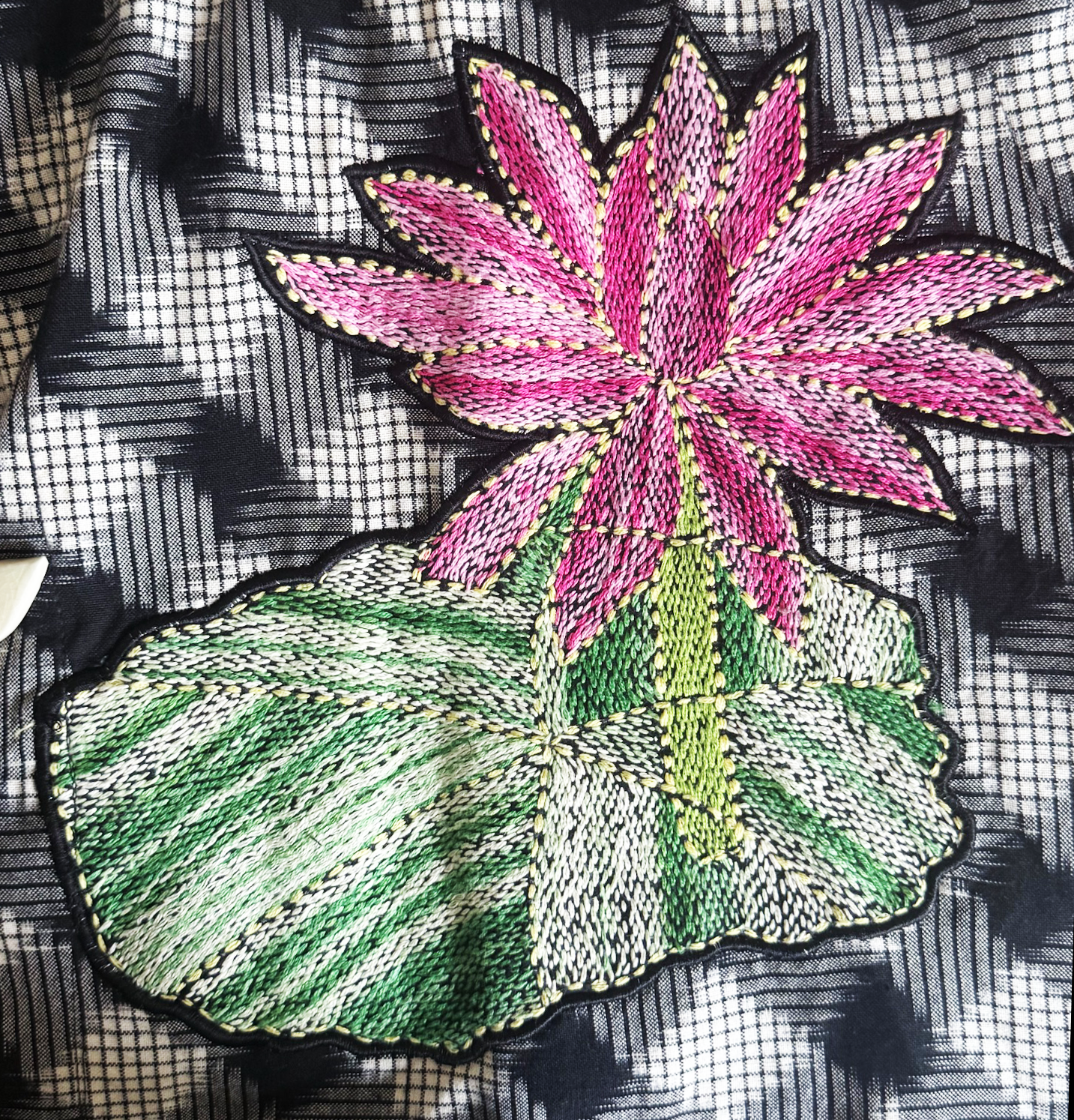 Hand-embroidered Kantha water lily motifs on shirt and pants • Oversized relaxed fit • Playful, artisanal charm • Green patch pocket detail • Machine-embroidered letters • Tie-dye woven Ikat fabric • Cotton canvas fabric • Artisan-made in West Bengal
