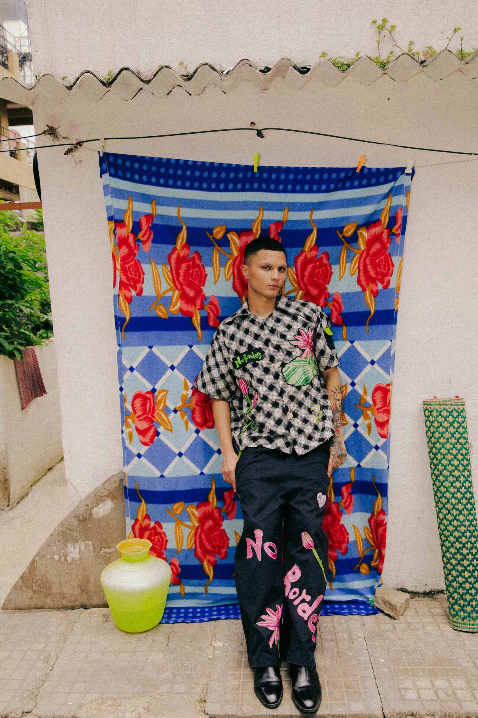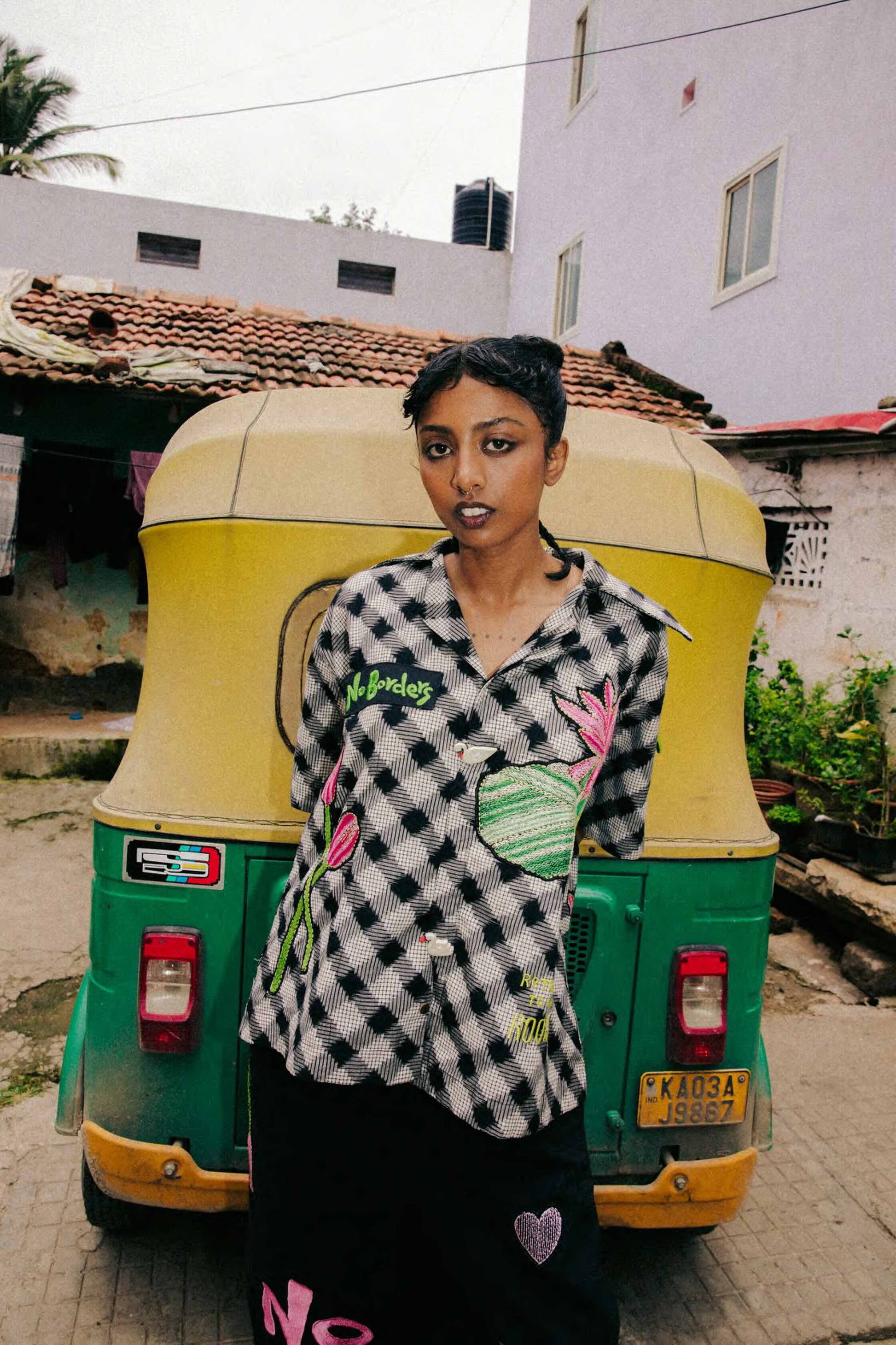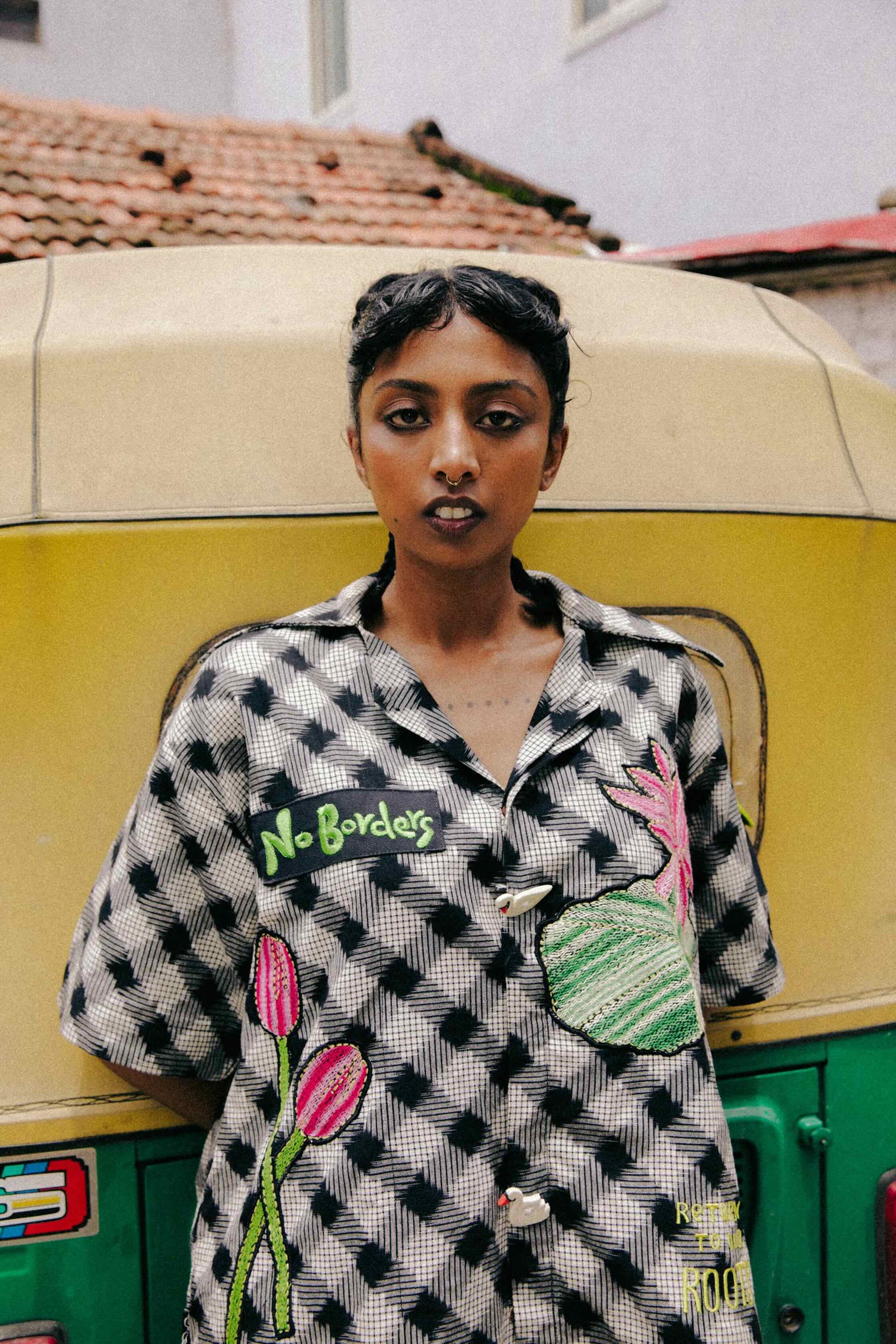 Hand-embroidered Kantha water lily motifs on shirt and pants • Oversized relaxed fit • Playful, artisanal charm • Green patch pocket detail • Machine-embroidered letters • Tie-dye woven Ikat fabric • Cotton canvas fabric • Artisan-made in West Bengal