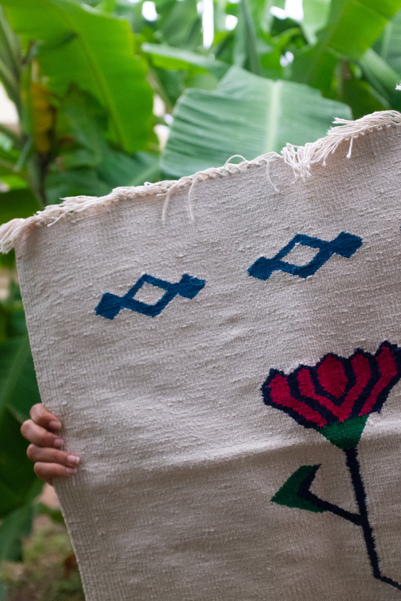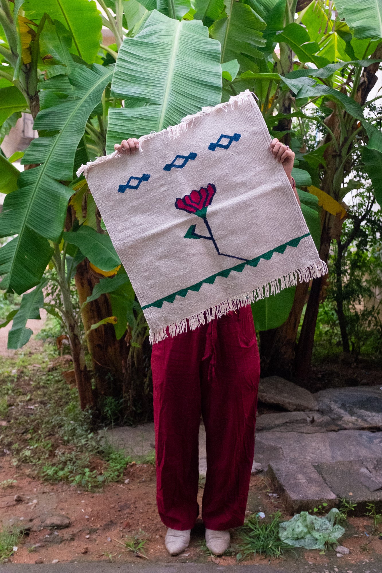 We met with the ladies in Navalgund that make these dhurries and in a quick exchange of though and ideas, we asked them to make a Dhurrie of lotus and they had it made and sent to us the very next week