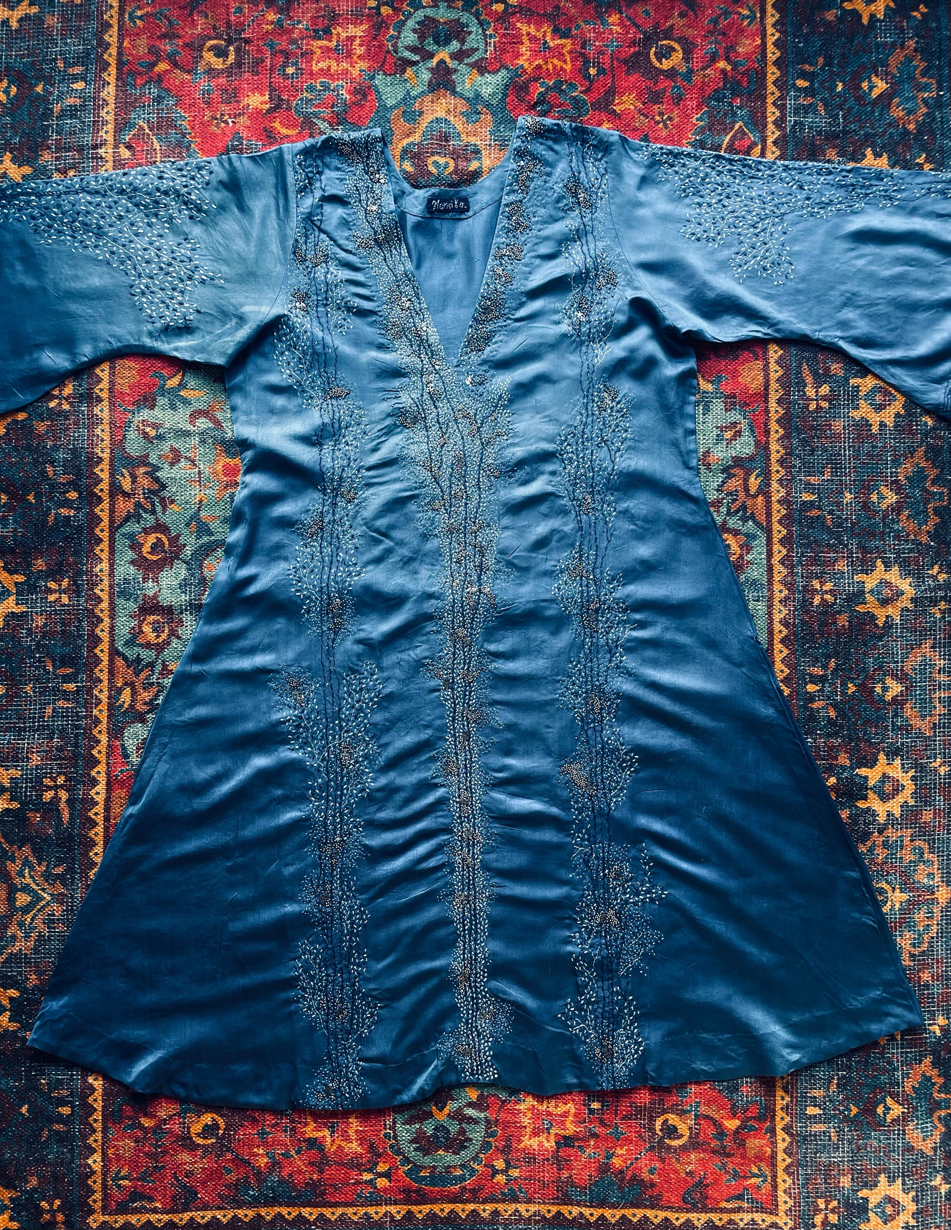 free-size kaftan crafted from handwoven and hand-dyed satin silk.