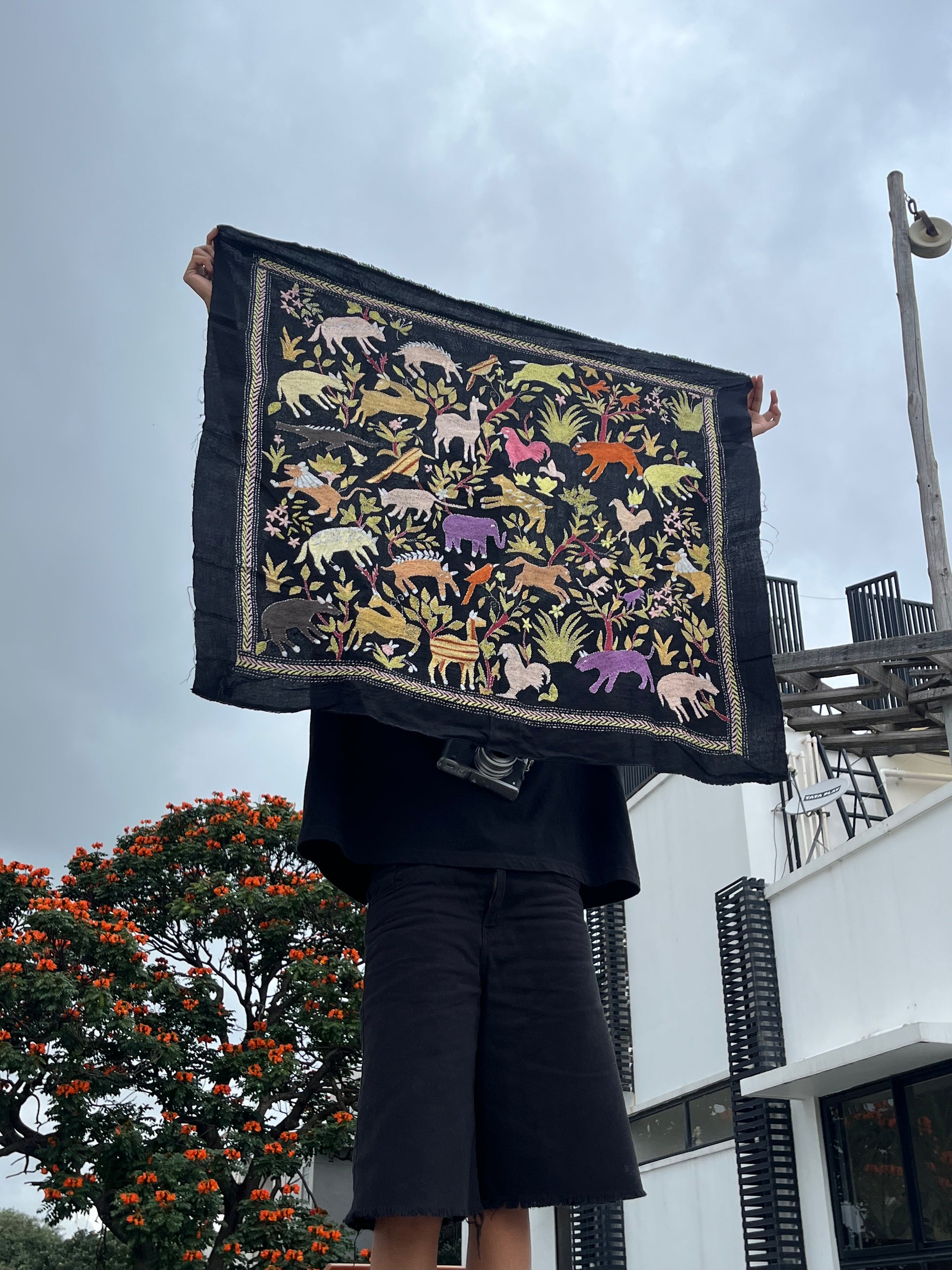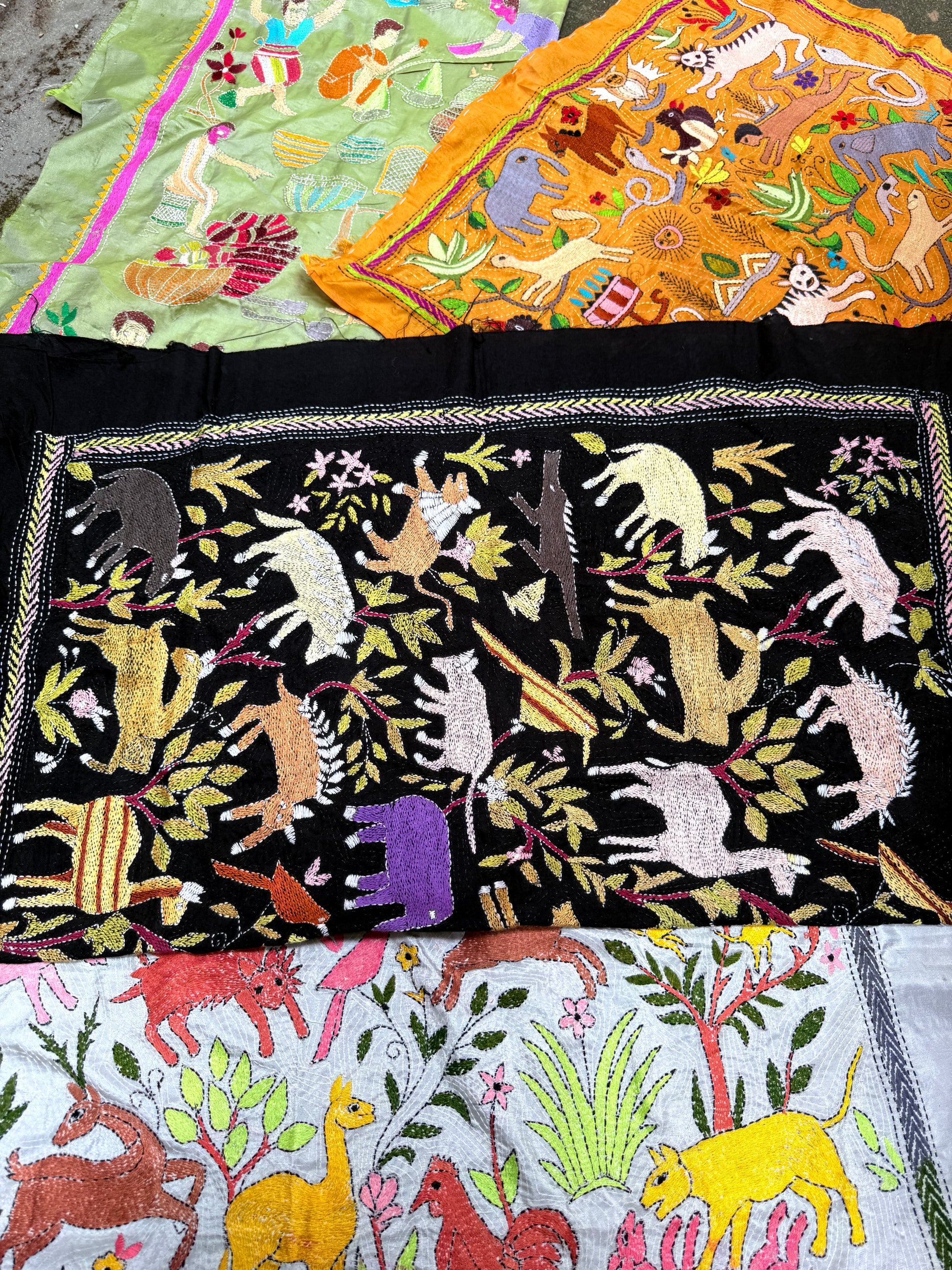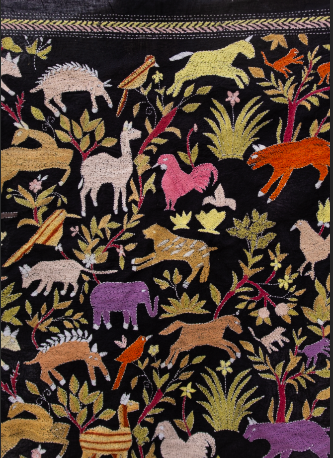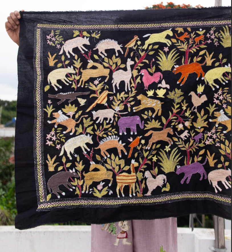 This Kantha tapestry scarf is handembroidered by Ajija from West Bengal, who continues a tradition where women embroidered old cloth with dreams, myths, and daily life.