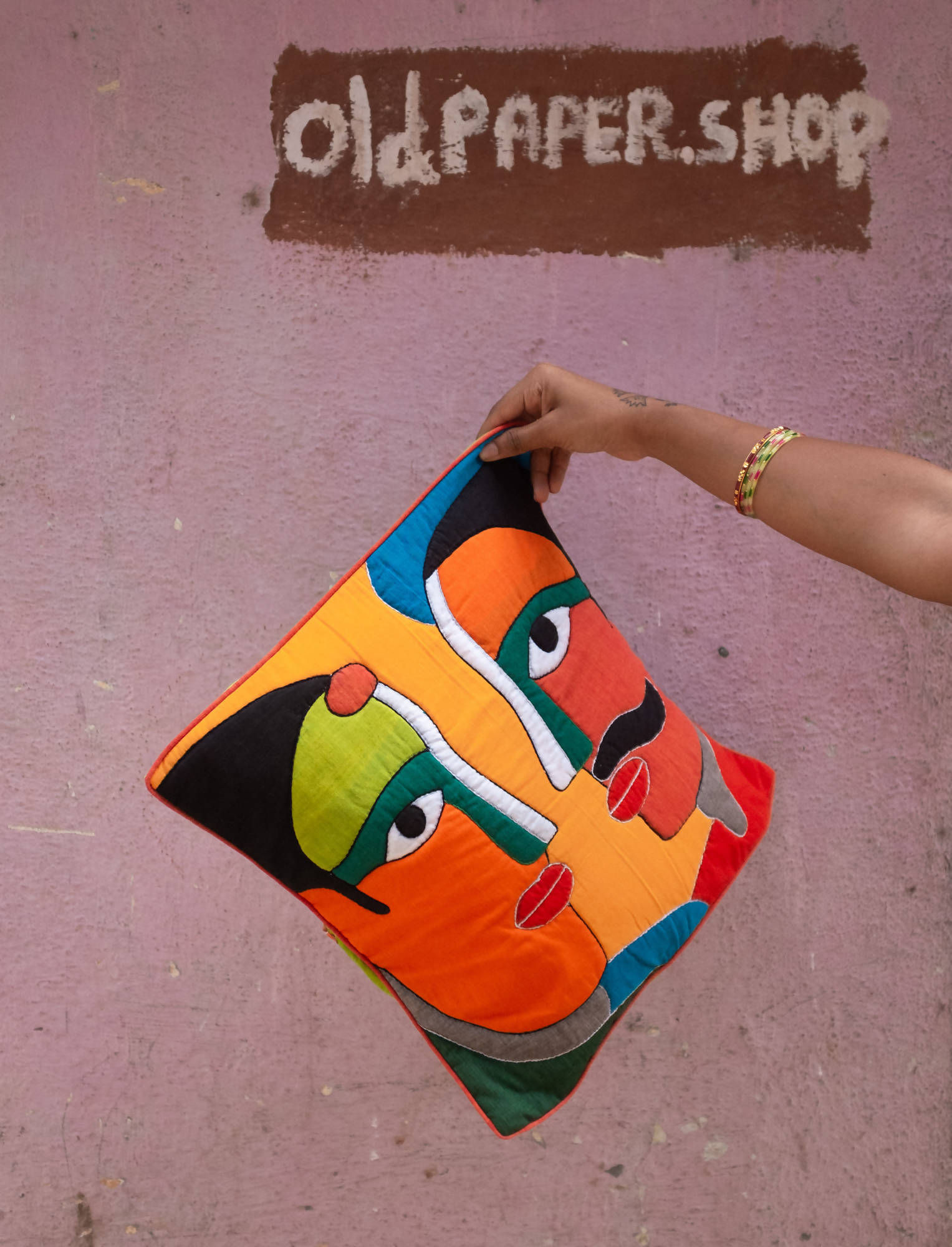 Cotton cushion with a multicolor male & female face pattern embroidered with applique and sujini technique.
