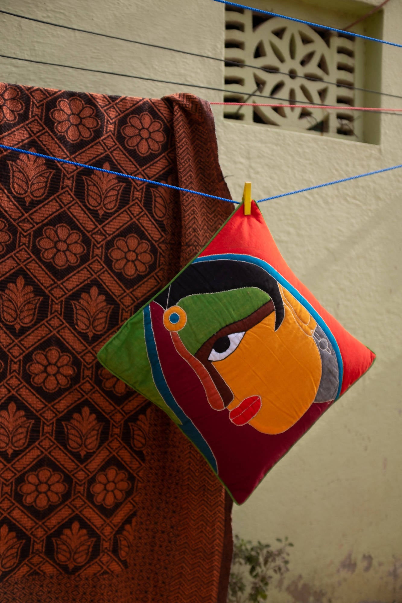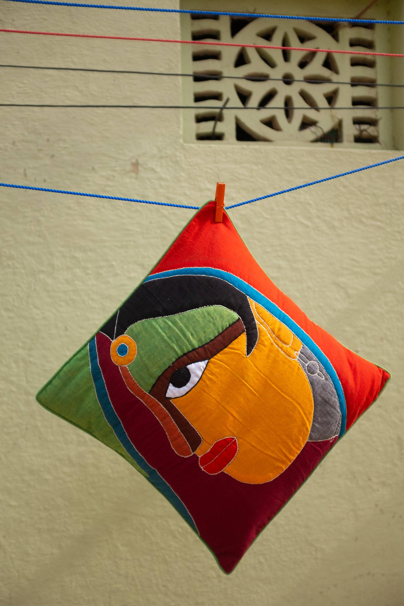 Cotton cushion with a multicolor female face pattern embroidered with applique and sujini technique.