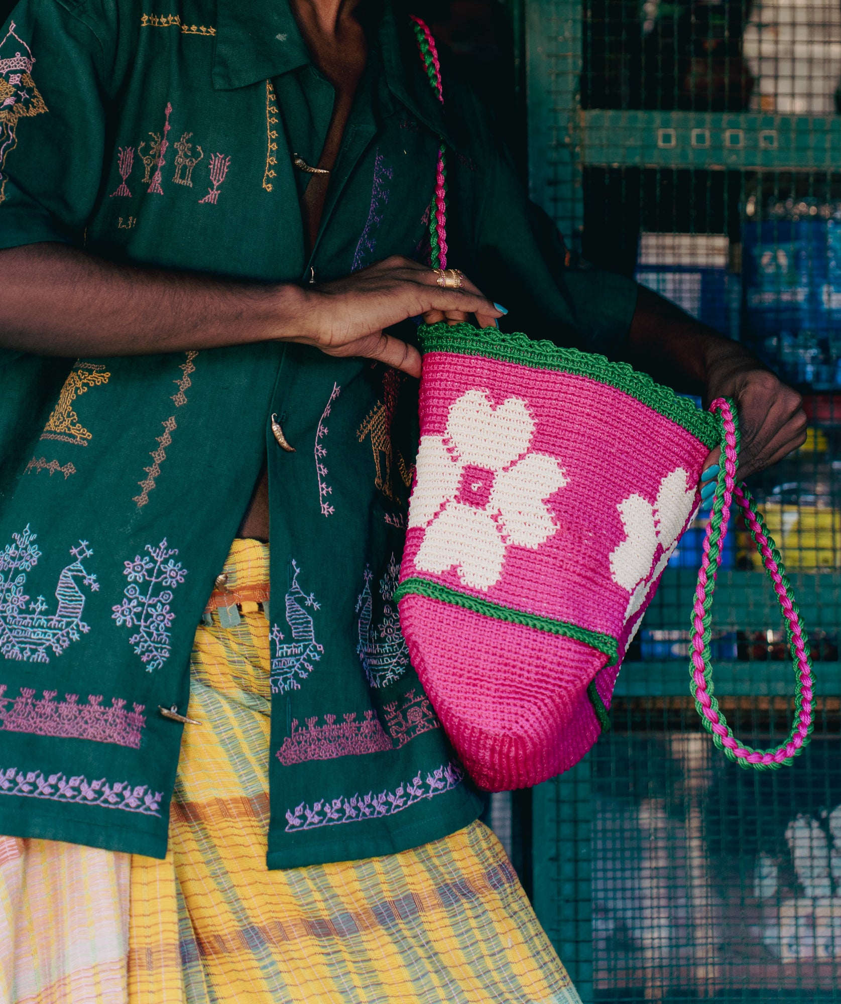 These crochet bags have been a staple piece of carrier in every household through South India, and especially seen carried by farmers, villagers, workers, sellers and other rural men & women 🥀 The bags are so popular among the workers because of its multi-purpose feature, its sturdiness, durability, and easy wash & care🌼 The technique of making these bags has been passed down generations and continues to be used by all age groups in the family 🌺 Needless to say, the bright colours and the beautiful patterns on these bags, made it irresistible for us to not share it with our global community 🧚🏾♀️💕