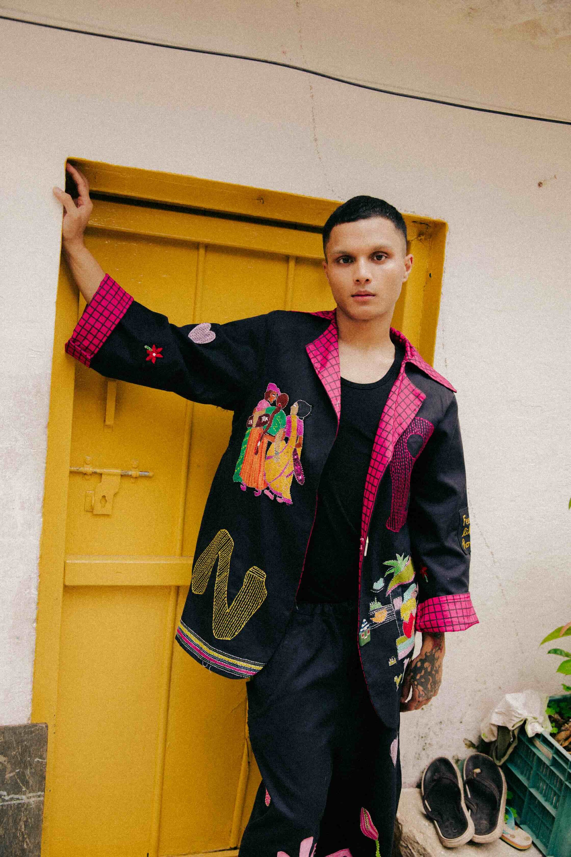 Crafted in 100% canvas cotton , this jacket features exaggerated collars, fuschia pink checkered mul cotton lining and has a clean structured fit. Adorned with a custom NB Kantha motifs on the front and a Bengal village collage on the back hand-embroidered in Kantha by artisans of West Bengal, it is finished with machine embroidery detailing of kantha inspired motifs and precise in-house tailoring that merges craft with contemporary streetwear.