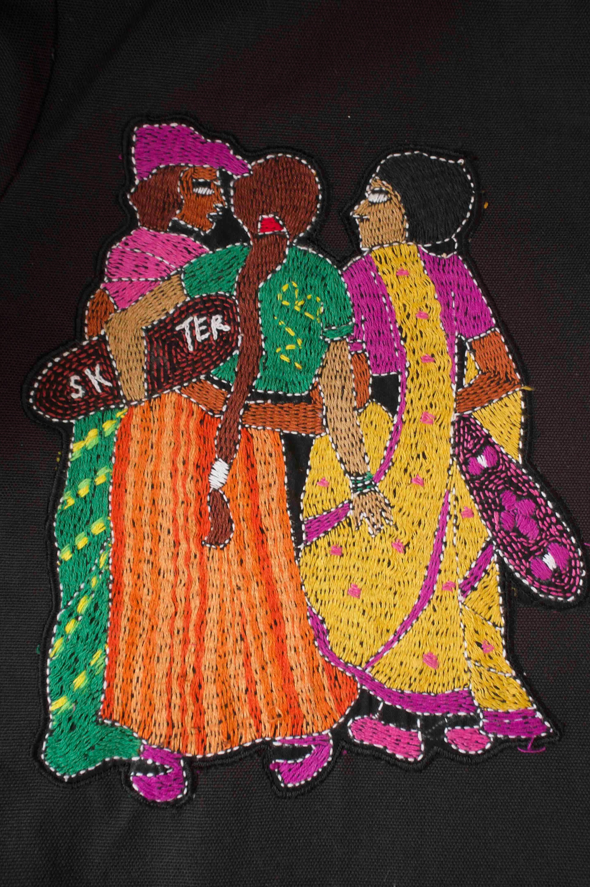 Kantha collage of love, friendship, and fearless women in everyday moments • Oversized, structured fit • Playful, artisanal charm • Mul cotton lining • Machine-embroidered letters • Handcrafted in West Bengal