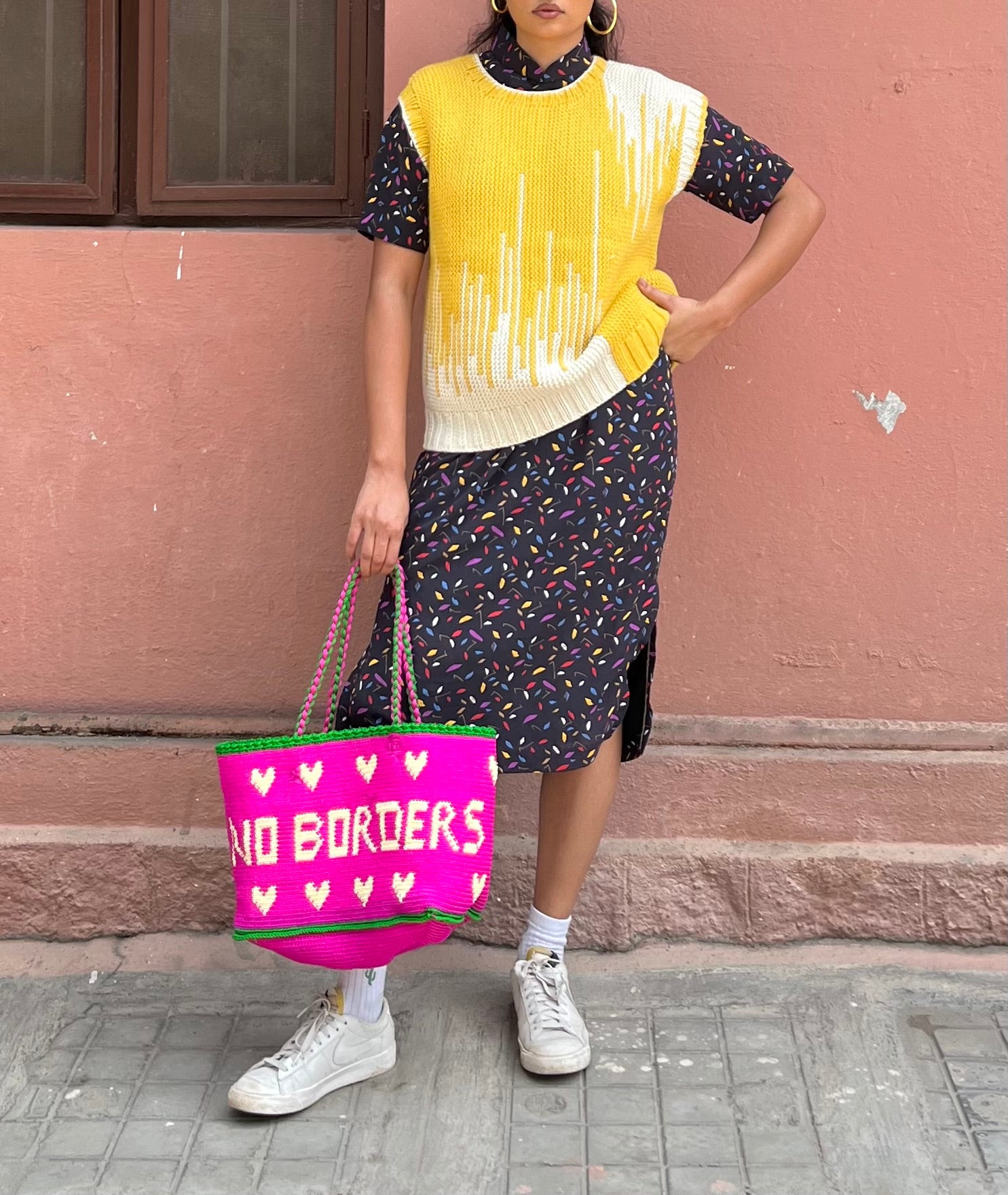 These bags have been made using locally sourced plastic crochet wires in Navalgund by the women, and can be recycled or reused 🌼 The plastic was a deliberate choice for these bags to enhance its strength, its life and sustain through everyday usage or harsh weathers. Although these bags last a lifetime, they do tend to naturally fade in colour, if not cared for, over a long span of time, from natural abrasion and weather conditions. We recommend avoiding the rains, or exposing the bag to harsh sunlight and storing the bag in a cool, dry place to keep its vibrancy everlasting ✨🧚🏾♀️Size - Medium