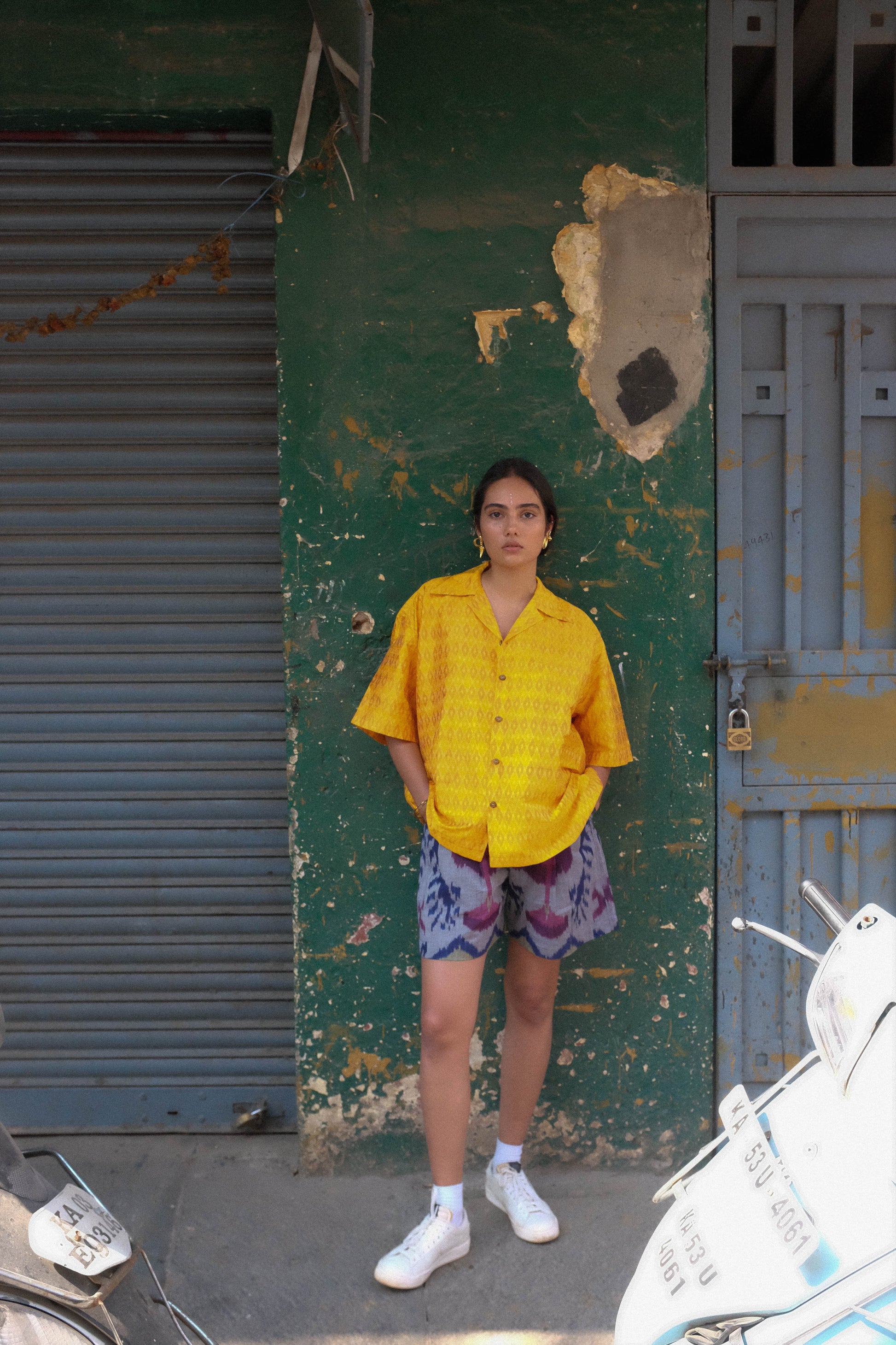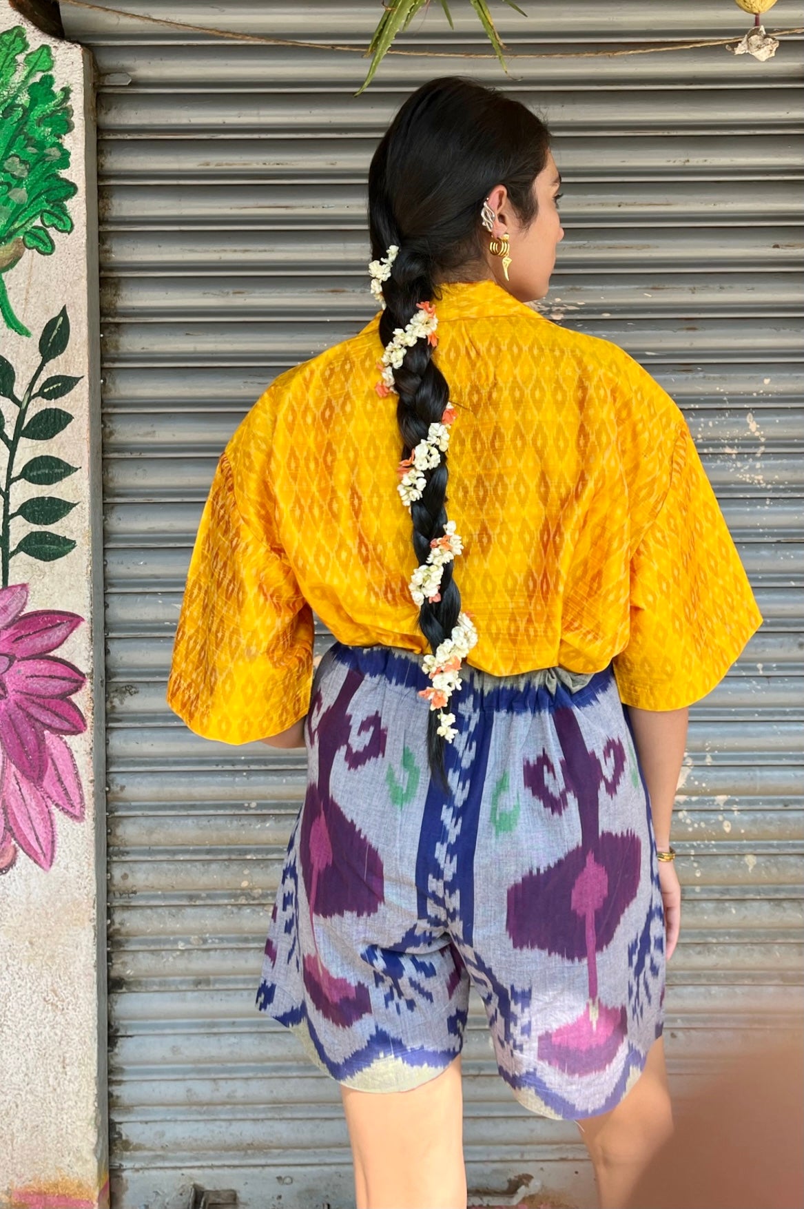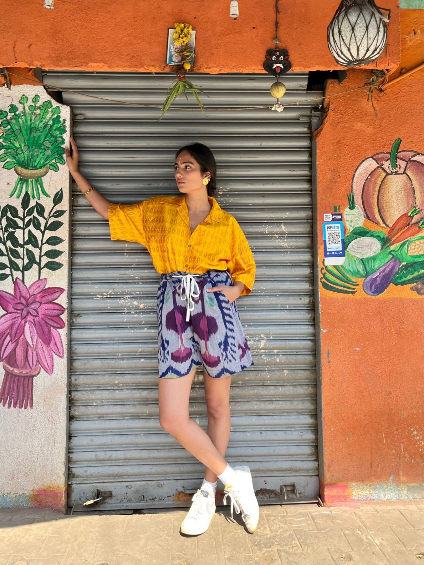 Blue Ikat Sizeless Shorts for this summer season that is about to kick off. It can fit all sizes from extra small through large with a mechanism and pattern that we have developed. Have the summer of your life and drift off into the sunset knowing you are supporting the artisans in Telangana. Super light and airy, but a statement nonetheless! It’s oversized, boxy, and unisex; hand woven and dyed with love by artisans in the state of Telangana. It pairs beautifully with our Ikat shirts, creating a dance of patterns.