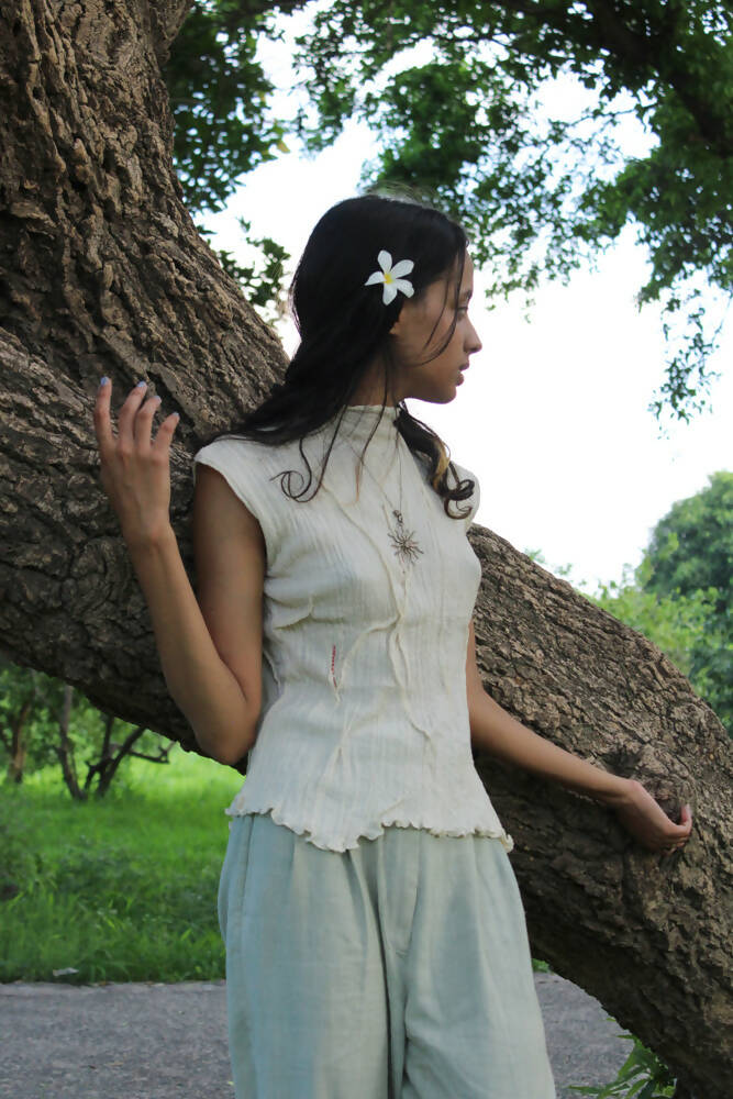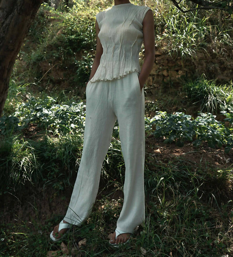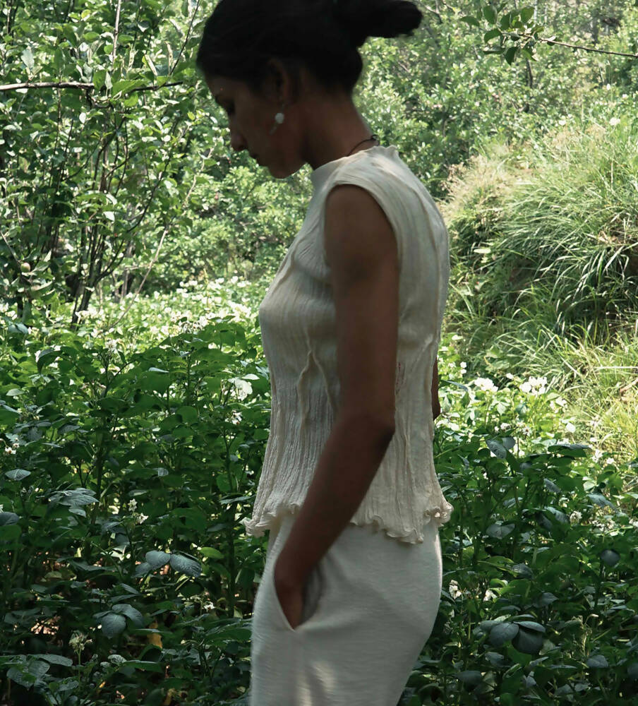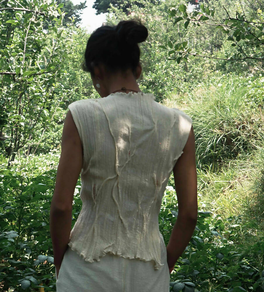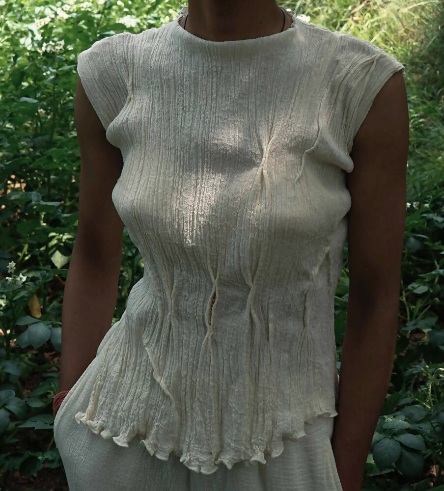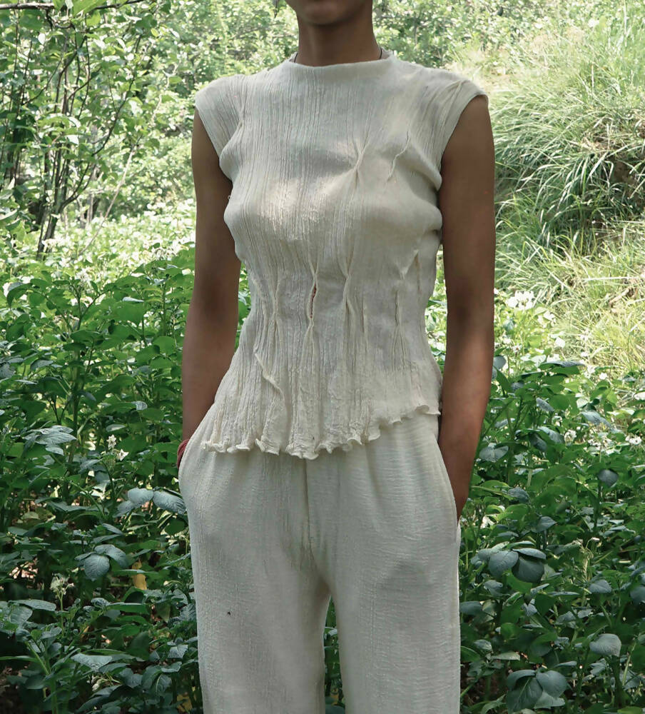 ‘Riptide’ is made in unbleached organic cotton, without the use of any chemicals or additive colour. Tiny hand stitches hold the wrinkles of the cotton, giving it an unusual texture.