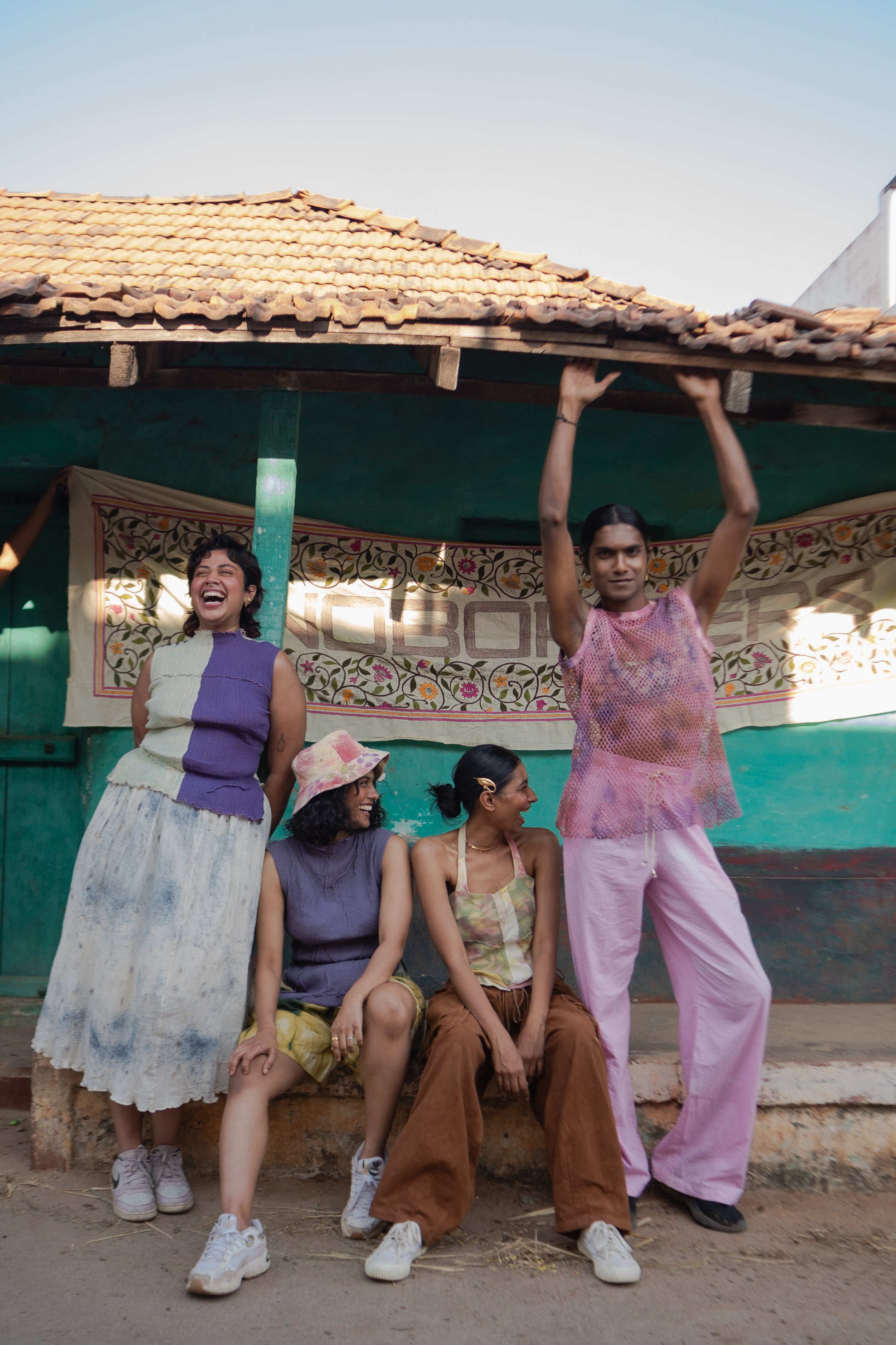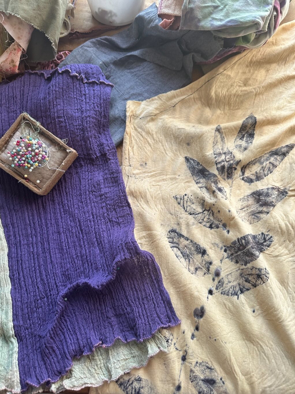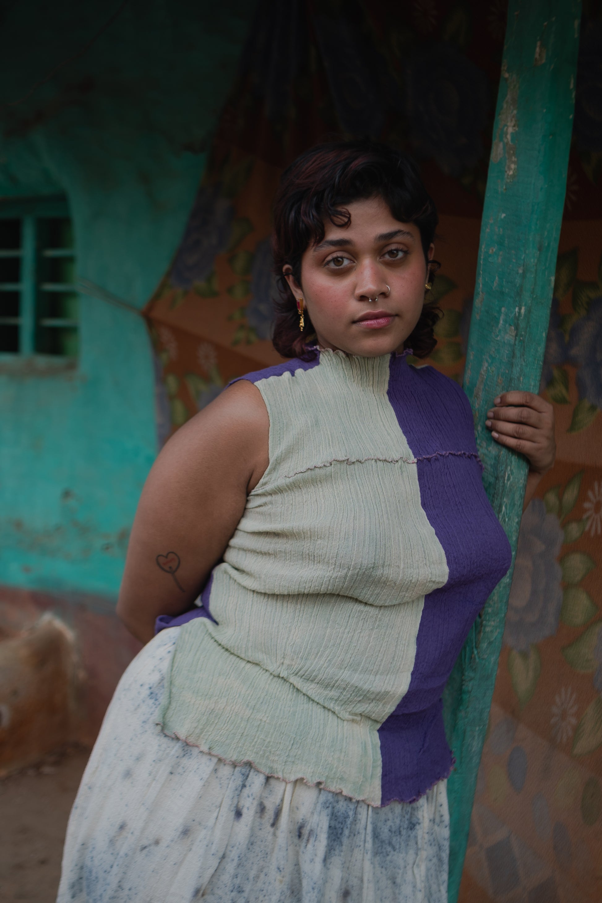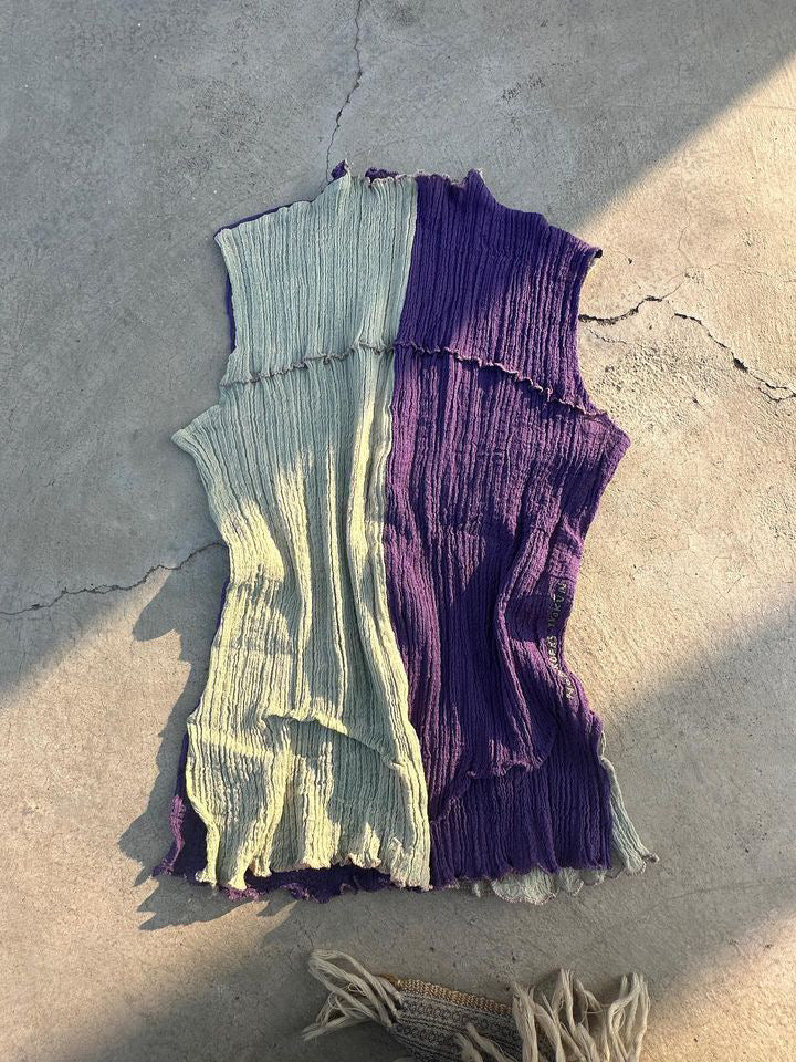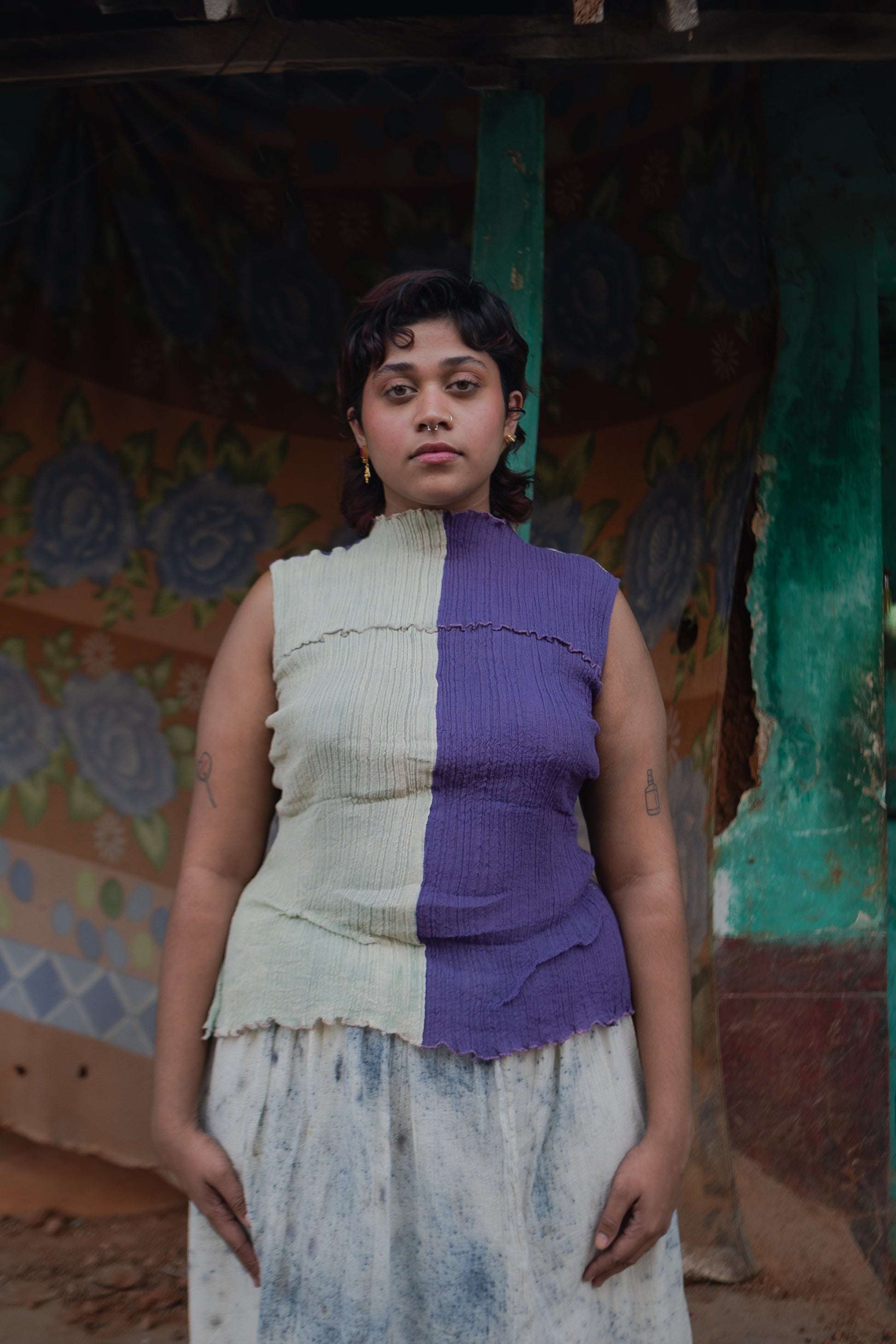 Dual tone, stretchy top dyed with fresh leaves of indigo and sappanwood, mordanted using mineral extracts for achieving the brightest hues.