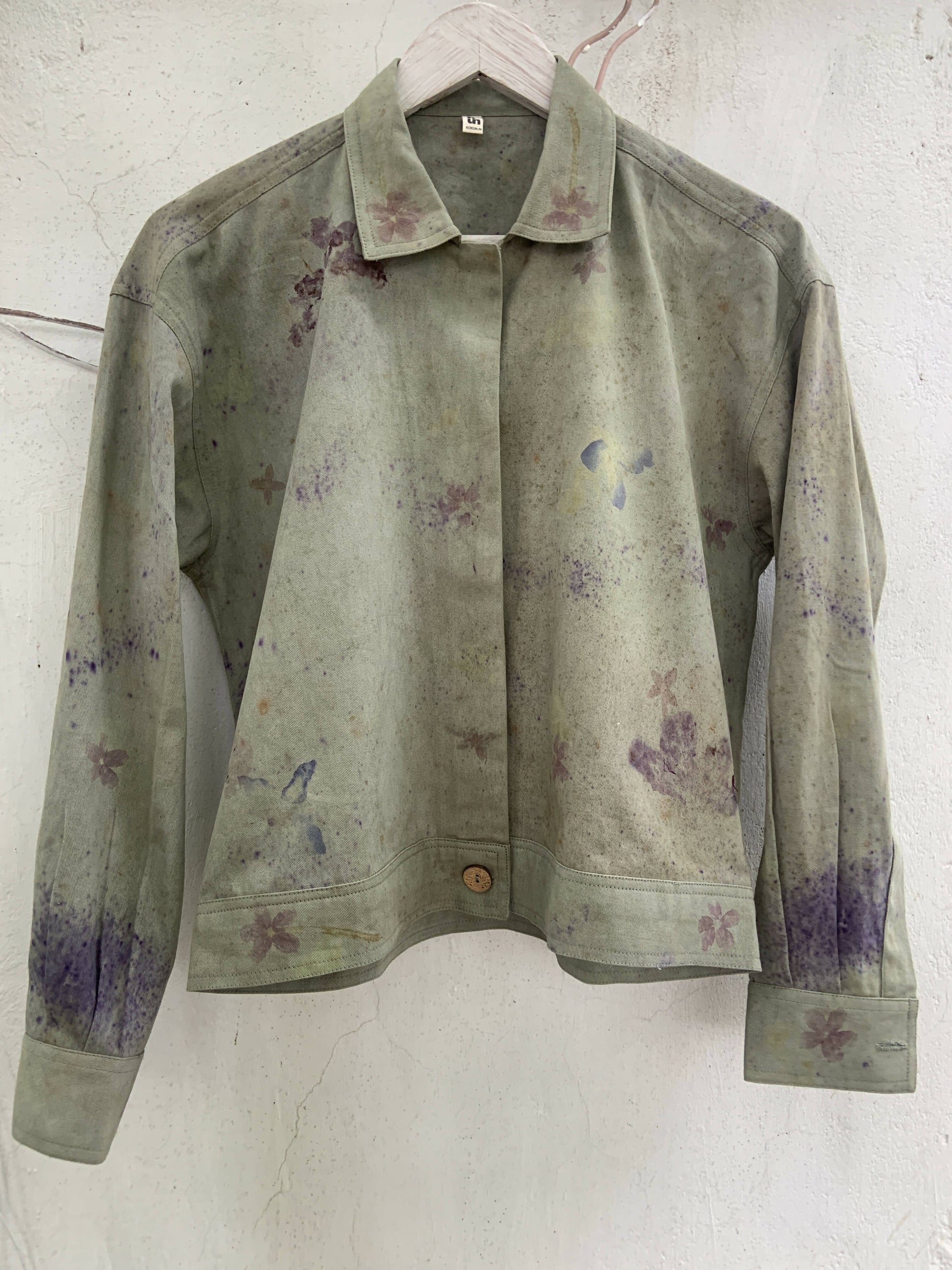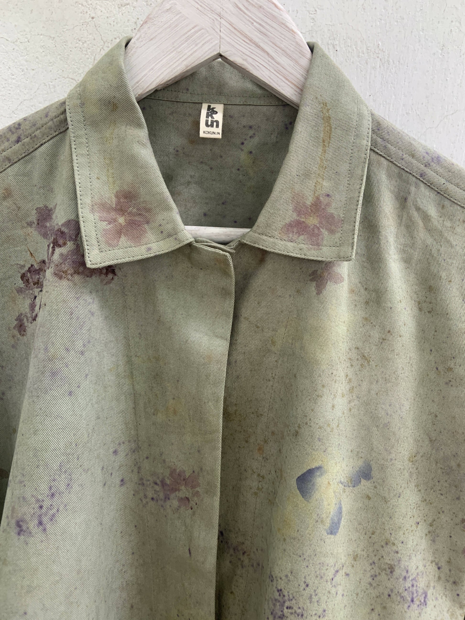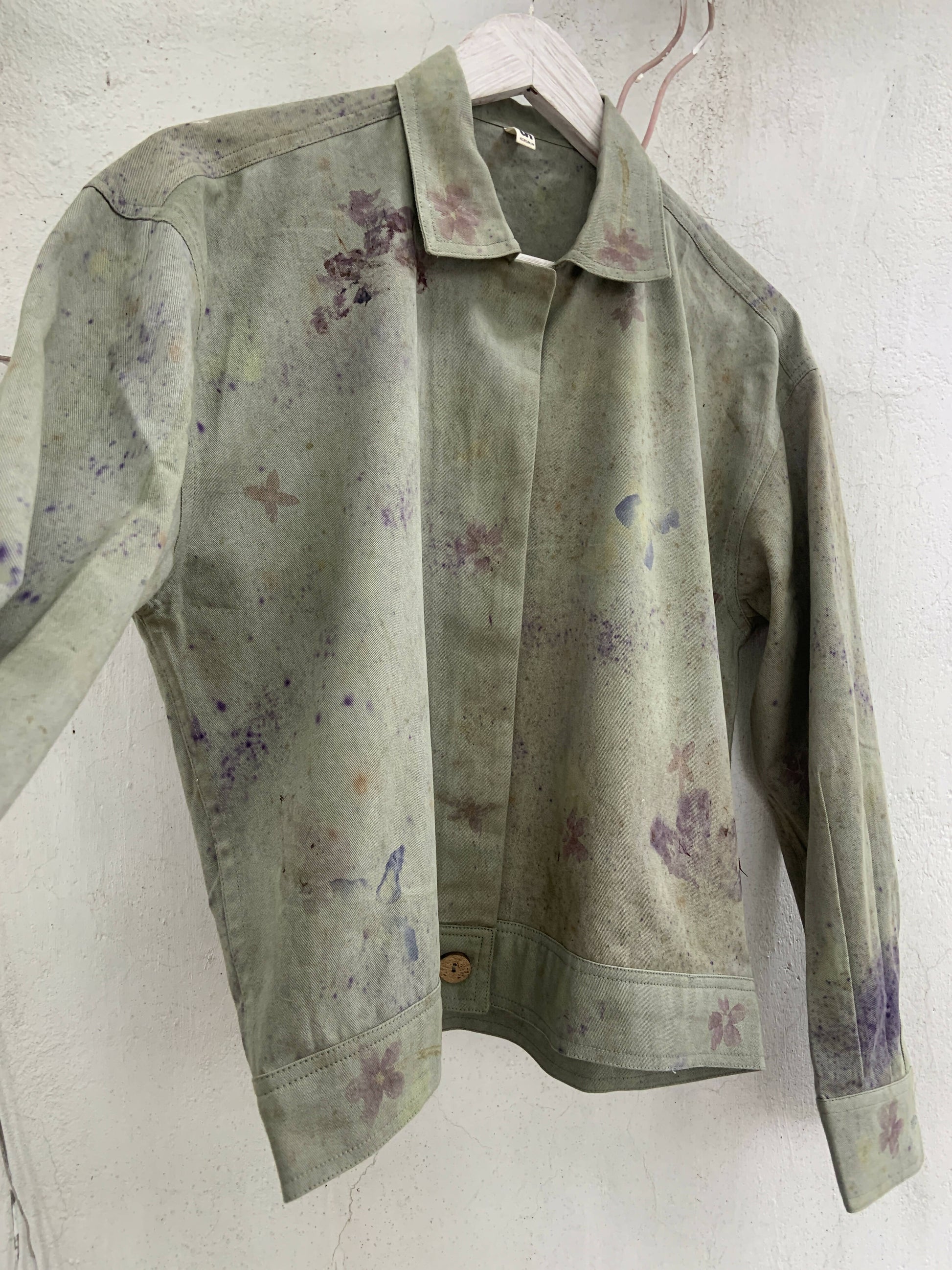 Vintage-inspired denim jacket, hand dyed using native Indian flowers from our garden and other plant extracts like hibiscus, pomegranate, and logwood.