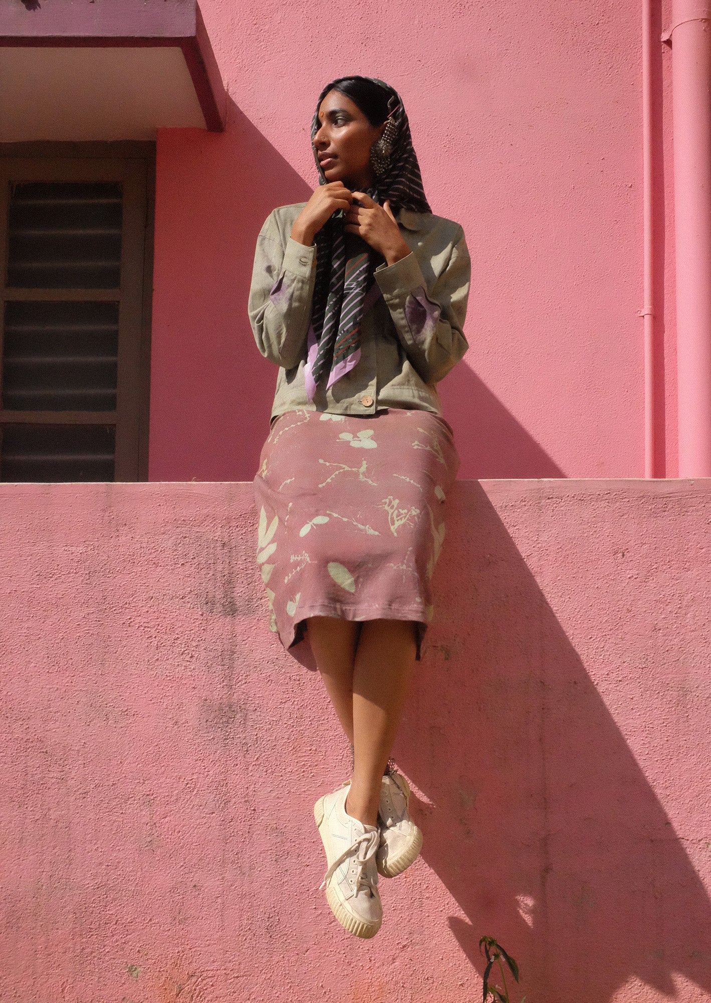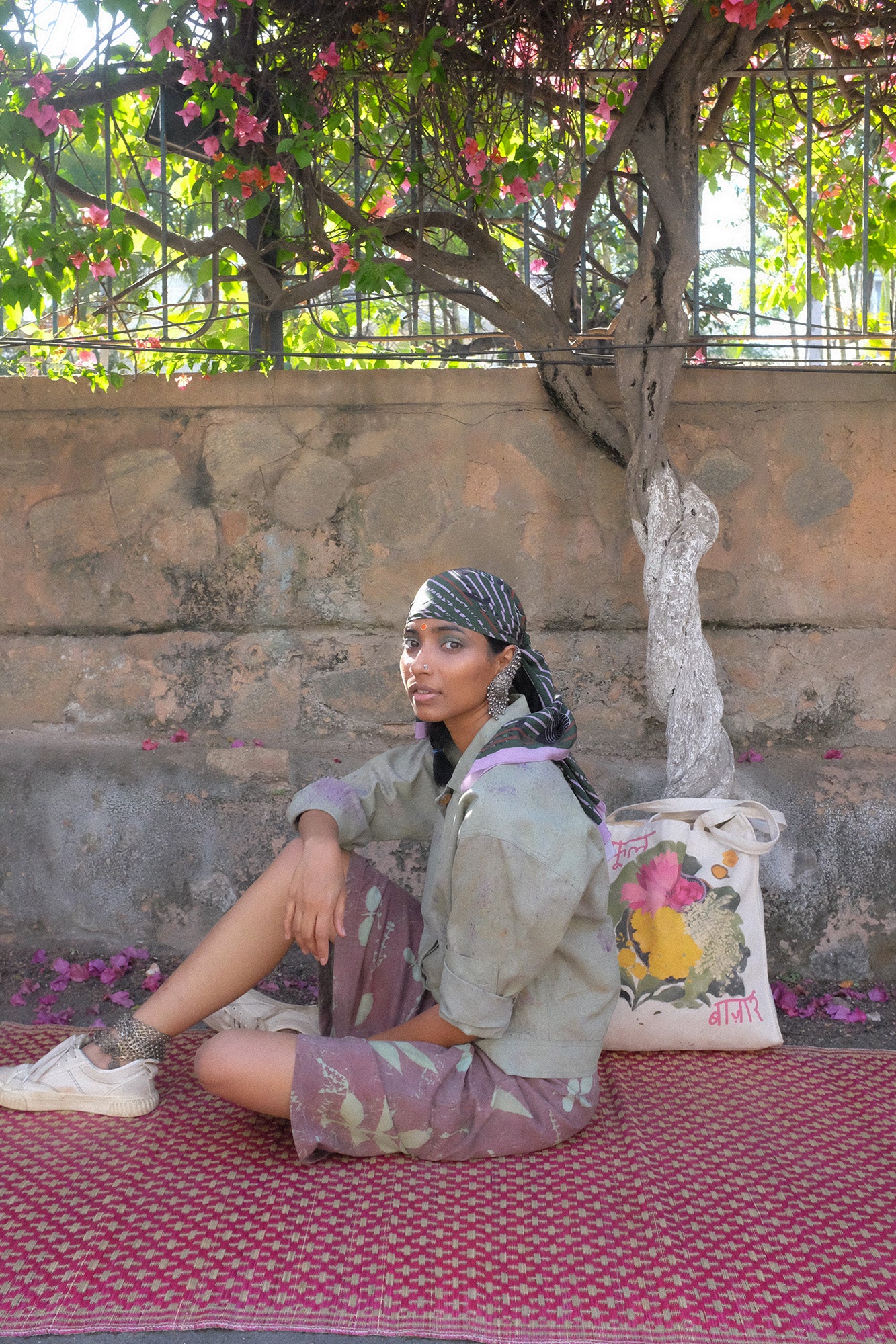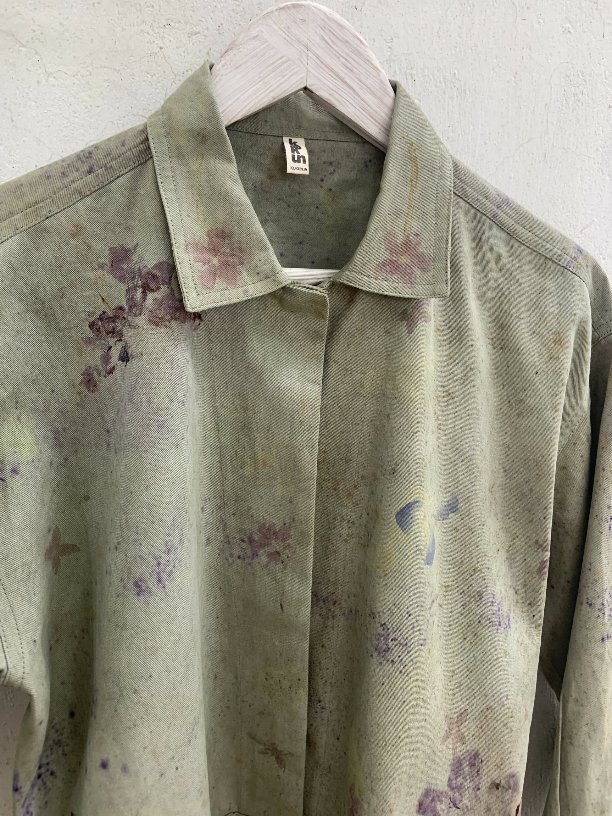 Vintage-inspired denim jacket, hand dyed using native Indian flowers from our garden and other plant extracts like hibiscus, pomegranate, and logwood.