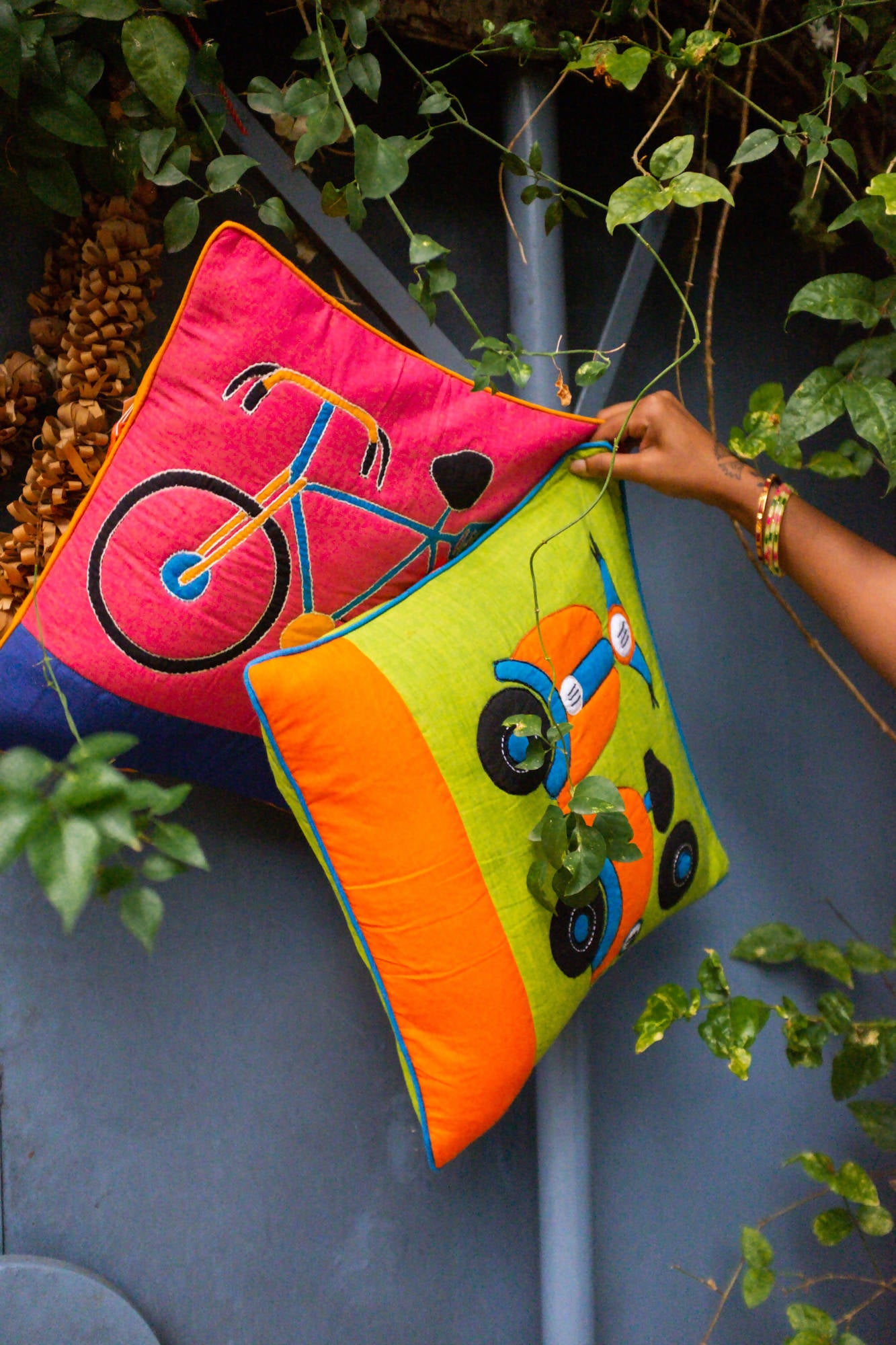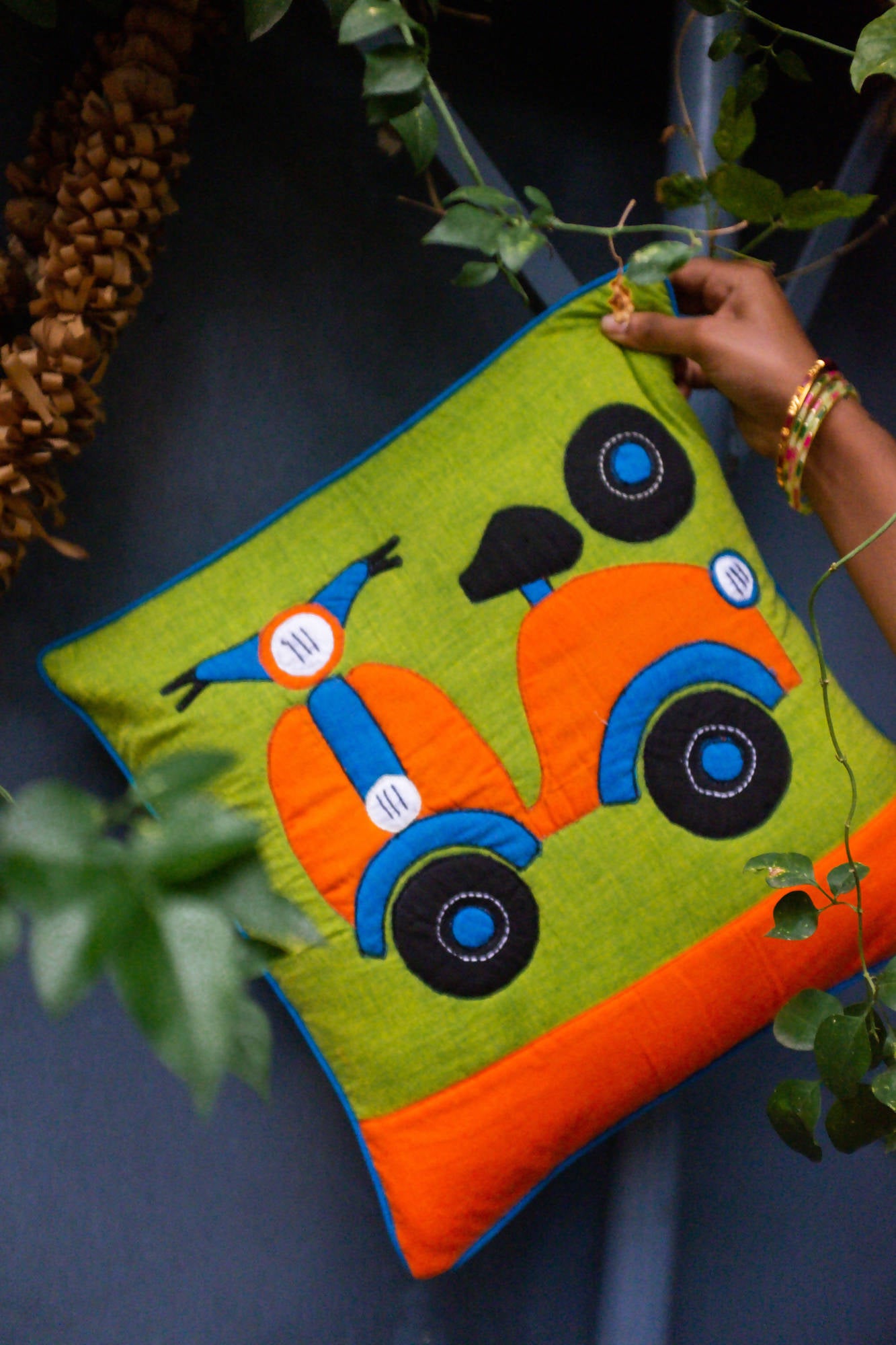 Cotton cushion with a multicolor scooter pattern embroidered with applique and sujini technique.